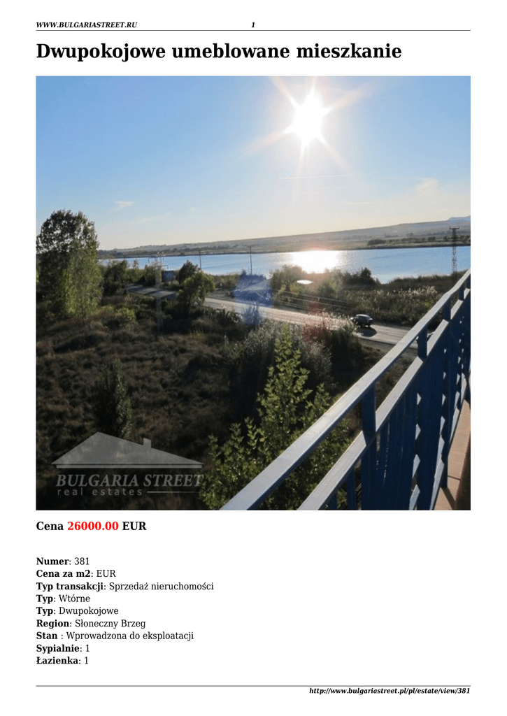 WWW.BULGARIASTREET.RU 1 Dwupokojowe umeblowane mieszkanie Cena 26000.00 EUR Numer: 381 Cena za m2: EUR Typ transakcji: Sprzedaż nieruchomości Typ: Wtórne Typ: Dwupokojowe Region: Słoneczny Brzeg Stan : Wprowadzona do eksploatacji Sypialnie: 1 Łazienka: 1 http://www.bulgariastreet.pl/pl/estate/view/381 WWW.BULGARIASTREET.RU 2 Charakterystyka nieruchomości Niewielki nowy kompleks Сани Działaj, który jest rozmieszczony ogółem do 400 m od morza, ze swoim prywatnym terenem, basenem, parkowaniem proponuje meblowane dwupokojowe mieszkanie, rozmieszczone na piątej kondygnacji kompleksu 400 m od morza w kurorcie Słoneczny Brzeg. Charakterystyka mieszkania: Mieszkanie składa się z: przedpokoju, sypialni, gościnnego pokoju, kąpielowego pokoju z węzłem sanitarnym i tarasu. Rejon z rozwiniętą infrastrukturą jest całe konieczne dla komfortowego odpoczynku - sklepy, supermarket, poliklinika, bankomaty, poczta, zatrzymania się miejskiego i międzymiastowego transportu. Infrastruktura ● ● ● ● ● ● ● ● ● Ochrona Internet Telewizja kablowa Basen odkryty Recepcja Elektrczność Woda Okna PVC Meble Informacje o regionie Największy kurort bułgarskiego czarnomorskiego nadbrzeża - Słoneczny Brzeg, rozmieszczony w zatoce między prastarym miastem Nesebar a Świętym Własem. Międzynarodowy port lotniczy m. Burgas znajduje się na odległości 35 km, a port lotniczy Warny - 95 km Klimat Słoneczny brzeg różni się sprzyjającym śródziemnomorskim klimatem. Lato jest słoneczne i gorące, średnia temperatura w lipcu składa 22-23 stopni Celsjusza. Średnia temperatura morskiej wody - 2026 stopni Celsjusza. W okres z maja miesiąca po października włącznie ilość słonecznych godzin istnieje więcej 1700. Słonecznemu brzegowi jest nadany Błękitny sztandar - międzynarodowa nagroda, która potwierdza, że woda i plaże odpowiadają najwyższym standardom i przydatne dla bezpiecznej kąpieli i odpoczynku. Plaże Słoneczny Brzeg ma w rozporządzeniu naprawdę zbytkowną plażę z drobnym złocistym piaskiem i bezpiecznym pochyłym zachodem w morze. Czysty, współcześnie wyposażony i taki, że ochrania się plaża jest prawdziwą chlubą kurortu. Na plaży są możliwości dla surfingu, przejażdżka na ślizgaczach i wodnych rowerach. Tu są zbudowane współczesne tenisowe korty. Skoki z spadochronem i wierzchowa jazda - dla Waszego zadowolenia! Infrastruktura Słoneczny brzeg ma doskonale opracowaną infrastrukturę. W tym kurorcie są wszystkie warunki dla http://www.bulgariastreet.pl/pl/estate/view/381 WWW.BULGARIASTREET.RU 3 rodzinnego, dziecięcego i młodzieżowego odpoczynku. Duża ilość parkowych terytoriów, co zadrzewia, ze strefami odpoczynku i dziecięcymi placykami jest bezsprzeczną przewagą kurortu. W kompleksie są trenażery sale, sauny, pływalnie dla dorosłych i dzieci, masażowe gabinety, salony piękności i medyczne centra. Duża ilość rozmaitych restauracji i kawiarń, co proponuje internacjonalną i bułgarską kuchnię, poza wątpliwością, ucieszy smakoszy. Młodzież we właściwy sposób oceni nocne kluby, modne dyskoteki, bary z żywą muzyką. Dla amatorów aktywnego odpoczynek i sportu są stworzone liczne warunki. http://www.bulgariastreet.pl/pl/estate/view/381 WWW.BULGARIASTREET.RU 4 Kontakty Agencja "Ulica Bułgarska" (Bulgaria Street Ltd) Bułgaria m. Burgas, 8000 ul. Mitropolit Simeon 3 Strona: www.bulgariastreet.ru Tel: + 359 894 51 50 51 Tel: + 48 223 906 334 Mail: [email protected] Mail: [email protected] Skype: bulstreet http://www.bulgariastreet.pl/pl/estate/view/381