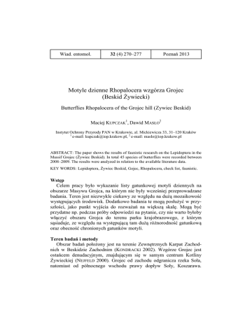 Wiad. entomol. 32 (4) 270–277 Poznań 2013 Motyle dzienne Rhopalocera wzgórza Grojec (Beskid Żywiecki) Butterflies Rhopalocera of the Grojec hill (Zywiec Beskid) Maciej KUPCZAK1, Dawid MASŁO2 Instytut Ochrony Przyrody PAN w Krakowie, al. Mickiewicza 33, 31–120 Kraków 1 e-mail: [email protected], 2 e-mail: [email protected] ABSTRACT: The paper shows the results of faunistic research on the Lepidoptera in the Massif Grojec (Żywiec Beskid). In total 45 species of butterflies were recorded between 2008–2009. The results were analyzed in relation to the available literature data. KEY WORDS: Lepidoptera, Żywiec Beskid, Gojec, Rhopalocera, check list, faunistic. Wstęp Celem pracy było wykazanie listy gatunkowej motyli dziennych na obszarze Masywu Grojca, na którym nie były wcześniej przeprowadzane badania. Teren jest niezwykle ciekawy ze względu na dużą mozaikowość występujących środowisk. Dodatkowo badania te mogą posłużyć w przyszłości, jako punkt wyjścia do rozważań na większą skalę. Mogą być przydatne np. podczas próby odpowiedzi na pytanie, czy nie warto byłoby włączyć obszaru Grojca do terenu parku krajobrazowego, z którym sąsiaduje, ze względu na występującą tam dużą różnorodność gatunkową oraz obecność chronionych gatunków motyli. Teren badań i metody Obszar badań położony jest na terenie Zewnętrznych Karpat Zachodnich w Beskidzie Zachodnim (KONDRACKI 2002). Wzgórze Grojec jest ostańcem denudacyjnym, znajdującym się w samym centrum Kotliny Żywieckiej (NEJFELD 2000). Grojec od zachodu odgranicza rzeka Soła, natomiast od północnego wschodu prawy dopływ Soły, Koszarawa. MOTYLE DZIENNE RHOPALOCERA WZGÓRZA GROJEC (BESKID ŻYWIECKI) 271 Wzgórze leży, więc w widłach tych rzek. Jest to obszar zajmujący około 8000 ha. (NEJFELD 2000). Administracyjnie większa część terenu (85%) znajduje się w granicach miasta Żywca, pozostała część (15%) leży na terenie gminy Radziechowy-Wieprz. W skład Wzgórza Grojec wchodzi kilka wzniesień: – Mały Grojec – 422 m n.p.m. – Średni Grojec – 475 m n.p.m. – Duży Grojec – 612 m n.p.m. Opisywany teren charakteryzuje się bardzo dużym zróżnicowaniem pod względem siedliskowym. Na tak małym terenie występuje zarówno murawa kserotermiczna jak i torfowisko wysokie (NEJFELD 2001). Ponadto występują lasy o charakterze naturalnym oraz sztucznym. Warto podkreślić fakt, że część wzgórza jest nadal użytkowana rolniczo. Taka różnorodność środowisk wpływa na zwiększenie ilości stref przejściowych i ekotonowych, szczególnie chętnie zasiedlanych przez niektóre motyle. Badania realizowano w latach 2008–2010 przy czym w pierwszym roku badania miały charakter rozpoznawczy, polegający na wyznaczeniu stanowisk badawczych tak, aby obejmowały wszystkie ważne środowiska występujące na wzgórzu. Obiektem badań na wzgórzu Grojec były motyle z dwóch nadrodzin: Papilionidea i Hesperioidea, powszechnie nazywane motylami dziennymi (Rhopalocera). Nazewnictwo gatunków przyjęto za opracowaniem BUSZKI i MASŁOWSKIEGO (2008). Badania miały głównie charakter jakościowy, w terenie motyle były chwytane za pomocą siatki entomologicznej. Większość była oznaczana przyżyciowo i wypuszczana, osobniki trudne w weryfikacji były zatruwane w oparach octanu etylu i później oznaczane w warunkach laboratoryjnych. Materiał dowodowy znajduje się w prywatnych zbiorach autorów. Wyniki Podczas badań przeprowadzonych na terenie wzgórza Grojec stwierdzono obecność 45 gatunków motyli dziennych (Tab. I). 272 M. KUPCZAK, D. MASŁO Tab. I. Porównanie badań i danych literaturowych, ● – gatunek stwierdzony, ○ – gatunek niestwierdzony, ▪ – brak danych. Tab. I. Comparison of research and literature data, ● – species found, ○ – species not found, ▪ – no data. Gatunek Species 1 Motyle dzienne województwa BUSZKO 1997 bielskiego (UTM: CA60, zebrane po roku Badania CA70) 1945 autorów After BUSZKO Butterflies Autors 1997 (UTMspecies research squares: CA60, of Bielsko CA70) collected after 1945 2 3 4 Erynnis tages (Linnaeus, 1758) ● ○ ● Pyrgus carthami (Hübner, 1813) ○ ● ○ Pyrgus malvae (Linnaeus, 1758) ● ○ ● Pyrgus alveus (Hübner, 1803) ● ○ ○ Carterocephalus palaemon (Pallas, 1771) ● ○ ● Carterocephalus silvicola (Meigen, 1829) ● ○ ○ Thymelicus lineola (Ochsenheimer, 1808) ● ● ● Thymelicus sylvestris (Poda, 1761) ● ● ● Hesperia comma (Linnaeus, 1758) ○ ○ ○ Ochlodes sylvanus (Esper, 1777) ● ○ ● Iphiclides podalirius (Linnaeus, 1758) ● ○ ○ Papilio machaon Linnaeus, 1758 ● ● ● Leptidea sinapis (Linnaeus, 1758) ● ○ ● Leptidea reali Reissinger, 1989 ▪ ▪ ● Anthocharis cardamines (Linnaeus, 1758) ● ● ● Aporia crataegi (Linnaeus, 1758) ● ○ ○ Pieris brassicae (Linnaeus, 1758) ● ● ● Pieris rapae (Linnaeus, 1758) ● ● ● Pieris napi (Linnaeus, 1758) ● ● ● Pieris bryoniae (Hübner, 1806) ● ○ ○ Pontia edusa (Fabricius, 1777) ● ● ● 273 MOTYLE DZIENNE RHOPALOCERA WZGÓRZA GROJEC (BESKID ŻYWIECKI) Tab. I. c.d. 1 2 3 4 Colias palaeno (Linnaeus, 1761) ● ○ ○ Colias croceus (Fourcroy, 1785) ○ ● ○ Colias hyale (Linnaeus, 1758) ● ● ● Gonepteryx rhamni (Linnaeus, 1758) ● ● ● Lycaena phlaeas (Linnaeus, 1761) ● ● ○ Lycaena dispar (Haworth, 1802) ○ ○ ● Lycaena virgaureae (Linnaeus, 1758) ● ● ● Lycaena tityrus (Poda, 1761) ● ○ ○ Lycaena alciphron (Rottemburg, 1775) ● ● ○ Lycaena hippothoe (Linnaeus, 1761) ● ● ○ Thecla betulae (Linnaeus, 1758) ● ○ ● Neozephyrus ąuercus (Linnaeus, 1758) ● ○ ○ Callophrys rubi (Linnaeus, 1758) ● ○ ○ Satyrium w-album (Knoch, 1782) ● ○ ○ Satyrium pruni (Linnaeus, 1758) ● ○ ● Cupido minimus (Fuessly, 1775) ● ○ ○ Celastrina argiolus (Linnaeus, 1758) ● ○ ● Maculinea arion (Linnaeus, 1758) ● ○ ○ Maculinea na
