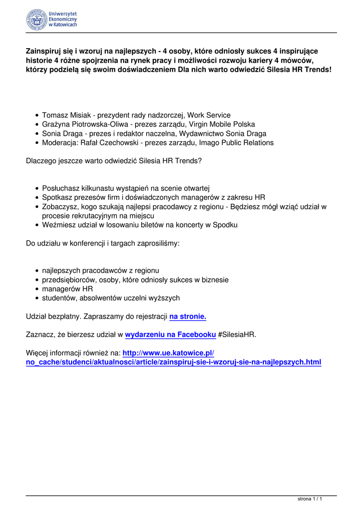 Zainspiruj się i wzoruj na najlepszych - 4 osoby, które odniosły sukces 4 inspirujące historie 4 różne spojrzenia na rynek pracy i możliwości rozwoju kariery 4 mówców, którzy podzielą się swoim doświadczeniem Dla nich warto odwiedzić Silesia HR Trends! Tomasz Misiak - prezydent rady nadzorczej, Work Service Grażyna Piotrowska-Oliwa - prezes zarządu, Virgin Mobile Polska Sonia Draga - prezes i redaktor naczelna, Wydawnictwo Sonia Draga Moderacja: Rafał Czechowski - prezes zarządu, Imago Public Relations Dlaczego jeszcze warto odwiedzić Silesia HR Trends? Posłuchasz kilkunastu wystąpień na scenie otwartej Spotkasz prezesów firm i doświadczonych managerów z zakresu HR Zobaczysz, kogo szukają najlepsi pracodawcy z regionu - Będziesz mógł wziąć udział w procesie rekrutacyjnym na miejscu Weźmiesz udział w losowaniu biletów na koncerty w Spodku Do udziału w konferencji i targach zaprosiliśmy: najlepszych pracodawców z regionu przedsiębiorców, osoby, które odniosły sukces w biznesie managerów HR studentów, absolwentów uczelni wyższych Udział bezpłatny. Zapraszamy do rejestracji na stronie. Zaznacz, że bierzesz udział w wydarzeniu na Facebooku #SilesiaHR. Więcej informacji również na: http://www.ue.katowice.pl/ no_cache/studenci/aktualnosci/article/zainspiruj-sie-i-wzoruj-sie-na-najlepszych.html strona 1 / 1