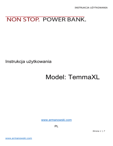 INSTRUKCJA UŻYTKOWANIA Instrukcja użytkowania Model: TemmaXL www.armanowski.com PL Strona 1 | 7 www.armanowski.com INSTRUKCJA UŻYTKOWANIA Wygląd produktu: Rys.1. a) b) c) d) e) f) g) h) Wtyczka/złącze USB Wtyczka/złącze micro USB Kabel transmisyjny USB Przycisk uruchomiający latarkę (przytrzymać3 s), poziom naładowania Wskaźnik poziomu naładowania Latarka LED Port micro USB wejście – ładowanie urządzenia Port USB wyjście – rozładowywanie urządzenia 2A (max) 1. Ładowanie urządzenia: Rys.2. a) b) Ładowanie poprzez podłączenie do portu USB w komputerze. Ładowanie TemmaXL poprzez podłączenie do adaptera/ładowarki sieciowej AC USB z parametrami wyjściowymi 5VDC, 2.0A (max) – brak adaptera/ładowarki AC USB w zestawie. Strona 2 | 7 www.armanowski.com INSTRUKCJA UŻYTKOWANIA 2. Ładowanie urządzeń cyfrowych za pomocą Power Bank TemmaXL: Rys.3. NonStop PawerBank TemmaXL Przenośna, zewnętrzna bateria Przenośny bank energii/ładowarka, kompatybilny z większością urządzeń mobilnych zasilanych napięciem stałym DC 5V tj. tablety, smartfony, odtwarzacze mp3, mp4, GPS, mini kamery, aparaty fotograficzne itp. Produkt służy jako zapasowa bateria oraz ładowarka akumulatorów urządzeń przenośnych/mobilnych. Produkt posiada certyfikację (CE), więc ze względów bezpieczeństwa nie można modyfikować urządzenia we własnym zakresie lub otwierać obudowę. Dziękujemy za wybór i korzystanie z produktów NonStop. Prosimy zapoznać się z instrukcją bezpiecznego użytkowania przed rozpoczęciem używania produktu. Postępuj zgodnie z instrukcją celem prawidłowego użytkowania. Za powstałe szkody i obrażenia spowodowane nie przestrzeganiem wskazówek bezpieczeństwa i prawidłowego użytkowania nie ponosimy odpowiedzialności. Produkt traci gwarancję. Instrukcja uruchomienia Przed każdym użyciem należy sprawdzić stan naładowania wbudowanego w urządzenie akumulatora. Przed każdym użyciem doładować wewnętrzny akumulatora do pełna. Uwaga!!! Należy zapoznać się z mocą znamionową urządzenia mobilnego oraz porównać z parametrami produktu NonStop (informacje zawarte w danych technicznych). Nie doprowadzać do powstania zwarć na portach USB. Kabel USB dołączony do zestawu może zostać wykorzystany do transmisji danych. Ładowanie NonStop TemmaXL (Rys.2) 1.Rozpocząć ładowanie wewnętrznego akumulatora, gdy świeci się jedna dioda LED. 2.Użyć oryginalnego kabla z transmisją dołączonego do zestawu. Wpiąć złącze kabla micro USB do portu micro USB w urządzeniu NonStop TemmaXL. 3.Podłączyć złącze kabla USB do portu USB w komputerze lub do innego źródła zasilania (adapter/ładowarka USB AC). Podczas ładowania diody LED mrugają. 4.Urządzenie naładowane do pełna – wszystkie diody LED świecą stałym światłem. 5.Naładowane urządzenie odłączyć od źródła zasilania. Następnie można przystąpić do użytkowania produktu. Czas ładowania uzależniony od pojemności ogniw wewnętrznych, prądu ładowania oraz poziomu naładowania. Oscyluje w przedziale 15-22 godzin. Strona 3 | 7 www.armanowski.com INSTRUKCJA UŻYTKOWANIA Kontrola stanu naładowania 1.Wbudowane Diody LED informują o stanie naładowania wewnętrznego akumulatora. Diody świecące stałym światłem wskazują poziom naładowania. Pojedyncze przyciśnięcie przycisku uruchamia status naładowania urządzenia. Mrugające wskazują status ładowania. 2.Procentowy stan naładowania przy diodach LED świecących stałym światłem wygląda następująco: a) świecąca 1 dioda LED – akumulator naładowany w przedziale 0-25% b) świecące 2 diody LED – akumulator naładowany w przedziale 25-50% c) świecące 3 diody LED – akumulator naładowany w przedziale 50-75% d) świecące 4 diody LED – akumulator naładowany w przedziale 75-100% 0-25% 25-50% 50-75% 75-100% Ładowanie cyfrowych urządzeń przenośnych za pomocą NonStop TemmaXL (Rys.3.) 1. Sprawdzić parametry techniczne urządzenia mobilnego. Produkt kompatybilny jest z urządzeniami zasilanymi prądem stałym DC o napięciu 5V. Tablety i sprzęt wymagający wyższego napięcia ok 9 VDC nie będzie mógł być ładowany za pomocą modelu Power Banka TemmaXL. 2. Power bank posiada przycisk, który po naciśnięciu uruchomia status kontroli poziomu naładowania. Przed podłączeniem kabla USB i rozpoczęciem ładowania urządzenia mobilnego należy sprawdzić poziom naładowania. 3. Użyć oryginalnego kabla z transmisją dołączonego do zestawu. Wpiąć złącze kabla micro USB do portu micro USB w urządzeniu przenośnym. Wtyczkę USB należy wpiąć do Power Banka złącze USB 1A 2A. Jednocześnie można ładować jedno urządzenie. 4. Podczas ładowania diody informującej o statusie ładowaniu urządzenia mobilnego świecą stałym światłem. Diody stopniowo gasną, informując jednocześnie o poziomie energii zmagazynowanej w power banku. 5. Użytkownik chcąc przerwać ładowanie musi odłączyć kabel USB. 6. Kontrola naładowania urządzenia mobilnego. Po naładowaniu do pełna Power bank odłącza proces ładowania. 7. Po zakończeniu ładowania odłącz kabel USB od urządzenia i produktu. Jeśli produkt się wyłączy należy go ponownie wzbudzić przez wciśnięcie przycisku. Jeśli podłączone urządzenie podczas ładowania jest w użyciu Power bank nie wyłączy się automatycznie Włączanie i wyłączanie latarki LED Przytrzymanie przycisku na obudowie w czasie 3s (Rys.1 pkt. d) uruchamia lub wyłącza latarkę LED. Wskazówki bezpiecznego użytkowania UWAGA!!! Prosimy o przestrzeganie poniższych informacji w celu bezpiecznego użytkowania. Klasyfikacja zagrożeń osoby/produkt Użytkować i przechowywać z dala od dzieci i zwierząt, Produkt nie jest zabawką, nie pozostawiać bez nadzoru (również opakowanie) Nie narażać na uszkodzenia mechaniczne, obchodzić się ostrożnie z produktem, Chronić przed wysokimi temperaturami, nadmiernym nasłonecznieniem, silny