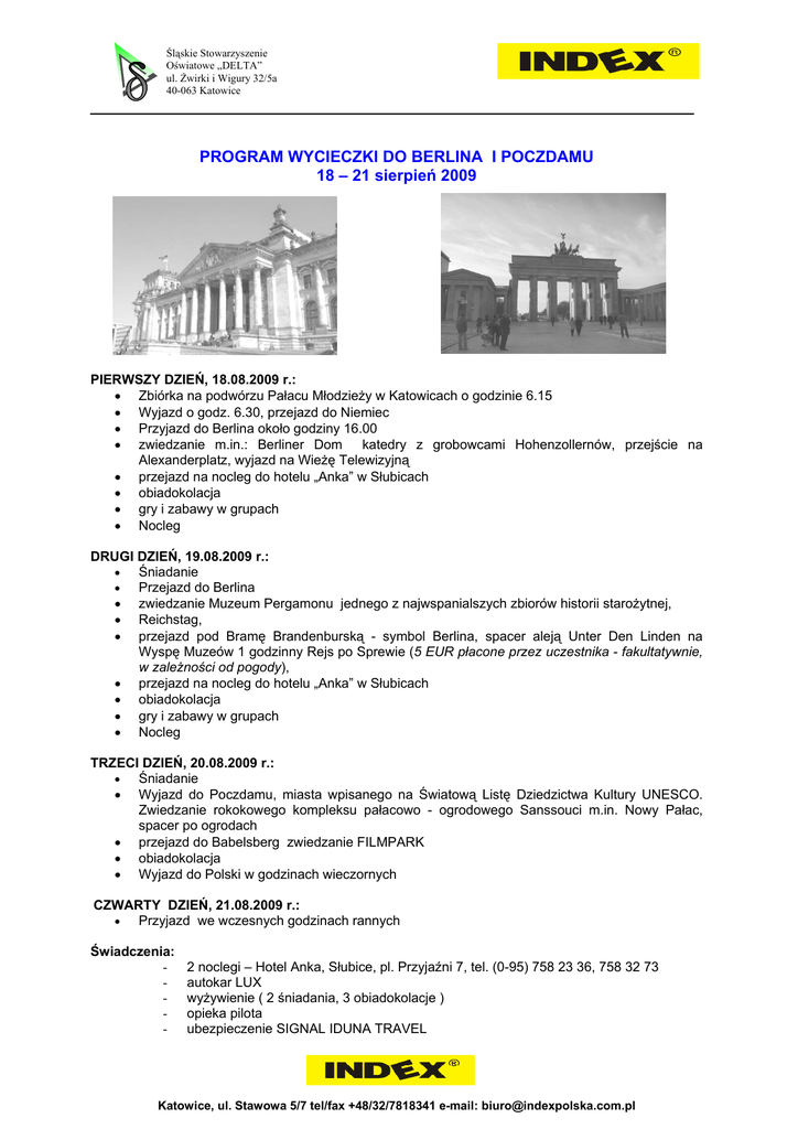 Śląskie Stowarzyszenie Oświatowe „DELTA” ul. Żwirki i Wigury 32/5a 40-063 Katowice PROGRAM WYCIECZKI DO BERLINA I POCZDAMU 18 – 21 sierpień 2009 PIERWSZY DZIEŃ, 18.08.2009 r.: • Zbiórka na podwórzu Pałacu Młodzieży w Katowicach o godzinie 6.15 • Wyjazd o godz. 6.30, przejazd do Niemiec • Przyjazd do Berlina około godziny 16.00 • zwiedzanie m.in.: Berliner Dom katedry z grobowcami Hohenzollernów, przejście na Alexanderplatz, wyjazd na Wieżę Telewizyjną • przejazd na nocleg do hotelu „Anka” w Słubicach • obiadokolacja • gry i zabawy w grupach • Nocleg DRUGI DZIEŃ, 19.08.2009 r.: • Śniadanie • Przejazd do Berlina • zwiedzanie Muzeum Pergamonu jednego z najwspanialszych zbiorów historii starożytnej, • Reichstag, • przejazd pod Bramę Brandenburską - symbol Berlina, spacer aleją Unter Den Linden na Wyspę Muzeów 1 godzinny Rejs po Sprewie (5 EUR płacone przez uczestnika - fakultatywnie, w zależności od pogody), • przejazd na nocleg do hotelu „Anka” w Słubicach • obiadokolacja • gry i zabawy w grupach • Nocleg TRZECI DZIEŃ, 20.08.2009 r.: • Śniadanie • Wyjazd do Poczdamu, miasta wpisanego na Światową Listę Dziedzictwa Kultury UNESCO. Zwiedzanie rokokowego kompleksu pałacowo - ogrodowego Sanssouci m.in. Nowy Pałac, spacer po ogrodach • przejazd do Babelsberg zwiedzanie FILMPARK • obiadokolacja • Wyjazd do Polski w godzinach wieczornych CZWARTY DZIEŃ, 21.08.2009 r.: • Przyjazd we wczesnych godzinach rannych Świadczenia: - 2 noclegi – Hotel Anka, Słubice, pl. Przyjaźni 7, tel. (0-95) 758 23 36, 758 32 73 autokar LUX wyżywienie ( 2 śniadania, 3 obiadokolacje ) opieka pilota ubezpieczenie SIGNAL IDUNA TRAVEL Katowice, ul. Stawowa 5/7 tel/fax +48/32/7818341 e-mail: [email protected]