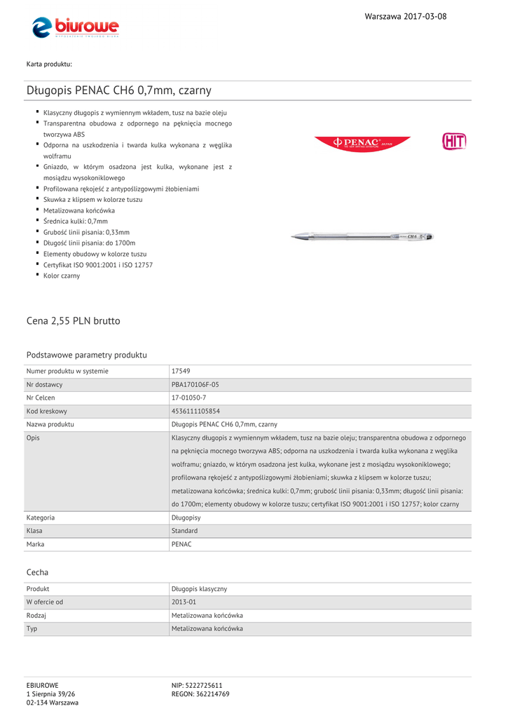 Warszawa 2017-03-08 Karta produktu: Długopis PENAC CH6 0,7mm, czarny Klasyczny długopis z wymiennym wkładem, tusz na bazie oleju Transparentna obudowa z odpornego na pęknięcia mocnego tworzywa ABS Odporna na uszkodzenia i twarda kulka wykonana z węglika wolframu Gniazdo, w którym osadzona jest kulka, wykonane jest z mosiądzu wysokoniklowego Profilowana rękojeść z antypoślizgowymi żłobieniami Skuwka z klipsem w kolorze tuszu Metalizowana końcówka Średnica kulki: 0,7mm Grubość linii pisania: 0,33mm Długość linii pisania: do 1700m Elementy obudowy w kolorze tuszu Certyfikat ISO 9001:2001 i ISO 12757 Kolor czarny Cena 2,55 PLN brutto Podstawowe parametry produktu Numer produktu w systemie 17549 Nr dostawcy PBA170106F-05 Nr Celcen 17-01050-7 Kod kreskowy 4536111105854 Nazwa produktu Długopis PENAC CH6 0,7mm, czarny Opis Klasyczny długopis z wymiennym wkładem, tusz na bazie oleju; transparentna obudowa z odpornego na pęknięcia mocnego tworzywa ABS; odporna na uszkodzenia i twarda kulka wykonana z węglika wolframu; gniazdo, w którym osadzona jest kulka, wykonane jest z mosiądzu wysokoniklowego; profilowana rękojeść z antypoślizgowymi żłobieniami; skuwka z klipsem w kolorze tuszu; metalizowana końcówka; średnica kulki: 0,7mm; grubość linii pisania: 0,33mm; długość linii pisania: do 1700m; elementy obudowy w kolorze tuszu; certyfikat ISO 9001:2001 i ISO 12757; kolor czarny Kategoria Długopisy Klasa Standard Marka PENAC Cecha Produkt Długopis klasyczny W ofercie od 2013-01 Rodzaj Metalizowana końcówka Typ Metalizowana końcówka EBIUROWE 1 Sierpnia 39/26 02-134 Warszawa NIP: 5222725611 REGON: 362214769 Warszawa 2017-03-08 Karta katalogowa produktu cd. Długopis PENAC CH6 0,7mm, czarny Certyfikaty Certyfikaty, normy, patenty ISO 9001:2001, ISO 12757 Hit Hit Nowy produkt w ofercie Standard Zamiennik Zamiennik JBA170106F-01 Wspólny słownik zamówień CPV 30192121-5 Długopisy kulkowe Kolor Kolor obudowy/ wkładu Transparentny/czarny Kolor Czarny Wymiary Grubość linii (mm) 0,33 Dł. linii (m) 1700 Serdecznie zapraszamy do współpracy EBIUROWE zespół. EBIUROWE 1 Sierpnia 39/26 02-134 Warszawa NIP: 5222725611 REGON: 362214769