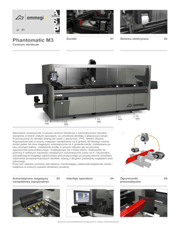 pl #1 Zaciski Phantomatic M3 01 Głowica elektryczna 02 Centrum obróbcze 04 03 01 02 05 Sterowane numerycznie 3-osiowe centrum obróbcze z automatycznym obrotem narzędzia w trzech stałych pozycjach, co umożliwia obróbkę 3 płaszczyzn sztuki. Przeznaczone do obróbki sztang lub sztuk z aluminium, PVC, lekkich stopów. Wyposażone jest w ręczny magazyn narzędziowy na 9 gniazd, do którego można dodać jeden lub dwa magazyny automatyczne na 4 gniazda każdy, instalowane po obu stronach kabiny. Ustawianie profilu w pozycji odbywa się za pomocą ogranicznika pneumatycznego, znajdującego się z lewej strony, blokowanie za pomocą 4 solidnych zacisków ustawianych automatycznie przez oś X. Opcjonalne zainstalowanie drugiego ogranicznika pneumatycznego po prawej stronie umożliwia wykonanie ponadwymiarowych obróbek sztang o długości podwójnej względem pola roboczego. Poza tym zawiera ruchomy stół roboczy umożliwiający załadunek/wyładunek sztuki i zwiększa w znaczny sposób obrabiany przekrój. Automatyczne magazyny narzędziowe (opcjonalne) 03 Interfejs operatora 04 Rysunki są przedstawione wyłącznie w celach informacyjnych Ograniczniki pneumatyczne 05 Phantomatic M3 Centrum obróbcze 01 02 03 04 05 Zaciski Głowica elektryczna Automatyczne magazyny narzędziowe (opcjonalne) Interfejs operatora Ograniczniki pneumatyczne w zależności od długości detalu i rodzaju wykonywanej obróbki oprogramowanie maszyny może określić pozycję każdego zespołu zacisków w warunkach pełnego bezpieczeństwa. Automatyczny przyrząd ustawczy umożliwia zaczepienie każdego zespołu zacisku i przeniesienie go dzięki ruchowi wózka. Taka czynność następuje z maksymalną prędkością i precyzją, unikając możliwego ryzyka zderzeń i doprowadzając w ten sposób maszynę do stanu łatwej obsługi również ze strony mniej wyspecjalizowanych operatorów. Stół roboczy umożliwia załadunek/wyładunek sztuki i znacznie zwiększa obrabiany przekrój. Elektrowrzeciono o mocy od 5,5 kW w wersji S1 może osiągnąć prędkość 20000 obr./min. Ruch elektrowrzeciona wzdłuż osi A umożliwia wykonanie obrotu od 0° do 180°, pozwalając na obróbkę profilu na 3 powierzchniach, bez konieczności ponownego ustawiania. Elektrowrzeciono o mocy od 5,5 kW w wersji S1 może osiągnąć prędkość 20.000 obr./min. Może być wykorzystywane do obróbki profili aluminiowych, z PCV i lekkich stopów oraz wytłoczonych elementów stalowych do grubości 2 mm. Standardowy magazyn narzędziowy mieści 9 uchwytów narzędziowych. Jest obsługiwany ręcznie, wsuwany i znajduje się w maszynie, aby operatorowi ułatwić korzystanie z niego. Na zamówienie maszyna może być wyposażona w jeden lub dwa dodatkowe magazyny automatyczne umieszczone po obu stronach kabiny. Każdy z nich może pomieścić 4 uchwyty na narzędzia z odpowiednimi narzędziami konfigurowanymi zgodnie z wymaganiami operatora. Nowa wersja sterowania, z wiszącym interfejsem, umożliwia operatorowi widok ekranu z jakiejkolwiek pozycji, dzięki możliwości obracania monitora na pionowej osi. Interfejs operatora dysponuje 15” wyświetlaczem dotykowym wyposażonym w wejścia USB konieczne do zdalnego połączenia z PC i CN. Wyposażony jest również w myszkę i klawiaturę oraz przyłącze dla czytnika kodów kreskowych. jest wyposażony w wejście USB do wymiany danych, umieszczone z przodu. Na maszynie znajdują się solidne ograniczniki, które pozwalają na ustawienie profilu, jeden na lewej stronie (standard) i jeden na prawej stronie (opcja). Każdy ogranicznik, uruchamiany przez siłownik pneumatyczny, jest typu chowanego i jest wybierany automatycznie za pomocą oprogramowania, w zależności od wykonywanej obróbki. Zaletą podwójnego ogranicznika jest możliwość zmiany pozycji sztangi lub kęsa celem obróbki szczególnie długich profili. Tryb 1-elementowy SKOKI OSI OŚ X (podłużna) (mm) 3000 OŚ Y (poprzeczna) (mm) 274 OŚ Z (pionowa) (mm) 390 Automatyczne ustawianie w trzech stałych pozycjach -90° | 0 | +90° PRĘDKOŚĆ USTAWIANIA OŚ X (m/min) 56 OŚ Y (m/min) 22 OŚ Z (m/min) 22 UCHWYT ELEKTRYCZNY Maksymalna moc S1 (kW) Maksymalna prędkość (1/min.) Stożek narzędziowy 4 20 000 HSK-50F Automatyczny uchwyt narzędziowy ● Chłodzenie cieczą ● MAGAZYN NARZĘDZI Maksymalna liczba narzędzi w magazynie ręcznym 9 4-pozycyjny automatyczny magazyn narzędzi (lewy) ○ 4-pozycyjny automatyczny magazyn pomocniczy narzędzi (prawy) ○ Maksymalna średnica ostrza ładowana do magazynu (mm) 80 ZDOLNOŚĆ GWINTOWANIA (z gwintem, w aluminium i otworze przelotowym) Z kompensacją M5 Z interpolacją śrubową ● USTAWIENIE POZYCJI PROFILU Ograniczniki LW odniesienia elementu poruszane pneumatycznie ● Ograniczniki PR odniesienia elementu poruszane pneumatycznie ○ BLOKOWANIE ELEMENTU Standardowa liczba zacisków 4 Automatyczne ustawianie zacisków za pomocą osi X ● ZABEZPIECZENIA I OSŁONY Kabina zabezpieczająca maszynę ● Tunele boczne ○ 2016/01/15 Rysunki są przedstawione wyłącznie w celach informacyjnych www.emmegi.com