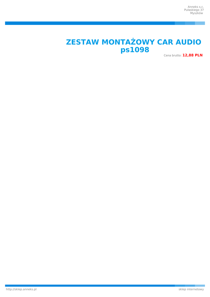 Anneks s.c. Pułaskiego 37 Myszków ZESTAW MONTAŻOWY CAR AUDIO ps1098 Cena brutto: http://sklep.anneks.pl 12,88 PLN sklep internetowy