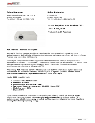 Salon Bemowo Salon Białołęka Powstańców Śląskich 87 lok. U10 B 01-466 Warszawa Tel. (22)427-89-95, (22)398-73-32 Kabrioletu 4 03-117 Warszawa Tel. (22)490-31-43, (22)243-36-05 Nazwa: Projektor ASK Proxima C431 Cena: 2 269,00 zł Producent: ASK Proxima ASK Proxima - marka z tradycjami Marka ASK Proxima zawiera w sobie cechy najbardziej rozpoznawalnych marek na rynku audiowizualnym. Swój wkład w jej bogate doświadczenie mają takie markifirmy jak Sanyo, InFocus, Polaroid oraz oczywiście ASK Proxima. Kluczowych komponentów dostarczają znane w branży koncerny, takie jak Sony (dostawca nieorganicznych paneli LCD BrightEra™), Texas Instruments (dostawca chipów DLP™), Philips, Ushio (obie dostarczają lampy projekcyjne), Phoenix, Ricoh i Pixelworks. Pozostałe podzespoły produkowane są natomiast w fabrykach ACTO. Projektory ASK Proxima serii C400 zastępuje serii C3000, zatem także są to urządzenia skierowane dla biznesu i edukacji. Charakteryzuje je wysoka jasność, bardzo dobre odwzorowanie kolorów, wysoki kontrast oraz duża ilość złącz. Model C431 charakteryzuje: Jasność 3700 ANSI lumenów Kontrast 10 000:1 Rozdzielczość XGA (1.024 x 768) Żywotność lampy wynosząca aż 10.000h (SuperECO) Głośnik o mocy 10W Złącze HDMI Dodatkowo w projektorze zastosowano szereg ciekawych funkcji, takich jak funkcja blank (chwilowe wyłączenie obrazu), różne sposoby zabezpieczenia (np. blokada kodem PIN), automatyczny obrót obrazu przy projekcji sufitowej, automatyczna korekcja Keystone oraz system łatwej wymiany lampy. strona 1 / 1 Powered by TCPDF (www.tcpdf.org)