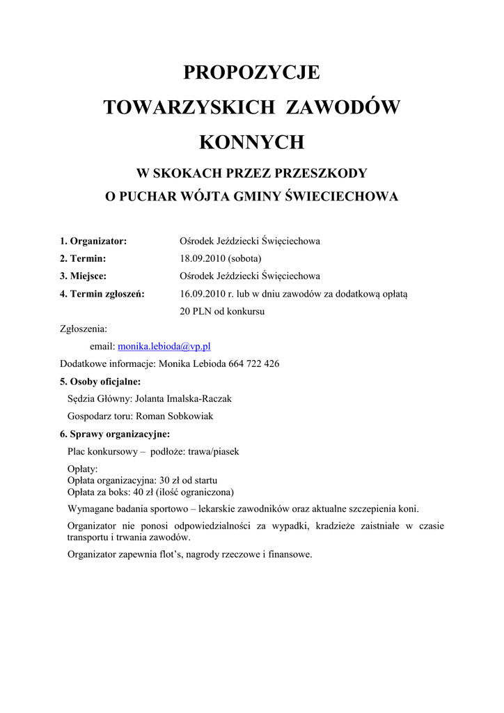PROPOZYCJE TOWARZYSKICH ZAWODÓW KONNYCH W SKOKACH PRZEZ PRZESZKODY O PUCHAR WÓJTA GMINY ŚWIECIECHOWA 1. Organizator: Ośrodek Jeździecki Święciechowa 2. Termin: 18.09.2010 (sobota) 3. Miejsce: Ośrodek Jeździecki Święciechowa 4. Termin zgłoszeń: 16.09.2010 r. lub w dniu zawodów za dodatkową opłatą 20 PLN od konkursu Zgłoszenia: email: [email protected] Dodatkowe informacje: Monika Lebioda 664 722 426 5. Osoby oficjalne: Sędzia Główny: Jolanta Imalska-Raczak Gospodarz toru: Roman Sobkowiak 6. Sprawy organizacyjne: Plac konkursowy – podłoże: trawa/piasek Opłaty: Opłata organizacyjna: 30 zł od startu Opłata za boks: 40 zł (ilość ograniczona) Wymagane badania sportowo – lekarskie zawodników oraz aktualne szczepienia koni. Organizator nie ponosi odpowiedzialności za wypadki, kradzieże zaistniałe w czasie transportu i trwania zawodów. Organizator zapewnia flot’s, nagrody rzeczowe i finansowe. Program zawodów godz. 10:00 Konkurs Nr 1 - Klasa „LL” - zwykły - art. 238.2.1. Konkurs Nr 2 - Klasa „L” - dwufazowy - art. 274.5.3 Konkurs Nr 3 - Klasa „P” - dokładności z rozgrywką - art. 238.2.2 Konkurs Nr 4 - Klasa „N” - dwufazowy - art. 274.5.3 Organizator zastrzega sobie prawo do zmian w programie. KODEKS POSTĘPOWANIA Z KONIEM Polski Związek Jeździecki prosi wszystkie osoby zaangażowane w jakikolwiek sposób w sporty konne, o przestrzeganie poniżej przedstawionego kodeksu oraz zasady, że dobro konia jest najważniejsze. Dobro konia musi być zawsze i wszędzie uwzględniane w sportach konnych i nie może być podporządkowane współzawodnictwu sportowemu ani innym celom np. komercyjnym. I. Na wszystkich etapach treningu i przygotowań konia do startu w zawodach, dobro konia musi stać ponad wszelkimi innymi wymaganiami. Dotyczy to stałej opieki, metod treningu, starannego obrządku, kucia i transportu. II. Konie i jeźdźcy muszą być wytrenowani, kompetentni i zdrowi zanim wezmą udział w zawodach. Odnosi się to także do podawania leków i środków medycznych, zabiegów chirurgicznych zagrażających dobru konia lub ciąży klaczy, oraz do przypadków nadużywania pomocy. III. Zawody nie mogą zagrażać dobru konia. Wymaga to zwrócenia szczególnej uwagi na teren zawodów, powierzchnię podłoża, pogodę, warunki stajenne, kondycję koni i ich bezpieczeństwo także podczas podróży powrotnej z zawodów. IV. Należy dołożyć wszelkich starań, aby zapewnić koniom staranną opiekę po zakończeniu zawodów, a także humanitarne traktowanie po zakończeniu kariery sportowej. Dotyczy to właściwej opieki weterynaryjnej obrażeń odniesionych na zawodach, spokojnej starości, ewentualnie eutanazji. V. PZJ zachęca wszystkie osoby działające w sporcie jeździeckim do stałego podnoszenia swojej wiedzy oraz umiejętności dotyczących wszelkich aspektów współpracy z koniem.