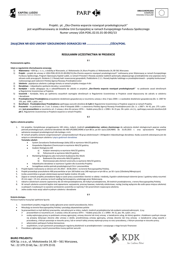 Projekt.: pt. „Eko-Chemia wsparcie rozwiązao proekologicznych” jest współfinansowany ze środków Unii Europejskiej w ramach Europejskiego Funduszu Społecznego Numer umowy UDA-POKL.02.01.01-00-092/13 ZAŁĄCZNIK NR 6DO UMOWY SZKOLENIOWO-DORADCZEJ NR ………………............./ZŚCH/POKL REGULAMIN UCZESTNICTWA W PROJEKCIE §1 Postanowienia ogólne. Użyte w regulaminie sformułowania oznaczają: 1) Wykonawca – KDK Sp. z o. o., z siedzibą w Warszawie, ul. Mokotowska 14, Biuro Projektu ul. Mokotowska 14, 00-561 Warszawa 1) Projekt – projekt do umowy nr UDA-POKL.02.01.01-00-092/13„Eko-Chemia wsparcie rozwiązao proekologicznych” realizowany przez Wykonawcę w ramach Europejskiego Funduszu Społecznego, Program Operacyjny Kapitał Ludzki, w ramach Priorytet II Rozwój zasobów ludzkichi potencjału adaptacyjnego przedsiębiorstw oraz poprawa stanu zdrowia osób pracujących, Działanie 2.1 Rozwój kadr nowoczesnej gospodarki, Poddziałanie 2.1.1. Rozwój kapitału ludzkiego w przedsiębiorstwach – projekty konkursowe” realizowanego pod nadzorem Polskiej Agencji Rozwoju Przedsiębiorczości 2) Szkolenie - pojedyncze szkolenie z jednego tematu w ramach projektu trwające 4 dni 3) Doradztwo – indywidualne spotkanie doradcy z uczestnikiem 4) Kandydat – osoba ubiegająca się o zakwalifikowanie do udziału w projekcie „Eko-Chemia wsparcie rozwiązao proekologicznych” na podstawie zasad określonych w Regulaminie Uczestnictwa w Projekcie. 5) Uczestnik – Kandydat, który po spełnieniu wszystkich wymogów określonych w Regulaminie Uczestnictwa w Projekcie został dopuszczony do udziału w szkoleniu i doradztwie 6) Przedsiębiorstwo/ Przedsiębiorca-prowadzenie działalności gospodarczej w rozumieniu ustawy z dnia 2 lipca 2004 r. o swobodzie działalności gospodarczej (Dz. U. 2007 Nr 155, poz. 1095, z późn. zm.) 7) Beneficjent - Przedsiębiorstwo/ Przedsiębiorca spełniający warunki określone § 3 pkt 2. Regulaminie Uczestnictwa w Projekcie wsparcie w ramach Projektu 8) Pracownik - na podstawie art. 3 ust. 3 ustawy z dnia 9 listopada 2000 r. o utworzeniu Polskiej Agencji Rozwoju Przedsiębiorczości (Dz. U. z 2007 r. Nr 42, poz. 275 z późn. zm.) jest pracownikiem w rozumieniu art. 2 ustawy z dnia 26 czerwca 1974 r. - Kodeks pracy (Dz.U. z 1998 r. Nr 21 poz. 94 z późn. zm.) tj., spełniający warunki określone § 3 pkt 1. Regulaminie Uczestnictwa w Projekcie wsparcie w ramach Projektu §2 Ogólne założenia projektu: 1. 2. 3. 4. 5. 6. 7. 8. 9. Cel projektu: Kompleksowe przygotowanie 100 mikro, małych, średnich przedsiębiorstwz sektora chemicznego do wdrożenia działao ekologicznych poprzez analizę potrzeb proekologicznych, szkoleniai doradztwo dla 400 UP(160K/240M) w tym 80 os. po 50 r życia (32K/48M) do 31.05.2015 r. oraz opracowanie Programów wdrażania rozwiązao proekologicznych dla każdego z nich. W ramach projektu zostanie zorganizowanych i przeprowadzonych 40 grup szkoleniowych i 1914godzin indywidualnego doradztwa. Każdy uczestnik zobowiązany jest do wzięcia w czterodniowym szkoleniu i pięciu godzinach doradztwa Tematyka szkoleo: System Zarzadzania Środowiskowego (dalej SZŚ) w wymiarze 4dni/32 godziny Gospodarka Odpadami Chemicznymi w wymiarze 4dni/32 godziny Audytor Ekologiczny SZŚ a) Audytor wewnętrzy w wymiarze 4dni/32 godziny b) Pełnomocnik w wymiarze 4dni/32 godziny Marketing Ekologiczny jako instrument budowania Eko-Marki a) Budowanie Eko-wizerunku 4dni/32 godziny b) Ekoinnowacje jako element wizerunku w wymiarze 4dni/32 godziny Indywidualne doradztwo w wymiarze 5 godzin dla Uczestnika Projektu Szczegółowa analiza potrzeb proekologicznych firm i pracowników Projekt będzie realizowany w okresie od 1.01.2014 – 30.06.2014 r. na terenie Rzeczypospolitej Polskiej. Projekt przewiduje przeszkolenie 400 pracowników w tym 160 kobiet oraz 240 mężczyzn w tym 80 os. po 50 r życia (32kobiety/48mężczyzn) Liczba uczestników w grupie szkoleniowej wynosid będzie średnio 10 osób. Zajęcia w ramach projektu prowadzone będą w czasie pracy uczestników również w soboty i niedzielę, 8 godzin szkoleniowych dziennie (przez 1 godzinę należy rozumied 45 min zajęd + 15 min. przerwy na lunch według harmonogramu ustalonego przez Wykonawcę. Udział w szkoleniach zostanie zapewniony dla 10 mikroprzedsiębiorstw, 60 małych przedsiębiorstw, 30 średnich przedsiębiorstw, z terenu Rzeczypospolitej Polskiej. W ramach szkolenia uczestnik będzie miał zapewnione: wyżywienie, przerwy kawowe, materiały szkoleniowe, nocleg (nocleg wyłącznie dla osób spoza miejsca szkolenia) w pokojach 2 osobowych na wyraźne zamówienie uczestnika co najmniej 7 dni przed dniem rozpoczęcia szkolenia. Jedna osoba może wziąd udział w jednym szkoleniu i doradztwie §3 Kryteria dostępu. Poniższe kryteria muszą byd spełnione łącznie. 1. 2. Uczestnikami projektu mogą byd osoby zgłaszane przez swoich pracodawców, które: Mieszkają na terenie Rzeczypospolitej Polskiej i posiadają obywatelstwo polskie Są pracownikami w myśl definicji pracownika, zatrudnionymi w mikro, małych, średnich przedsiębiorstw lub osobami samozatrudnionymi, tj są.: pracownikiem w rozumieniu art. 2 ustawy z dnia 26 czerwca 1974 r. – Kodeks pracy (Dz. U. z 1998 r. Nr 21, poz. 94, z późn. zm.); osobą wykonującą pracę na podstawie umowy agencyjnej, umowy zlecenia lub innej umowy o świadczenie usług, do której zgodnie z Kodeksem cywilnym stosuje się przepisy dotyczące zlecenia albo umowy o dzieło; przedmiotową umowę agencyjną, umowę zlecenia lub inną umowę o świadczenie usług zawarła z pracodawcą, z którym pozostaje w stosunku pracy, lub w ramach takiej umowy wykonuje pracę na rzecz pracodawcy, z którym pozostaje w stosunku pracy; właścicielem pełniącym funkcje kierownicze; wspólnikiem, w tym partnerem prowadzącym regularną działalnośd w przedsiębiorstwie i czerpiącego z niego korzyści finansowe Pracodawcy zgłaszający swoich