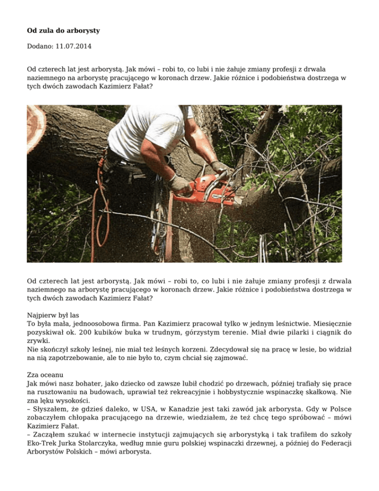 Od zula do arborysty Dodano: 11.07.2014 Od czterech lat jest arborystą. Jak mówi – robi to, co lubi i nie żałuje zmiany profesji z drwala naziemnego na arborystę pracującego w koronach drzew. Jakie różnice i podobieństwa dostrzega w tych dwóch zawodach Kazimierz Fałat? Od czterech lat jest arborystą. Jak mówi – robi to, co lubi i nie żałuje zmiany profesji z drwala naziemnego na arborystę pracującego w koronach drzew. Jakie różnice i podobieństwa dostrzega w tych dwóch zawodach Kazimierz Fałat? Najpierw był las To była mała, jednoosobowa firma. Pan Kazimierz pracował tylko w jednym leśnictwie. Miesięcznie pozyskiwał ok. 200 kubików buka w trudnym, górzystym terenie. Miał dwie pilarki i ciągnik do zrywki. Nie skończył szkoły leśnej, nie miał też leśnych korzeni. Zdecydował się na pracę w lesie, bo widział na nią zapotrzebowanie, ale to nie było to, czym chciał się zajmować. Zza oceanu Jak mówi nasz bohater, jako dziecko od zawsze lubił chodzić po drzewach, później trafiały się prace na rusztowaniu na budowach, uprawiał też rekreacyjnie i hobbystycznie wspinaczkę skałkową. Nie zna lęku wysokości. – Słyszałem, że gdzieś daleko, w USA, w Kanadzie jest taki zawód jak arborysta. Gdy w Polsce zobaczyłem chłopaka pracującego na drzewie, wiedziałem, że też chcę tego spróbować – mówi Kazimierz Fałat. – Zacząłem szukać w internecie instytucji zajmujących się arborystyką i tak trafiłem do szkoły Eko-Trek Jurka Stolarczyka, według mnie guru polskiej wspinaczki drzewnej, a później do Federacji Arborystów Polskich – mówi arborysta. Trafny wybór Praca w lesie nie dawała Kazimierzowi Fałatowi wystarczającej satysfakcji, pieniędzy, ani możliwości rozwoju. Postanowił więc po pięciu latach prowadzenia firmy leśnej rozpocząć przygodę ze wspinaczką drzewną. Połączył w jedno pasję, hobby i pracę. – To była jedna z najlepszych decyzji w moim życiu – mówi Pan Kazimierz. – Ani trochę jej nie żałuję. Nadal pracuję z drzewami, tylko teraz muszę uważniej im się przyglądać. Drwal pracujący w lesie podchodzi do drzewa i patrzy tylko, w którą stronę ma je obalić, a potem je ścina. Arborysta natomiast ogląda obiekt z każdej strony bardzo dokładnie, a później dopiero wspina się na nie. – Moja obecna praca jest ciekawsza od poprzedniej i więcej się w niej dzieje. W lesie nie spotka się dwóch takich samych drzew, również arborysta nie będzie miał do czynienia z dwiema takimi samymi gałęziami – tłumaczy Pan Kazimierz. Komentarze (0) Nie dodano jeszcze żadnego komentarza.