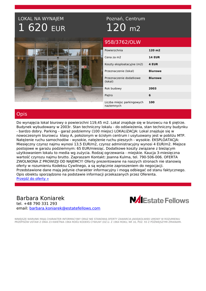 LOKAL NA WYNAJEM Poznań, Centrum 1 620 120 EUR m2 958/3762/OLW Powierzchnia 120 m2 Cena za m2 14 EUR Koszty eksploatacyjne (m2) 4 EUR Przeznaczenie (lokal) Biurowe Przeznaczenie dodatkowe (lokal) Biurowe Rok budowy 2003 Piętro 6 Liczba miejsc parkingowych naziemnych 100 Opis Do wynajęcia lokal biurowy o powierzchni 119,45 m2. Lokal znajduje się w biurowcu na 6 piętrze. Budynek wybudowany w 2003r. Stan techniczny lokalu - do odświeżenia, stan techniczny budynku - bardzo dobry. Parking – garaż podziemny (100 miejsc) LOKALIZACJA: Lokal znajduje się w nowoczesnym biurowcu klasy A, położonym w ścisłym centrum i usytuowany jest w pobliżu MTP. Natężenie ruchu samochodów - wysokie, natężenie ruchu pieszych - wysokie. EKSPLOATACJA: Miesięczny czynsz najmu wynosi 13,5 EUR/m2, czynsz administracyjny wynosi 4 EUR/m2. Miejsce postojowe w garażu podziemnym: 65 EUR/miesiąc. Dodatkowe koszty związane z bieżącym użytkowaniem lokalu to media wg zużycia. Rodzaj ogrzewania - miejskie. Kaucja 3-miesięczna wartość czynszu najmu brutto. Zapraszam Kontakt: Joanna Kulma, tel. 790-506-006. OFERTA ZWOLNIONA Z PROWIZJI OD NAJEMCY! Oferty prezentowane na naszych stronach nie stanowią oferty w rozumieniu Kodeksu Cywilnego, a są wyłącznie zaproszeniem do negocjacji. Przedstawione dane mają jedynie charakter informacyjny i mogą odbiegać od stanu faktycznego. Opis obiektu sporządzono na podstawie informacji przekazanych przez Oferenta. Przejdź do oferty » Barbara Koniarek tel. +48 790 331 293 email: [email protected] NINIEJSZE WARUNKI MAJĄ CHARAKTER INFORMACYJNY ORAZ NIE STANOWIĄ OFERTY ZAWARCIA JAKIEJKOLWIEK UMOWY W ROZUMIENIU PRZEPISÓW USTAW Z DNIA 23 KWIETNIA 1964 ROKU KODEKS CYWILNY (DZ.U. Z 1964 ROKU, NR 16, POZ. 93 Z PÓŹNIEJSZYMI ZMIANAMI. Powered by TCPDF (www.tcpdf.org)