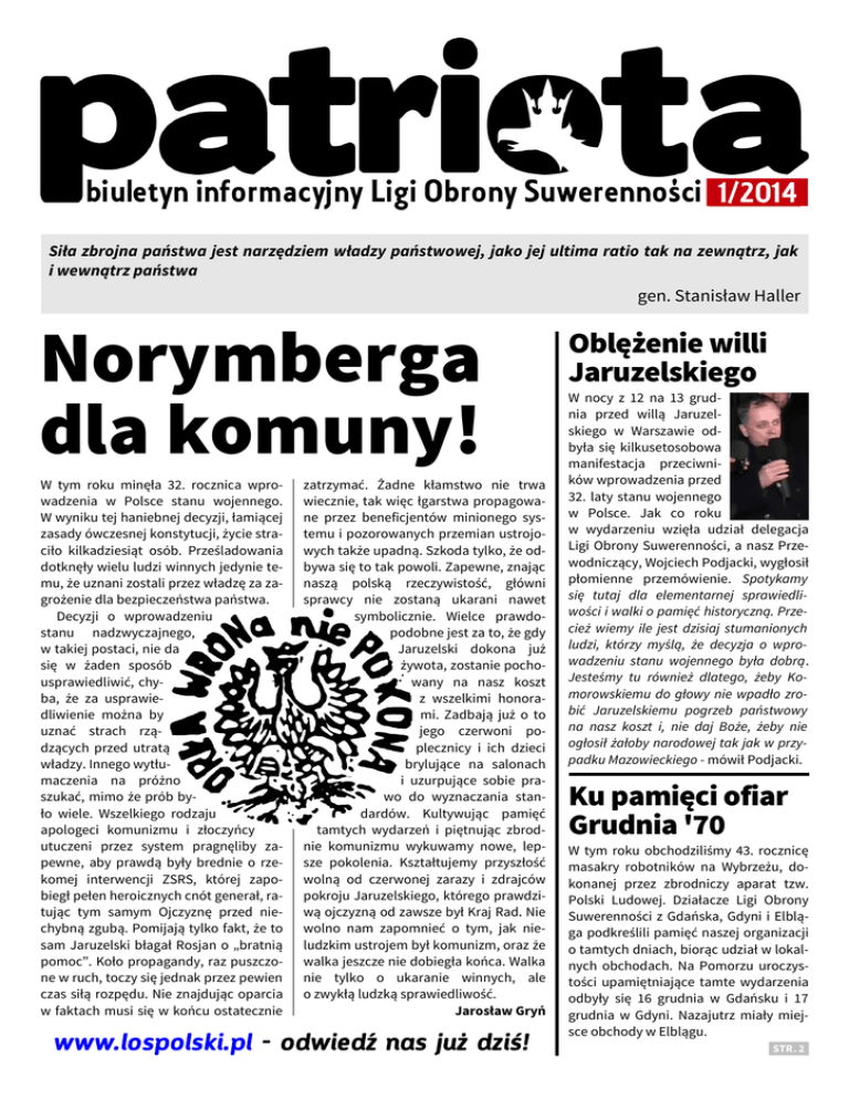 ' 1/2014 biuletyn informacyjny Ligi Obrony Suwerennosci asdasd Siła zbrojna państwa jest narzędziem władzy państwowej, jako jej ultima ratio tak na zewnątrz, jak i wewnątrz państwa gen. Stanisław Haller Norymberga dla komuny! W tym roku minęła 32. rocznica wprowadzenia w Polsce stanu wojennego. W wyniku tej haniebnej decyzji, łamiącej zasady ówczesnej konstytucji, życie straciło kilkadziesiąt osób. Prześladowania dotknęły wielu ludzi winnych jedynie temu, że uznani zostali przez władzę za zagrożenie dla bezpieczeństwa państwa. Decyzji o wprowadzeniu stanu nadzwyczajnego, w takiej postaci, nie da się w żaden sposób usprawiedliwić, chyba, że za usprawiedliwienie można by uznać strach rządzących przed utratą władzy. Innego wytłumaczenia na próżno szukać, mimo że prób było wiele. Wszelkiego rodzaju apologeci komunizmu i złoczyńcy utuczeni przez system pragnęliby zapewne, aby prawdą były brednie o rzekomej interwencji ZSRS, której zapobiegł pełen heroicznych cnót generał, ratując tym samym Ojczyznę przed niechybną zgubą. Pomijają tylko fakt, że to sam Jaruzelski błagał Rosjan o „bratnią pomoc”. Koło propagandy, raz puszczone w ruch, toczy się jednak przez pewien czas siłą rozpędu. Nie znajdując oparcia w faktach musi się w końcu ostatecznie zatrzymać. Żadne kłamstwo nie trwa wiecznie, tak więc łgarstwa propagowane przez beneficjentów minionego systemu i pozorowanych przemian ustrojowych także upadną. Szkoda tylko, że odbywa się to tak powoli. Zapewne, znając naszą polską rzeczywistość, główni sprawcy nie zostaną ukarani nawet symbolicznie. Wielce prawdopodobne jest za to, że gdy Jaruzelski dokona już żywota, zostanie pochowany na nasz koszt z wszelkimi honorami. Zadbają już o to jego czerwoni poplecznicy i ich dzieci brylujące na salonach i uzurpujące sobie prawo do wyznaczania standardów. Kultywując pamięć tamtych wydarzeń i piętnując zbrodnie komunizmu wykuwamy nowe, lepsze pokolenia. Kształtujemy przyszłość wolną od czerwonej zarazy i zdrajców pokroju Jaruzelskiego, którego prawdziwą ojczyzną od zawsze był Kraj Rad. Nie wolno nam zapomnieć o tym, jak nieludzkim ustrojem był komunizm, oraz że walka jeszcze nie dobiegła końca. Walka nie tylko o ukaranie winnych, ale o zwykłą ludzką sprawiedliwość. Jarosław Gryń www.lospolski.pl - odwiedź nas już dziś! Oblężenie willi Jaruzelskiego W nocy z 12 na 13 grudnia przed willą Jaruzelskiego w Warszawie odbyła się kilkusetosobowa manifestacja przeciwników wprowadzenia przed 32. laty stanu wojennego w Polsce. Jak co roku w wydarzeniu wzięła udział delegacja Ligi Obrony Suwerenności, a nasz Przewodniczący, Wojciech Podjacki, wygłosił płomienne przemówienie. Spotykamy się tutaj dla elementarnej sprawiedliwości i walki o pamięć historyczną. Przecież wiemy ile jest dzisiaj stumanionych ludzi, którzy myślą, że decyzja o wprowadzeniu stanu wojennego była dobrą. Jesteśmy tu również dlatego, żeby Komorowskiemu do głowy nie wpadło zrobić Jaruzelskiemu pogrzeb państwowy na nasz koszt i, nie daj Boże, żeby nie ogłosił żałoby narodowej tak jak w przypadku Mazowieckiego - mówił Podjacki. Ku pamięci ofiar Grudnia '70 W tym roku obchodziliśmy 43. rocznicę masakry robotników na Wybrzeżu, dokonanej przez zbrodniczy aparat tzw. Polski Ludowej. Działacze Ligi Obrony Suwerenności z Gdańska, Gdyni i Elbląga podkreślili pamięć naszej organizacji o tamtych dniach, biorąc udział w lokalnych obchodach. Na Pomorzu uroczystości upamiętniające tamte wydarzenia odbyły się 16 grudnia w Gdańsku i 17 str. 2 Nazajutrz miały miejgrudnia w Gdyni. sce obchody w Elblągu. STR. 2 Separatyści zdelegalizowani Stowarzyszenie Osób Narodowości Śląskiej powstało 15 marca 2011 roku w Opolu, a 21 grudnia zostało zarejestrowane w Krajowym Rejestrze Sądowym. Na taki stan rzeczy z nowym rokiem zareagowała opolska Prokuratura Okręgowa, która zakwestionowała decyzję Sądu Okręgowego w Opolu i skierowała sprawę do opolskiego Sądu Apelacyjnego, jednak 8 miesięcy później przegrała sprawę. Równie szybko odpowiednie działania podjęła Liga Obrony Suwerenności, organizując 17 stycznia 2012 roku protest przed Urzędem Wojewódzkim w Opolu. kich separatystów. ZLNŚ nadal działa, choć nie posiada osobowości prawnej. Co ciekawe, cele przyświecające ZLNŚ i SONŚ w dużej mierze pokrywają się, choć statut SONŚ rozmywa je deklaracjami o rozwijaniu aktywnej postawy obywatelskiej przy jawnie separatystycznej postawie ZLNŚ. Stąd fakt rejestracji SONŚ przez sąd, przy jednoczesnej odmowie wpisania do Krajowego Rejestru Sądowego ZLNŚ, mógł wzbudzić zdziwienie. Taką decyzję usprawiedliwia chyba tylko odmienne rozłożenie akcentów w deklarowanych celach obu stowarzyszeń. Na marginesie warto wspomnieć, że ZLNŚ udało się ostatecznie zarejestrować 31 maja 2012 roku w Rybniku jako „Nasz Wspólny Śląski Dom”. Jednak narodowość śląska musiała zostać zastąpiona ludem śląskim. Mimo to nadal jednym z celów NWŚD są działania na rzecz uznania narodowości śląskiej. Fragment manifestacji LOS, która odbyła się 17 stycznia 2012 roku przed Urzędem Wojewódzkim w Opolu Założyciele SONŚ Fakt podjęcia próby wykreowania no- powołali się na Ustawę z dnia 4 marca wej mniejszości narodowej wzbudził na- 2010 r. o narodowym spisie powszechleżyte kontrowersje w polskim społe- nym ludności i mieszkań w 2011 r., która czeństwie. W końcu obecnie obowiązu- dopuszcza zadeklarowanie śląskiej tożjąca Ustawa o mniejszościach narodosamości, a jednocześnie wystrzegali się wych i etnicznych oraz języku regionalużywania pojęcia narodu w stosunku do nym nadaje mniejszościom pewne przy- Ślązaków. W zamian posłużyli się pojęwileje, choćby zwolnienie z obowiązku ciem narodowości i wskazali na jej suprzekroczenia pięcioprocentowego pro- biektywny wy