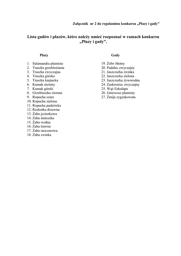 Załącznik nr 2 do regulaminu konkursu „Płazy i gady” Lista gadów i płazów, które należy umieć rozpoznać w ramach konkursu „Płazy i gady”. Płazy 1. Salamandra plamista 2. Traszka grzebieniasta 3. Traszka zwyczajna 4. Traszka górska 5. Traszka karpacka 6. Kumak nizinny 7. Kumak górski 8. Grzebiuszka ziemna 9. Ropucha szara 10. Ropucha zielona 11. Ropucha paskówka 12. Rzekotka drzewna 13. Żaba jeziorkowa 14. Żaba śmieszka 15. Żaba wodna 16. Żaba trawna 17. Żaba moczarowa 18. Żaba zwinka Gady 19. Żółw błotny 20. Padalec zwyczajny 21. Jaszczurka zwinka 22. Jaszczurka zielona 23. Jaszczurka żyworodna 24. Zaskroniec zwyczajny 25. Wąż Eskulapa 26. Gniewosz plamisty 27. Żmija zygzakowata