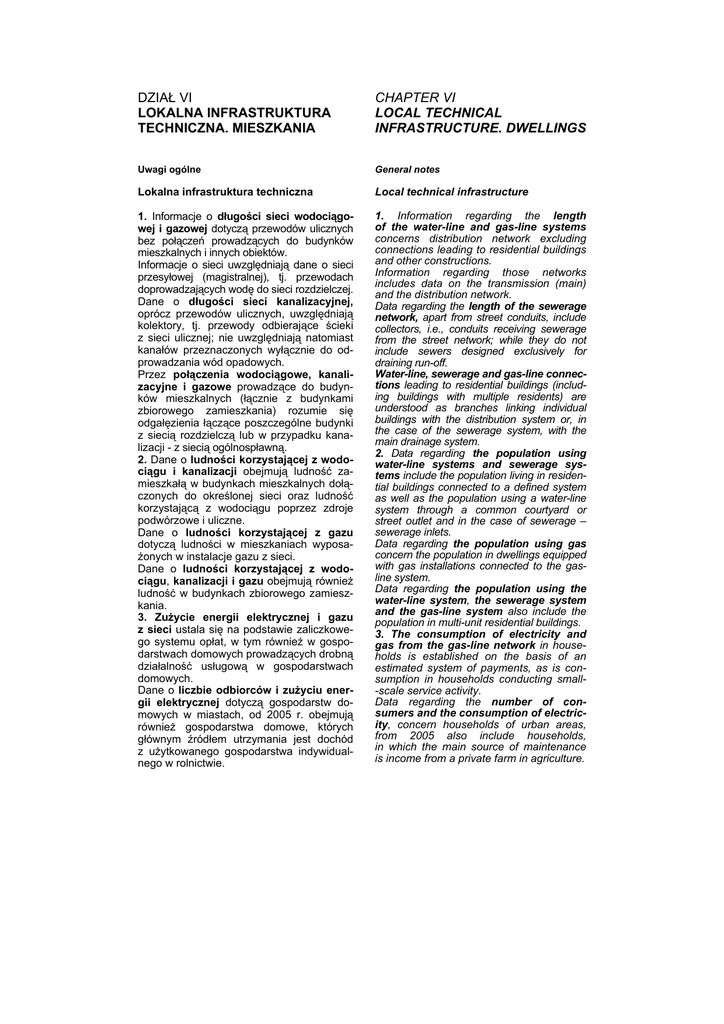 DZIAŁ VI LOKALNA INFRASTRUKTURA TECHNICZNA. MIESZKANIA CHAPTER VI LOCAL TECHNICAL INFRASTRUCTURE. DWELLINGS Uwagi ogólne General notes Lokalna infrastruktura techniczna Local technical infrastructure 1. Informacje o długości sieci wodociągowej i gazowej dotyczą przewodów ulicznych bez połączeń prowadzących do budynków mieszkalnych i innych obiektów. Informacje o sieci uwzględniają dane o sieci przesyłowej (magistralnej), tj. przewodach doprowadzających wodę do sieci rozdzielczej. Dane o długości sieci kanalizacyjnej, oprócz przewodów ulicznych, uwzględniają kolektory, tj. przewody odbierające ścieki z sieci ulicznej; nie uwzględniają natomiast kanałów przeznaczonych wyłącznie do odprowadzania wód opadowych. Przez połączenia wodociągowe, kanalizacyjne i gazowe prowadzące do budynków mieszkalnych (łącznie z budynkami zbiorowego zamieszkania) rozumie się odgałęzienia łączące poszczególne budynki z siecią rozdzielczą lub w przypadku kanalizacji - z siecią ogólnospławną. 2. Dane o ludności korzystającej z wodociągu i kanalizacji obejmują ludność zamieszkałą w budynkach mieszkalnych dołączonych do określonej sieci oraz ludność korzystającą z wodociągu poprzez zdroje podwórzowe i uliczne. Dane o ludności korzystającej z gazu dotyczą ludności w mieszkaniach wyposażonych w instalacje gazu z sieci. Dane o ludności korzystającej z wodociągu, kanalizacji i gazu obejmują również ludność w budynkach zbiorowego zamieszkania. 3. Zużycie energii elektrycznej i gazu z sieci ustala się na podstawie zaliczkowego systemu opłat, w tym również w gospodarstwach domowych prowadzących drobną działalność usługową w gospodarstwach domowych. Dane o liczbie odbiorców i zużyciu energii elektrycznej dotyczą gospodarstw domowych w miastach, od 2005 r. obejmują również gospodarstwa domowe, których głównym źródłem utrzymania jest dochód z użytkowanego gospodarstwa indywidualnego w rolnictwie. 1. Information regarding the length of the water-line and gas-line systems concerns distribution network excluding connections leading to residential buildings and other constructions. Information regarding those networks includes data on the transmission (main) and the distribution network. Data regarding the length of the sewerage network, apart from street conduits, include collectors, i.e., conduits receiving sewerage from the street network; while they do not include sewers designed exclusively for draining run-off. Water-line, sewerage and gas-line connections leading to residential buildings (including buildings with multiple residents) are understood as branches linking individual buildings with the distribution system or, in the case of the sewerage system, with the main drainage system. 2. Data regarding the population using water-line systems and sewerage systems include the population living in residential buildings connected to a defined system as well as the population using a water-line system through a common courtyard or street outlet and in the case of sewerage – sewerage inlets. Data regarding the population using gas concern the population in dwellings equipped with gas installations connected to the gasline system. Data regarding the population using the water-line system, the sewerage system and the gas-line system also include the population in multi-unit residential buildings. 3. The consumption of electricity and gas from the gas-line network in households is established on the basis of an estimated system of payments, as is consumption in households conducting small-scale service activity. Data regarding the number of consumers and the consumption of electricity, concern households of urban areas, from 2005 also include households, in which the main source of maintenance is income from a private farm in agriculture. 160 Lokalna infrastruktura techniczna. Mieszkania 4. Informacje z zakresu ciepłownictwa obejmują budynki mieszkalne oraz urzędy i instytucje ogrzewane centralnie za pośrednictwem sieci przesyłowej rozumianej jako układ instalacji połączonych i współpracujących ze sobą, służące do przesyłania i dystrybucji czynnika grzejnego do odbiorcy zgodnie z ustawą z dnia 10 IV 1997 r. Prawo energetyczne (Dz. U. Nr 54, poz. 348) z późniejszymi zmianami. Dane w tabl. 4/66 dotyczą budynków i lokali ogrzewanych przy pomocy urządzeń jednostek gospodarki komunalnej i mieszkaniowej oraz spółdzielni mieszkaniowych i zakładów pracy, niezależnie od źródeł wytwarzania energii cieplnej (własnych lub obcych). Kotłownia to budynek lub pomieszczenie wraz z ustawionymi w nim kotłami oraz urządzeniami służącymi do wytwarzania energii cieplnej na cele grzewcze lub ogrzewania i równoczesnego dostarczania ciepłej wody. Od 2001 r. dane z zakresu ciepłownictwa obejmują wszystkie podmioty, którym nadano koncesje na przesył i dystrybucję energii cieplnej, co stanowić może ich pozostały rodzaj działalności. Ma to odbicie w liczbie kotłowni, gdzie uwzględniono wszystkie kotłownie produkujące ciepło na cele grzewcze. 5. Dane o odpadach komunalnych dotyczą odpadów powstających w gospodarstwach domowych, a także u innych wytwórców odpadów (bez odpadów niebezpiecznych), które ze względu na swój charakter lub skład są podobne do odpadów powstających w gospodarstwach domowych. Informacje o odpadach komunalnych podaje się zgodnie z rozporządzeniem Ministra Środowiska z dnia 27 IX 2001 r. w sprawie katalogu odpadów (Dz. U. Nr 112, poz. 1206). 6. Dane o nieczystościach ciekłych dotyczą nieczystości pochodzących z gospodarstw domowych (budynków mieszkalnych), budynków użyteczności publicznej oraz budynków jednostek prowadzących działalność gospodarczą – w przypadku gdy nie są odprowadzane siecią kanalizacyjną. Mieszkania 1. Informacje o zasobach mieszkaniowych i mieszkaniach oddanych do użytkowania dotyczą mieszkań, a także izb i powierzc
