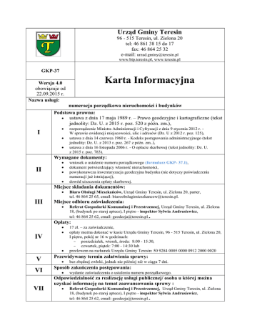 Urząd Gminy Teresin 96 - 515 Teresin, ul. Zielona 20 tel: 46 861 38 15 do 17 fax: 46 864 25 32 e-mail: [email protected] www.bip.teresin.pl, www.teresin.pl GKP-37 Karta Informacyjna Wersja 4.0 obowiązuje od 22.09.2015 r. Nazwa usługi: numeracja porządkowa nieruchomości i budynków Podstawa prawna: ustawa z dnia 17 maja 1989 r. – Prawo geodezyjne i kartograficzne (tekst jednolity: Dz. U. z 2015 r. poz. 520 z późn. zm.), I rozporządzenie Ministra Administracji i Cyfryzacji z dnia 9 stycznia 2012 r. W sprawie ewidencji miejscowości, ulic i adresów (Dz. U z 2012 r. poz. 125), ustawa z dnia 14 czerwca 1960 r. - Kodeks postępowania administracyjnego (tekst jednolity: Dz. U. z 2013 r. poz. 267 z późn. zm..), ustawa z dnia 16 listopada 2006 r. - O opłacie skarbowej (tekst jednolity: Dz. U. z 2015 r. poz. 783). Wymagane dokumenty: II wniosek o ustalenie numeru porządkowego (formularz GKP- 37.1), dokument potwierdzający własność nieruchomości, powykonawcza inwentaryzacja geodezyjna budynku (nie dotyczy poświadczenia numeracji już istniejącej), dowód uiszczenia opłaty skarbowej. Miejsce składania dokumentów: III Biuro Obsługi Mieszkańców, Urząd Gminy Teresin, ul. Zielona 20, parter, tel. 46 864 25 65, email: [email protected]. Miejsce odbioru zaświadczenia: Referat Gospodarki Komunalnej i Przestrzennej, Urząd Gminy Teresin, ul. Zielona 18, (budynek po starej aptece), I piętro - inspektor Sylwia Andrusiewicz, tel: 46 864 25 62, email: [email protected].. Opłaty: IV V VI VII 17 zł. – za zaświadczenie, opłaty można dokonać w kasie Urzędu Gminy Teresin, 96 - 515 Teresin, ul. Zielona 20, I piętro, pokój nr 16 w godzinach: - poniedziałek, wtorek, środa: 8:00 - 15:30, - czwartek, piątek: 7:00 - 14:30 lub przelewem na rachunek Urzędu Gminy Teresin: 50 9284 0005 0000 0912 2000 0020 Przewidywany termin załatwienia sprawy: bez zbędnej zwłoki, jednak nie później niż w ciągu 7 dni. Sposób zakończenia postępowania: wydanie zaświadczenia o ustaleniu numeru porządkowego. Odpowiedzialność za realizację usługi publicznej/ osoba u której można uzyskać informację na temat zaawansowania sprawy : Referat Gospodarki Komunalnej i Przestrzennej, Urząd Gminy Teresin, ul. Zielona 18, (budynek po starej aptece), I piętro - inspektor Sylwia Andrusiewicz, tel: 46 864 25 62, email: [email protected].. VIII IX Tryb odwoławczy: brak. Dodatkowe informacje: usługa dotyczy ustalenia nowej numeracji porządkowej oraz poświadczenia numeracji już istniejącej. Uwagi: X Opracowała: Ewa Rogala wniosek niezgodny z wzorem załączonego formularza GKP-37.1, zawierający informacje określone w niniejszej karcie jest również wnioskiem spełniającym ustalone wymagania, w przypadku braku kompletu wymaganych dokumentów wnioskodawca zostaje wezwany do ich uzupełnienia, wnioski nie uzupełnione w terminie, pozostawia się bez rozpatrzenia, interesanci w sprawie skarg i wniosków dotyczących działalności Urzędu Gminy Teresin przyjmowani są przez: - wójta Gminy w każdy wtorek w godzinach: 10 - 14, - zastępcę wójta Gminy w każdy piątek w godzinach: 10 - 14, - sekretarza Gminy w każdą środę w godzinach: 12 - 16. Zaopiniował: Andrzej Jaworski Zaakceptowała: Grażyna Cierpis-Przysucha Godziny pracy Urzędu Gminy Teresin: poniedziałek, wtorek: 8 - 16, środa: 8 - 16, (dyżur: Biuro Obsługi Mieszkańców do 18), czwartek, piątek: 7 - 15. Zatwierdził: Marek Olechowski