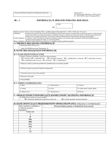 1.Numer Identyfikacji Podatkowej składającego informację Załącznik Nr 1 do Uchwały Rady Miejskiej we Włoszczowie Nr .XXV/199/05 z dnia 29 listopada 2005 r. ................................................................................................... IR – 1 INFORMACJA W SPRAWIE PODATKU ROLNEGO 2. Rok na Podstawa prawna: Ustawa z dnia 15 listopada 1984 r. o podatku rolnym (Tekst jedn. Dz.U. z 1993 r. Nr 94, poz. 431 ze zm.) Składający: Formularz przeznaczony dla osób fizycznych będących właścicielami gruntów, posiadaczami samoistnymi gruntów, użytkownikami wieczystymi gruntów, posiadaczami gruntów na podstawie umowy zawartej stosownie do przepisów o ubezpieczeniu społecznym rolników oraz posiadaczami gruntów stanowiących własność Skarbu Państwa lub jednostki samorządu terytorialnego. Termin składania: W terminie 14 dni od zaistnienia okoliczności mających wpływ na powstanie, bądź wygaśnięcie obowiązku podatkowego lub zaistnienia zdarzeń mających wpływ na wysokość podatku. Miejsce składania: Burmistrz Gminy Włoszczowa właściwy ze względu na miejsce położenia gruntów. A. MIEJSCE SKŁADANIA INFORMACJI 3. Burmistrz Gminy Włoszczowa Adres 29-100 Włoszczowa ul. Partyzantów 14 B. DANE SKŁADAJĄCEGO INFORMACJĘ B.1 DANE IDENTYFIKACYJNE 4. Rodzaj własności, posiadania (zaznaczyć właściwą kratkę) 1. właściciel 2. współwłaściciel 3. posiadacz samoistny 4. współposiadacz samoistny 6. współużytkownik wieczysty 7. posiadacz 8. współposiadacz 5. użytkownik wieczysty 5. Miejsce/a (adres/y) położenia przedmiotów opodatkowania oraz numer/y działek 6. Numer/y księgi wieczystej lub zbioru/ów dokumentów 7. Nazwisko, pierwsze imię, data urodzenia 8. Imię ojca, imię matki 9. Numer PESEL B.2 ADRES ZAMIESZKANIA 10. Kraj 11. Województwo 12. Powiat 13. Gmina 14. Ulica 15. Numer domu / Numer lokalu 16. Miejscowość 17. Kod pocztowy 18. Poczta C. OKOLICZNOŚCI POWODUJĄCE KONIECZNOŚĆ ZŁOŻENIA INFORMACJI 19. Okoliczności (zaznaczyć właściwą kratkę) 1. informacja składana po raz pierwszy na dany rok 2. korekta uprzednio złożonej informacji D. DANE DOTYCZĄCE PRZEDMIOTÓW OPODATKOWANIA (włącznie ze zwolnionymi) Klasy użytków wynikające z Powierzchnia gruntu w hektarach fizycznych ewidencji gruntów i budynków Grunty orne I II IIIa IIIb IVa IVb V VI VIz Sady I II IIIa IIIb IVa IVb V VI VIz Użytki zielone I II III IV V VI VIz Grunty rolne zabudowane I II IIIa III IIIb IVa IV IVb V VI VIz Grunty pod stawami a) zarybione, łososiem, trocią, głowacicą, palią i pstrągiem b) zarybione innymi gatunkami ryb niż w poz. a) c) grunty pod stawami niezarybionymi Rowy Grunty zadrzewione i zakrzaczone położone na UR I II IIIa III IIIb IVa IV V VI VIz Razem E. INFORMACJA O PRZEDMIOTACH ZWOLNIONYCH (podać rodzaj, klasę i powierzchnię gruntów zwolnionych oraz przepis prawa - z jakiego tytułu występuje zwolnienie) F. OŚWIADCZENIE I PODPIS SKŁADAJĄCEGO / OSOBY REPREZENTUJĄCEJ SKŁADAJĄCEGO Oświadczam, że podane przeze mnie dane są zgodne z prawdą. 20. Imię 22. Data wypełnienia (dzień - miesiąc - rok) 21. Nazwisko 23. Podpis (pieczęć) składającego / osoby reprezentującej składającego G. ADNOTACJE ORGANU PODATKOWEGO 24. Uwagi organu podatkowego 25. Identyfikator przyjmującego formularz 26. Data i podpis przyjmującego formularz Objaśnienia Opodatkowaniu podatkiem rolnym podlegają grunty sklasyfikowane w ewidencji gruntów i budynków jako użytki rolne lub jako grunty zadrzewione i zakrzewione na użytkach rolnych, z wyjątkiem gruntów zajętych na prowadzenie działalności gospodarczej innej niż działalność rolnicza. Za gospodarstwo rolne uważa się obszar gruntów podlegających opodatkowaniu podatkiem rolnym, o łącznej powierzchni przekraczającej 1 ha lub 1 ha przeliczeniowy , stanowiących własność lub znajdujących się w posiadaniu osoby fizycznej, osoby prawnej albo jednostki organizacyjnej , w tym spółki , nie posiadającej osobowości prawnej. Podstawę opodatkowania podatkiem rolnym stanowi : 1/dla gruntów gospodarstw rolnych - liczba ha przeliczeniowych ustalana na podstawie powierzchni, rodzajów i klas użytków rolnych wynikających z ewidencji gruntów i budynków oraz zaliczenia do okręgu podatkowego. 2/dla pozostałych gruntów / nie stanowiących gospodarstwa rolnego/ – liczba hektarów wynikająca z ewidencji gruntów i budynków . Jeżeli grunty stanowią współwłasność lub znajdują się w posiadaniu dwóch lub więcej podmiotów, to stanowią odrębny przedmiot opodatkowania podatkiem rolnym. Jeżeli grunty stanowią współwłasność lub znajdują się w posiadaniu osób fizycznych oraz osób prawnych , jednostek organizacyjnych, w tym spółek, nie posiadających osobowości prawnej – osoby fizyczne składają deklarację na podatek rolny oraz opłacają podatek na zasadach obowiązujących osoby prawne. Osoby fizyczne , są obowiązane złożyć właściwemu organowi podatkowemu informacje o gruntach, sporządzone na formularzach według ustalonego wzoru w terminie 14 dni od dnia zaistnienia okoliczności uzasadniających powstanie albo wygaśnięcie obowiązku podatkowego w zakresie podatku rolnego, lub zaistnieniu zmian. Obowiązek składania informacji o gruntach dotyczy również podatników korzystających ze zwolnień i ulg na podstawie przepisów ustawy.