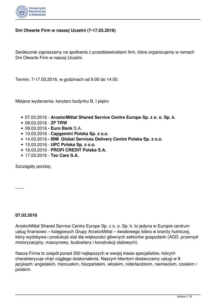 Dni Otwarte Firm w naszej Uczelni (7-17.03.2016) Serdecznie zapraszamy na spotkania z przedstawicielami firm, które organizujemy w ramach Dni Otwarte Firm w naszej Uczelni. Termin: 7-17.03.2016, w godzinach od 9.00 do 14.00. Miejsce wydarzenia: korytarz budynku B, I piętro 07.03.2016 - ArcelorMittal Shared Service Centre Europe Sp. z o. o. Sp. k. 08.03.2016 - ZF TRW 09.03.2016 - Euro Bank S.A. 10.03.2016 - Capgemini Polska Sp. z o.o. 14.03.2016 - IBM Global Services Delivery Centre Polska Sp. z o.o. 15.03.2016 - UPC Polska Sp. z o.o. 16.03.2016 - PROFI CREDIT Polska S.A. 17.03.2016 - Tax Care S.A. Szczegóły poniżej. ----- 07.03.2016 ArcelorMittal Shared Service Centre Europe Sp. z o. o. Sp. k. to jedyne w Europie centrum usług finansowo – księgowych Grupy ArcelorMittal – światowego lidera w branży hutniczej, który wydobywa i produkuje stal dla większości głównych sektorów gospodarki (AGD, przemysł motoryzacyjny, maszynowy, budowlany i konstrukcji stalowych). Nasza Firma to zespół ponad 300 najlepszych w swojej klasie specjalistów, których charakteryzuje chęć ciągłego doskonalenia. Naszym klientom dostarczamy usługi w 8 językach: angielskim, francuskim, hiszpańskim, włoskim, niderlandzkim, niemieckim, czeskim i polskim. strona 1 / 8 Oprócz kompetencji księgowych i językowych w SSCE cenimy motywację, umiejętność pracy zespołowej oraz otwartość. Pracę i praktyki oferujemy w działach: Księgowość Małych i Średnich Przedsiębiorstw Księgowość Finansowa Zespół Ciągłego Doskonalenia ----- 08.03.2016 TRW Steering Systems Poland Sp. z o. o. W 2015 roku firma TRW Automotive została połączona z globalnym dostawcą branży motoryzacyjnej ZF Friedrichshafen AG. ZF TRW stanowi teraz oddział spółki głównej, z siedzibą w Livonii, Michigan. ZF TRW będąc wiodącym projektantem oraz producentem aktywnych i pasywnych systemów bezpieczeństwa obsługuje wszystkich największych producentów pojazdów samochodowych na całym świecie. Nasza firma posiada placówki w ponad 40 krajach, zatrudnia około 134 tysiące osób. Świat motoryzacyjnych systemów bezpieczeństwa gwałtownie się zmienia, a integracja aktywnych i pasywnych układów staje się podstawą automatyzacji jazdy. ZF TRW już dzisiaj zapewnia systemy wspomagania kierowcy i półautomatyczne systemy pozwalające na adaptacyjną kontrolę prędkości, utrzymywanie pojazdu na pasie ruchu, wykrywanie martwych pól, awaryjne wspomaganie zarówno sterowania, jak i hamowania oraz łagodzenie skutków kolizji. Jeśli chcesz dowiedzieć się więcej zajrzyj na naszą stronę http://www.trw.pl/ strona 2 / 8 ----- 09.03.2016 Eurobank S.A. Jesteśmy bankiem nowoczesnych produktów i rozwiązań dla klientów detalicznych. Tworzymy zgrany zespół specjalistów z doświadczeniem w wielu dziedzinach. Zatrudniamy ponad 3000 osób. Centrala eurobanku mieści się na wrocławskim Rynku, a na terenie Polski posiadamy sieć ponad 400 oddziałów własnych i franczyzowych. Wybrało nas ponad 1,5 miliona klientów. Nasza praca została wielokrotnie doceniona. Jesteśmy laureatem wielu nagród, m.in.: Inwestor w Kapitał Ludzki za wdrażanie najlepszych praktyk zarządzania ludźmi Pracodawca Godny Zaufania za ciekawe i skuteczne rozwiązania w zakresie polityki pracowniczej. Od 2005 r. jesteśmy częścią jednej z największych francuskich grup kapitałowych Société Générale (SG). Grupa Société Générale w Europie Środkowej i Wschodniej posiada ponad 10 milionów klientów i 3000 oddziałów. Na całym świecie zatrudnia ponad 157 000 pracowników, a w Polsce ponad 3600 osób. ----- 10.03.2016 Capgemini Polska Sp. z o. o. to przede wszystkim różnorodność. Możesz razem z nami tworzyć najnowocześniejsze rozwiązania dla wielu branż i korzystać ze wsparcia zespołów ekspertów o niezwykle szerokim zakresie kompetencji - od międzynarodowej księgowości aż strona 3 / 8 do zaawansowanych systemów IT. Tworzymy i dostarczamy cyfrowe i technologiczne rozwiązania biznesowe, które pomagają naszym klientom osiągać założone cele, zapewniając innowację i konkurencyjność. W Katowicach w Centrum Business Process Outsourcing świadczymy usługi z zakresu: finansów, księgowości, operacji bankowych, HR obsługi klienta, marketingu, zarządzania łańcuchem dostaw. 14.03.2016 IBM Global Services Delivery Centre Polska Sp. z o.o. jest jednym z największych na świecie koncernów informatycznych. Na całym świecie zatrudnia prawie 400 tyś. pracowników. W Polsce działa od 1991 r., główna siedziba firmy znajduje się w Warszawie, natomiast oddziały, między innymi w Gdańsku, Katowicach, Krakowie, Poznaniu i Wrocławiu. W opinii specjalistów i menedżerów firma IBM zalicza się do najlepszych pracodawców w Polsce. Firma IBM Polska angażuje się w projekty społeczne, między innymi, w projekt Inicjatywa Akademicka wspierając tym samym edukację w zakresie nowoczesnych technologii, ale także umożliwiając współpracę przedsiębiorstw z uczelniami wyższymi z całego świata. IBM Global Services Delivery Centre Polska Sp. z o.o. świadczy szeroki zakres usług IT, takich jak: zarządzanie systemami operacyjnymi serwerów, ochrony i bezpieczeństwa systemów, usługi dla klientów końcowych, w tym usługi utrzymania i monitorowania sprzętu IT oraz systemów oprogramowania. 15.03.2016 UPC Polska - jesteśmy liderem cyfrowych usług kablowych. Należymy do największego międzynarodowego operatora telewizji kablowej na świecie – Liberty Global. Dostarczamy Klientom usługi na najwyższym poziomie: najszybszy Internet w Polsce o prędkości do 300/30 Mb/s, nowatorskie rozwiązania w zakresie zaawansowanych usług telefonicznych, telewizję z ponad 190 kanałów telewizyjnych cyfrowej jakości, w tym aż 47 w HD. Jeśli zależy Ci na pracy w przyjaznej atmosferze ,a jednocześnie chciałbyś osiągnąć strona 4 / 8 stabilizację zawodową w firmie z ugruntowaną pozycją