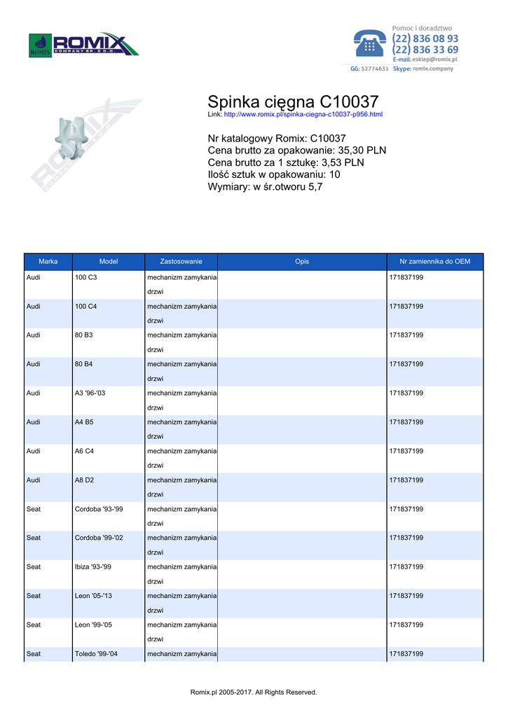 Spinka cięgna C10037 Link: http://www.romix.pl/spinka-ciegna-c10037-p956.html Nr katalogowy Romix: C10037 Cena brutto za opakowanie: 35,30 PLN Cena brutto za 1 sztukę: 3,53 PLN Ilość sztuk w opakowaniu: 10 Wymiary: w śr.otworu 5,7 Marka Audi Model 100 C3 Zastosowanie Opis mechanizm zamykania Nr zamiennika do OEM 171837199 drzwi Audi 100 C4 mechanizm zamykania 171837199 drzwi Audi 80 B3 mechanizm zamykania 171837199 drzwi Audi 80 B4 mechanizm zamykania 171837199 drzwi Audi A3 '96-'03 mechanizm zamykania 171837199 drzwi Audi A4 B5 mechanizm zamykania 171837199 drzwi Audi A6 C4 mechanizm zamykania 171837199 drzwi Audi A8 D2 mechanizm zamykania 171837199 drzwi Seat Cordoba '93-'99 mechanizm zamykania 171837199 drzwi Seat Cordoba '99-'02 mechanizm zamykania 171837199 drzwi Seat Ibiza '93-'99 mechanizm zamykania 171837199 drzwi Seat Leon '05-'13 mechanizm zamykania 171837199 drzwi Seat Leon '99-'05 mechanizm zamykania 171837199 drzwi Seat Toledo '99-'04 mechanizm zamykania Romix.pl 2005-2017. All Rights Reserved. 171837199 drzwi Skoda różne modele Skoda mechanizm zamykania 171837199 drzwi VW Caddy '04-'08 mechanizm zamykania 171837199 drzwi VW Caddy '08- mechanizm zamykania 171837199 drzwi VW Corrado mechanizm zamykania 171837199 drzwi VW Golf I mechanizm zamykania 171837199 drzwi VW Golf II mechanizm zamykania 171837199 drzwi VW Golf III mechanizm zamykania 171837199 drzwi VW Jetta I mechanizm zamykania 171837199 drzwi VW Jetta II mechanizm zamykania 171837199 drzwi VW Lupo mechanizm zamykania 171837199 drzwi VW Passat B2 mechanizm zamykania 171837199 drzwi VW Passat B3 mechanizm zamykania 171837199 drzwi VW Passat B4 mechanizm zamykania 171837199 drzwi VW Polo '95-'01 mechanizm zamykania 171837199 drzwi VW T4 mechanizm zamykania 171837199 drzwi VW Vento mechanizm zamykania drzwi Romix.pl 2005-2017. All Rights Reserved. 171837199