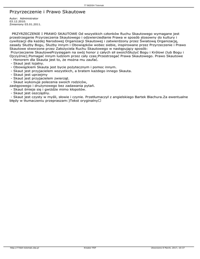 77 BGDSH Tolemak Przyrzeczenie i Prawo Skautowe Autor: Administrator 03.12.2010. Zmieniony 03.01.2011. PRZYRZECZENIE I PRAWO SKAUTOWE Od wszystkich członków Ruchu Skautowego wymagane jest przestrzeganie Przyrzeczenia Skautowego i odzwierciedlanie Prawa w sposób stosowny do kultury i cywilizacji dla każdej Narodowej Organizacji Skautowej i zatwierdzony przez Światową Organizację, zasady Służby Bogu, Służby innym i Obowiązków wobec siebie, inspirowane przez Przyrzeczenie i Prawo Skautowe stworzone przez Założyciela Ruchu Skautowego w następujący sposób: Przyrzeczenie SkautowePrzysięgam na swój honor z całych sił swoichSłużyć Bogu i Królowi (lub Bogu i Ojczyźnie);Pomagać innym ludziom przez cały czas;Przestrzegać Prawa Skautowego. Prawo Skautowe - Honorem dla Skauta jest to, że można mu zaufać. - Skaut jest lojalny. - Obowiązkiem Skauta jest bycie pożytecznym i pomoc innym. - Skaut jest przyjacielem wszystkich, a bratem każdego innego Skauta. - Skaut jest uprzejmy - Skaut jest przyjacielem zwierząt. - Skaut wykonuje polecenia swoich rodziców, zastępowego i drużynowego bez zadawania pytań. - Skaut śmieje się i gwiżdże mimo kłopotów. - Skaut jest oszczędny. - Skaut jest czysty w myśli, słowie i czynie. Przetłumaczył z angielskiego Bartek Blachura.Za ewentualne błędy w tłumaczeniu przepraszam:)Tekst oryginalny» http://77dsh-tolemak.cba.pl Kreator PDF Utworzono 8 March, 2017, 10:37