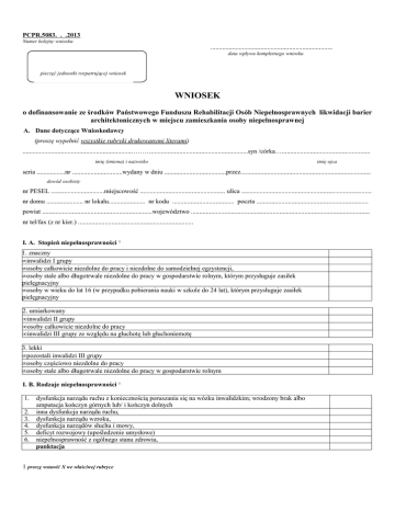 PCPR.5083. . .2013 Numer kolejny wniosku ......................................................................... data wpływu kompletnego wniosku pieczęć jednostki rozpatrującej wniosek WNIOSEK o dofinansowanie ze środków Państwowego Funduszu Rehabilitacji Osób Niepełnosprawnych likwidacji barier architektonicznych w miejscu zamieszkania osoby niepełnosprawnej A. Dane dotyczące Wnioskodawcy (proszę wypełnić wszystkie rubryki drukowanymi literami) .................................................................………..........................................................syn /córka…..................................................... imię (imiona) i nazwisko imię ojca seria .................nr ..............................wydany w dniu .....................................przez.............................................................................. dowód osobisty nr PESEL ................................miejscowość ................................................... ulica .............................................................................. nr domu ...................... nr lokalu...................... nr kodu ..................................... poczta ................................................................... powiat ..................................................................województwo ........................................................................................................... nr tel/fax (z nr kier.) ..................................................................... I. A. Stopień niepełnosprawności ¹ 1. znaczny • inwalidzi I grupy • osoby całkowicie niezdolne do pracy i niezdolne do samodzielnej egzystencji, • osoby stale albo długotrwale niezdolne do pracy w gospodarstwie rolnym, którym przysługuje zasiłek pielęgnacyjny • osoby w wieku do lat 16 (w przypadku pobierania nauki w szkole do 24 lat), którym przysługuje zasiłek pielęgnacyjny 2. umiarkowany • inwalidzi II grupy • osoby całkowicie niezdolne do pracy • inwalidzi III grupy ze względu na głuchotę lub głuchoniemotę 3. lekki • pozostali inwalidzi III grupy • osoby częściowo niezdolne do pracy • osoby stale albo długotrwale niezdolne do pracy w gospodarstwie rolnym I. B. Rodzaje niepełnosprawności ¹ 1. 2. 3. 4. 5. 6. dysfunkcja narządu ruchu z koniecznością poruszania się na wózku inwalidzkim; wrodzony brak albo amputacja kończyn górnych lub/ i kończyn dolnych inna dysfunkcja narządu ruchu, dysfunkcja narządu wzroku, dysfunkcja narządów słuchu i mowy, deficyt rozwojowy (upośledzenie umysłowe) niepełnosprawność z ogólnego stanu zdrowia, punktacja 1 proszę wstawić X we właściwej rubryce 1 II. Sytuacja zawodowa ¹ 1. 2. 3. 4. 5. zatrudniony*/ prowadzący działalność gospodarcza* osoba w wieku od 18 do 24 ucząca się w systemie szkolnym lub studiująca* bezrobotny poszukujący pracy* / rencista poszukujący pracy* rencista* / emeryt* nie zainteresowany podjęciem pracy dzieci i młodzież do 18 punktacja III. A Sytuacja mieszkaniowa – warunki mieszkaniowe (wypełnia pracownik PCPR) ¹ 1. 2. 3. 4. złe przeciętne dobre bardzo dobre punktacja III. B. Sytuacja mieszkaniowa – opis budynku i mieszkania 1. 2. 3. 4. 5. 6. 7. 8. dom jednorodzinny*, wielorodzinny prywatny*, wielorodzinny komunalny*, wielorodzinny spółdzielczy* inne .............…………………………………………………………………………………….……....………………….............. budynek parterowy* piętrowy* mieszkanie na …………………………………................................(proszę podać kondygnacje) przybliżony wiek budynku lub rok budowy ………....……...………… opis mieszkania ; pokoje ............................ (podać liczbę), z kuchnią*, bez kuchni*, z łazienka* , bez łazienki * z wc*, bez wc* łazienka jest wyposażona w: wannę*, brodzik*, kabinę prysznicową*, umywalka* w mieszkaniu jest: instalacja wody zimnej*, ciepłej*, kanalizacja*, centralne ogrzewanie*, prąd*, gaz* inne informacje o warunkach mieszkaniowych................................................................................................................................ .......................................................................................................................................................................................................... .......................................................................................................................................................................................................... III. C. Sytuacja mieszkaniowa – zamieszkuje 1 1. samotnie 2. z rodziną 3. z osobami niespokrewnionymi punktacja III. D. Osoby pozostające we wspólnym gospodarstwie domowym z Wnioskodawcą ( w tym osoby niepełnosprawne) niepełnosprawność dochód miesięczny netto Imię i nazwisko - pokrewieństwo (zł) 2 3 stopień rodzaj 1. 2. 3. 4. 5. 6. 7. 8. 9. 10. łączna punktacja za stopień i rodzaj niepełnosprawności osób pozostających we wspólnym gospodarstwie domowym 1 proszę wstawić X we właściwej rubryce proszę wstawić właściwe oznaczenie cyfrowe z tablicy I.A 3 proszę wstawić właściwe oznaczenie cyfrowe z tablicy I.B * niepotrzebne skreślić 2 2 IV. Przeciętny dochód miesięczny (netto)*** na osobę wspólnego gospodarstwa domowego Wnioskodawcy 1 1. poniżej 500,00zł 2. 501,00 – 700,00zł. 3. 701,00 – 900,00zł. 4. 901,00 – 1100,00zł. 5. powyżej 1 101,00 zł punktacja V. Przeciętny dochód miesięczny (netto)*** osoby samotnie zamieszkującej 1 1. poniżej 700,00zł 2. 701,00 – 900,00zł. 3. 901,00 – 1 100,00zł. 4. 1 1001,00 – 1 300,00zł. 5. powyżej 1 301,00 zł punktacja VI. Korzystanie ze środków finansowych Państwowego Funduszu Rehabilitacji Osób Niepełnosprawnych Nr i data zawarcia Przyznana Kwota Cel Termin rozliczenia Stan rozliczenia (kwota umo