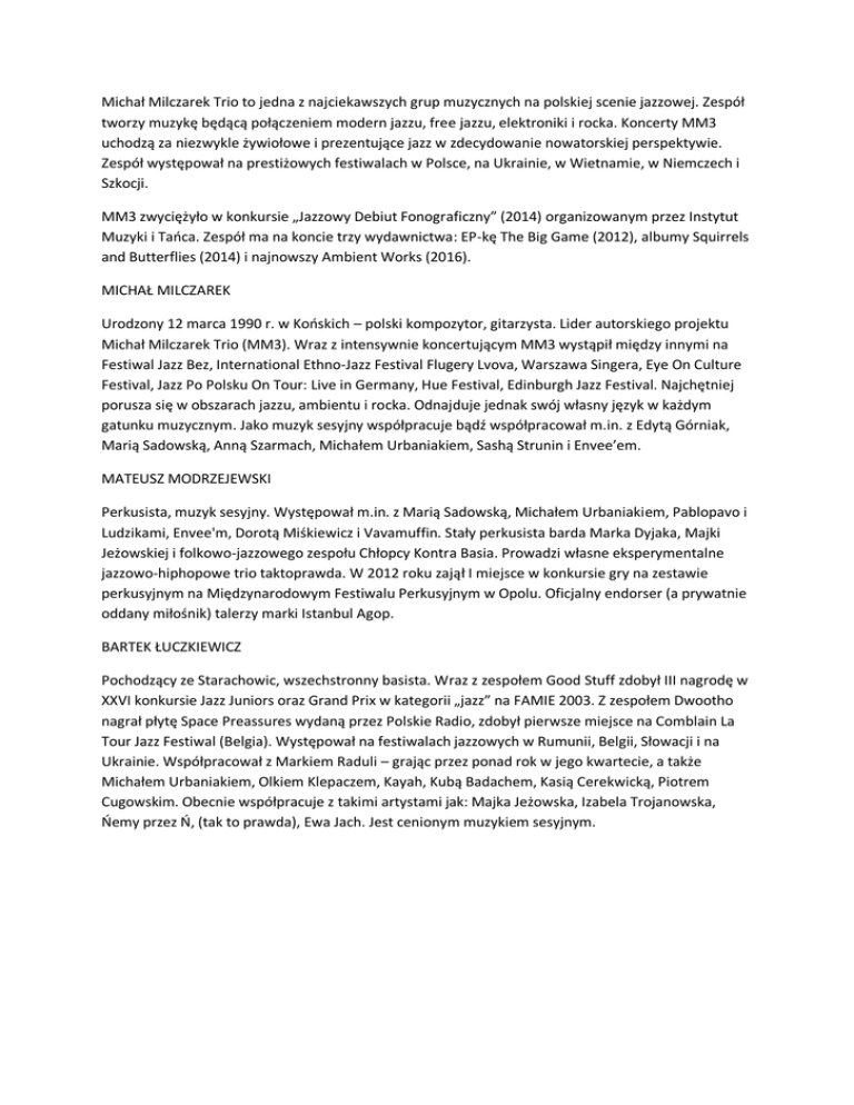 Michał Milczarek Trio to jedna z najciekawszych grup muzycznych na polskiej scenie jazzowej. Zespół tworzy muzykę będącą połączeniem modern jazzu, free jazzu, elektroniki i rocka. Koncerty MM3 uchodzą za niezwykle żywiołowe i prezentujące jazz w zdecydowanie nowatorskiej perspektywie. Zespół występował na prestiżowych festiwalach w Polsce, na Ukrainie, w Wietnamie, w Niemczech i Szkocji. MM3 zwyciężyło w konkursie „Jazzowy Debiut Fonograficzny” (2014) organizowanym przez Instytut Muzyki i Taoca. Zespół ma na koncie trzy wydawnictwa: EP-kę The Big Game (2012), albumy Squirrels and Butterflies (2014) i najnowszy Ambient Works (2016). MICHAŁ MILCZAREK Urodzony 12 marca 1990 r. w Kooskich – polski kompozytor, gitarzysta. Lider autorskiego projektu Michał Milczarek Trio (MM3). Wraz z intensywnie koncertującym MM3 wystąpił między innymi na Festiwal Jazz Bez, International Ethno-Jazz Festival Flugery Lvova, Warszawa Singera, Eye On Culture Festival, Jazz Po Polsku On Tour: Live in Germany, Hue Festival, Edinburgh Jazz Festival. Najchętniej porusza się w obszarach jazzu, ambientu i rocka. Odnajduje jednak swój własny język w każdym gatunku muzycznym. Jako muzyk sesyjny współpracuje bądź współpracował m.in. z Edytą Górniak, Marią Sadowską, Anną Szarmach, Michałem Urbaniakiem, Sashą Strunin i Envee’em. MATEUSZ MODRZEJEWSKI Perkusista, muzyk sesyjny. Występował m.in. z Marią Sadowską, Michałem Urbaniakiem, Pablopavo i Ludzikami, Envee'm, Dorotą Miśkiewicz i Vavamuffin. Stały perkusista barda Marka Dyjaka, Majki Jeżowskiej i folkowo-jazzowego zespołu Chłopcy Kontra Basia. Prowadzi własne eksperymentalne jazzowo-hiphopowe trio taktoprawda. W 2012 roku zajął I miejsce w konkursie gry na zestawie perkusyjnym na Międzynarodowym Festiwalu Perkusyjnym w Opolu. Oficjalny endorser (a prywatnie oddany miłośnik) talerzy marki Istanbul Agop. BARTEK ŁUCZKIEWICZ Pochodzący ze Starachowic, wszechstronny basista. Wraz z zespołem Good Stuff zdobył III nagrodę w XXVI konkursie Jazz Juniors oraz Grand Prix w kategorii „jazz” na FAMIE 2003. Z zespołem Dwootho nagrał płytę Space Preassures wydaną przez Polskie Radio, zdobył pierwsze miejsce na Comblain La Tour Jazz Festiwal (Belgia). Występował na festiwalach jazzowych w Rumunii, Belgii, Słowacji i na Ukrainie. Współpracował z Markiem Raduli – grając przez ponad rok w jego kwartecie, a także Michałem Urbaniakiem, Olkiem Klepaczem, Kayah, Kubą Badachem, Kasią Cerekwicką, Piotrem Cugowskim. Obecnie współpracuje z takimi artystami jak: Majka Jeżowska, Izabela Trojanowska, Oemy przez O, (tak to prawda), Ewa Jach. Jest cenionym muzykiem sesyjnym.