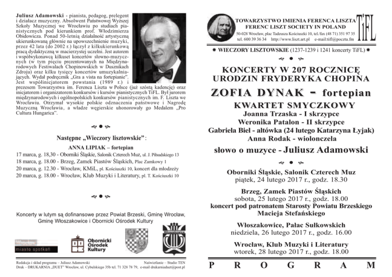 Juliusz Adamowski - pianista, pedagog, prelegent i działacz muzyczny. Absolwent Państwowej Wyższej Szkoły Muzycznej we Wrocławiu po studiach pianistycznych pod kierunkiem prof. Włodzimierza Obidowicza. Ponad 50-letnią działalność artystyczną ukierunkowaną głównie na upowszechnienie muzyki, przez 42 lata (do 2002 r.) łączył z kilkukierunkową pracą dydaktyczną w macierzystej uczelni. Jest autorem i współwykonawcą kilkuset koncertów słowno-muzycznych (w tym pięciu prezentowanych na Międzynarodowych Festiwalach Chopinowskich w Dusznikach Zdroju) oraz kilku tysięcy koncertów umuzykalniających. Wydał podręcznik „Gra a vista na fortepianie”. Jest współinicjatorem powstania (1989 r.) i prezesem Towarzystwa im. Ferenca Liszta w Polsce (już szóstą kadencję) oraz inicjatorem i organizatorem konkursów i kursów pianistycznych TiFL. Był jurorem międzynarodowych i ogólnopolskich konkursów pianistycznych im. F. Liszta we Wrocławiu. Otrzymał wysokie polskie odznaczenia państwowe i Nagrodę Muzyczną Wrocławia , a władze węgierskie uhonorowały go Medalem „Pro Cultura Hungarica”. l Następne „Wieczory lisztowskie”: ANNA LIPIAK – fortepian 17 marca, g. 18,30 - Oborniki Śląskie, Salonik Czterech Muz, ul. J. Piłsudskiego 13 18 marca, g. 18.00 - Brzeg, Zamek Piastów Śląskich, Plac Zamkowy 1 20 marca, g. 12.30 - Wrocław, KMiL, pl. Kościuszki 10, koncert dla młodzeży 20 marca, g. 18.00 - Wrocław, Klub Muzyki i Literatury, pl. T. Kościuszki 10 l Koncerty w lutym są dofinansowe przez Powiat Brzeski, Gminę Wrocław, Gminę Włoszakowice i Obornicki Ośrodek Kultury Redakcja i skład programu – Juliusz Adamowski Naświetlanie – Studio TEN Druk – DRUKARNIA „DUET” Wrocław, ul. Cybulskiego 35b tel. 71 328 78 79, e-mail [email protected] TOWARZYSTWO IMIENIA FERENCA LISZTA FERENC LISZT SOCIETY IN POLAND 50-028 Wrocław, plac Tadeusza Kościuszki 10, tel./fax (48 71) 351 97 35 tel. 600 39 36 34 http://www.liszt.art.pl e-mail:[email protected] TiFL WIECZORY LISZTOWSKIE (1237-1239 i 1241 koncerty TiFL) l KONCERTY W 207 ROCZNICĘ URODZIN FRYDERYKA CHOPINA ZOFIA DYNAK - for tepian KWARTET SMYCZKOWY Joanna Trzaska - I skrzypce Weronika Patalon - II skrzypce Gabriela Biel - altówka (24 lutego Katarzyna Łyjak) Anna Rodak - wiolonczela słowo o muzyce - Juliusz Adamowski l Oborniki Śląskie, Salonik Czterech Muz piątek, 24 lutego 2017 r., godz. 18.30 Brzeg, Zamek Piastów Śląskich sobota, 25 lutego 2017 r., godz. 18.00 koncert pod patronatem Starosty Powiatu Brzeskiego Macieja Stefańskiego Włoszakowice, Pałac Sułkowskich niedziela, 26 lutego 2017 r., godz. 16.00 P Wrocław, Klub Muzyki i Literatury wtorek, 28 lutego 2017 r., godz. 18.00 R O G R A M t P r o g r a FRYDERYK CHOPIN (1810 – 1849) Nokturn Es-dur op. 55 nr 2 Polonez es-moll op. 26 nr 2 4 Mazurki op. 17 nr 1 B-dur nr 2 e-moll nr 3 As-dur nr 4 a-moll 3 Etiudy op. 25 nr 10 h-moll nr 11 a-moll nr 12 c-moll przerwa Koncert fortepianowy e-moll op. 11 Allegro maestoso Romance. Larghetto Rondo. Vivace m Zofia Dynak naukę gry na fortepianie rozpoczęła w wieku 6 lat. W roku 2010 ukończyła z wyróżnieniem Państwową Szkołę Muzyczną II stopnia im. Ryszarda Bukowskiego we Wrocławiu w klasie fortepianu prof. Olgi Rusiny. Obecnie jest studentką (na roku dyplomowym) wrocławskiej Akademii Muzycznej im. K. Lipińskiego w klasie fortepianu prof. Zbigniewa Faryniarza. Swoje umiejętności doskonaliła podczas kursów mistrzowskich pod kierunkiem wielu wybitnych pianistówpedagogów: Dina Yoffe, Mamiko Suda, Andrzej Pikul, Andrzej Jasiński, Włodzimierz Obidowicz, Orla McDonagh, Alexei Orlovetsky, Mikhail Voskresensky, Aleksander Mazdykow, Biljana Jasic Radovanovic, Mikhail Markov, Muriel Chemin, Peep Lassmann, Silke-Thora Matties, Urszula Bartkiewicz, Rita Kinka, Aleksandra Zvirblyte, Euglen Indijc. Jest laureatką międzynarodowych konkursów pianistycznych, m.in. III nagrody na XVIII Międzynarodowym Konkursie Pianistycznym ,,Citta di Barletta” (Włochy, 2008), II nagrody na VII Międzynarodowym Konkursie Pianistycznym ,,Pia Tebaldini” (Włochy, 2009), sześciu nagród specjalnych IX Forum Pianistycznego „Bieszczady bez granic” (Sanok, 2014) i II Nagrody na Międzynarodowym Konkursie Muzycznym Grand Prize Virtuoso w Londynie (2016). Występuje również jako kameralistka i w tej kategorii zdobyła wyróżnienie na XV Międzynarodowym Konkursie Muzycznym im. Juliusza Zarębskiego (Izabelin-Łomianki-Warszawa, 2015). W jej bogatym dorobku artystycznym na uwagę zasługują: występy z Orkiestrą Filharmonii Łódzkiej na Festiwalu „Premia Filharmonii Łódzkiej”, udział w VI Ogólnopolskim Festiwalu Pianistycznym „Chopinowskie Interpretacje Młodych“ w Koninie, w cyklu „Młodzi Grają Chopina” organizowanym przez Filharmonię Wrocławską w ramach obchodów Roku Chopinowskiego, w cyklu koncertowym „Talenty w Muzeum Fryderyka Chopina w Warszawie”, występy w siedzibie Narodowej Orkiestry Symfonicznej Polskiego Radia w Katowicach, na 50. Festiwalu Pianistyki Polskiej w Słupsku oraz w Elgar Room, Royal Albert Hall w Londynie. Koncertowała w wielu miastach Polski, w Niemczech, Anglii, Francji oraz we Włoszech. W latach 2008 i 2009 otrzymała stypendium Prezydenta Miasta Wrocławia, a w latach 2014-2016 - stypendium Rektora Akademii Muzycznej we Wrocławiu dla najlepszych studentów.