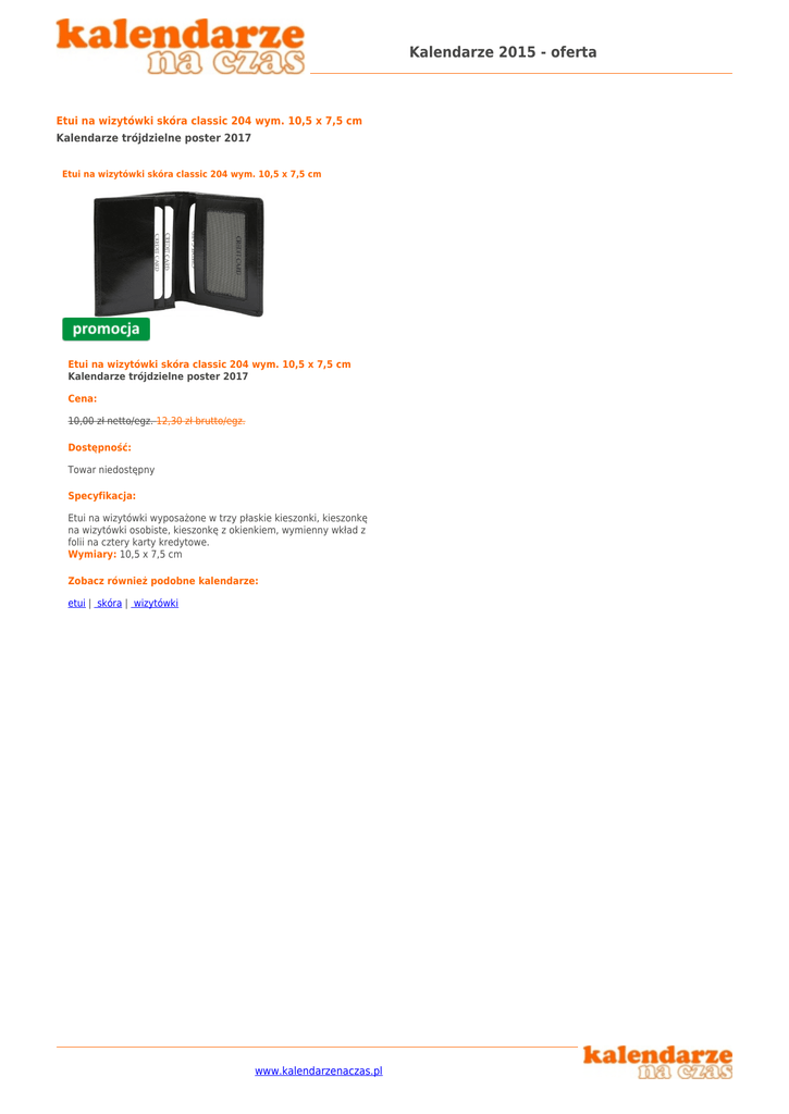 Kalendarze 2015 - oferta Etui na wizytówki skóra classic 204 wym. 10,5 x 7,5 cm Kalendarze trójdzielne poster 2017 Etui na wizytówki skóra classic 204 wym. 10,5 x 7,5 cm Etui na wizytówki skóra classic 204 wym. 10,5 x 7,5 cm Kalendarze trójdzielne poster 2017 Cena: 10,00 zł netto/egz. 12,30 zł brutto/egz. Dostępność: Towar niedostępny Specyfikacja: Etui na wizytówki wyposażone w trzy płaskie kieszonki, kieszonkę na wizytówki osobiste, kieszonkę z okienkiem, wymienny wkład z folii na cztery karty kredytowe. Wymiary: 10,5 x 7,5 cm Zobacz również podobne kalendarze: etui | skóra | wizytówki www.kalendarzenaczas.pl