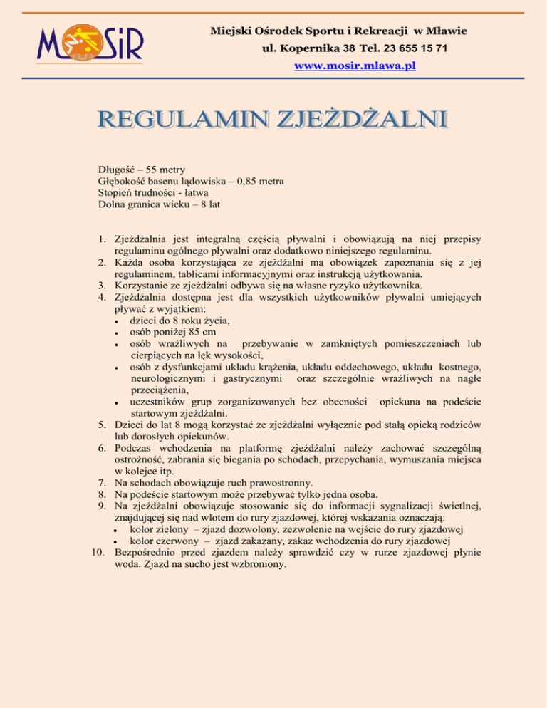 Miejski Ośrodek Sportu i Rekreacji w Mławie ul. Kopernika 38 Tel. 23 655 15 71 www.mosir.mlawa.pl Długość – 55 metry Głębokość basenu lądowiska – 0,85 metra Stopień trudności - łatwa Dolna granica wieku – 8 lat 1. Zjeżdżalnia jest integralną częścią pływalni i obowiązują na niej przepisy regulaminu ogólnego pływalni oraz dodatkowo niniejszego regulaminu. 2. Każda osoba korzystająca ze zjeżdżalni ma obowiązek zapoznania się z jej regulaminem, tablicami informacyjnymi oraz instrukcją użytkowania. 3. Korzystanie ze zjeżdżalni odbywa się na własne ryzyko użytkownika. 4. Zjeżdżalnia dostępna jest dla wszystkich użytkowników pływalni umiejących pływać z wyjątkiem: dzieci do 8 roku życia, osób poniżej 85 cm osób wrażliwych na przebywanie w zamkniętych pomieszczeniach lub cierpiących na lęk wysokości, osób z dysfunkcjami układu krążenia, układu oddechowego, układu kostnego, neurologicznymi i gastrycznymi oraz szczególnie wrażliwych na nagłe przeciążenia, uczestników grup zorganizowanych bez obecności opiekuna na podeście startowym zjeżdżalni. 5. Dzieci do lat 8 mogą korzystać ze zjeżdżalni wyłącznie pod stałą opieką rodziców lub dorosłych opiekunów. 6. Podczas wchodzenia na platformę zjeżdżalni należy zachować szczególną ostrożność, zabrania się biegania po schodach, przepychania, wymuszania miejsca w kolejce itp. 7. Na schodach obowiązuje ruch prawostronny. 8. Na podeście startowym może przebywać tylko jedna osoba. 9. Na zjeżdżalni obowiązuje stosowanie się do informacji sygnalizacji świetlnej, znajdującej się nad wlotem do rury zjazdowej, której wskazania oznaczają: kolor zielony – zjazd dozwolony, zezwolenie na wejście do rury zjazdowej kolor czerwony – zjazd zakazany, zakaz wchodzenia do rury zjazdowej 10. Bezpośrednio przed zjazdem należy sprawdzić czy w rurze zjazdowej płynie woda. Zjazd na sucho jest wzbroniony. 11. Zabrania się powodowania sytuacji zagrażających własnemu bezpieczeństwu, bezpieczeństwu innych osób korzystających ze zjeżdżalni i pływalni lub mogących spowodować nieszczęśliwy wypadek, a w szczególności: użytkowania zjeżdżalni w przypadku braku funkcjonowania sygnalizacji świetlnej, zamknięcia dostępu łańcuchem, liną, szlabanem lub w inny widoczny sposób, rozpoczynania ślizgu przy czerwonym świetle sygnalizacyjnym, wpychania osób do wnętrza rury zjazdowej, wykonywania ślizgu parami, w grupie oraz z małymi dziećmi, a w szczególności trzymanymi w ramionach na brzuchu wnoszenia do rynny jakichkolwiek przedmiotów oraz zjeżdżania z przedmiotami, mogącymi spowodować uszkodzenia ciała, a w szczególności: okularami, biżuterią (zegarkami, pierścionkami i obrączkami, bransoletkami, rzemykami, łańcuszkami, kolczykami, ozdobami we włosach) i sprzętem pływackim (deskami, rękawkami i okularkami pływackimi, itp.). wskakiwania do rury zjeżdżalni z rozbiegu, zatrzymywania się i stawania wewnątrz rury zjazdowej, wchodzenia do rury zjazdowej od strony elementu końcowego oraz wspinania się wewnątrz rury w kierunku punktu startu. 12. Zjazd odbywa się pojedynczo. Jedyną dozwoloną pozycją zjazdową jest pozycja leżąca na plecach z wyprostowanymi nogami, skierowanymi w kierunku jazdy i rękoma ułożonymi wzdłuż ciała. Pozycję tą należy zachować przez cały czas zjazdu. Inne pozycje zjazdowe są zabronione. 13. Po zmierzchu niektóre odcinki rury zjazdowej są ciemne. 14. Nadzór nad przestrzeganiem niniejszego regulaminu pełnią ratownicy i pracownicy pływalni. Wszystkie osoby korzystające ze zjeżdżalni są zobowiązane bezwzględnie stosować się do ich poleceń. 15. W razie wypadku spowodowanego nieprzestrzeganiem regulaminu zjeżdżalni wszelką odpowiedzialność ponosi użytkownik. 16. Pływalnia nie ponosi odpowiedzialności za stan strojów kąpielowych uszkodzonych lub przetartych w wyniku korzystania ze zjeżdżalni. 17. Wszystkie osoby naruszające porządek publiczny lub przepisy niniejszego regulaminu będą usuwane ze zjeżdżalni, a także z terenu pływalni. Po zapaleniu się światła zielonego należy: spokojnie wejść na odcinek startowy. schylić się i wejść do rury zjazdowej na jej początek zająć właściwą pozycję zjazdową - położyć się na plecach ze złączonymi nogami wyprostowanymi w kierunku jazdy i rękoma ułożonymi wzdłuż ciała. lekko odepchnąć się rękoma od ścian rury lub od drążka zjeżdżać swobodnie nie zatrzymując się w rurze przez cały czas trwania zjazdu należy obserwować obszar przed nogami tak, aby w momencie jakiegokolwiek spotkania się poprzednikiem zjazdu w porę zahamować, nie doprowadzając do zderzenia po wykonaniu zjazdu niezwłocznie opuścić basen hamujący. wszelkie zauważone usterki należy zgłosić ratownikowi natychmiast po opuszczeniu lądowiska
