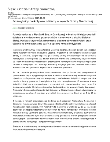 Śląski Oddział Straży Granicznej Źródło: http://www.slaski.strazgraniczna.pl/sm/aktualnosci/20923,Przemytnicy-narkotykow-i-dilerzy-w-rekach-Strazy-Gran icznej.html Wygenerowano: Środa, 8 marca 2017, 10:38 Przemytnicy narkotyków i dilerzy w rękach Straży Granicznej Autor: Walczak Katarzyna Funkcjonariusze z Placówki Straży Granicznej w Bielsku-Białej prowadzili działania wymierzone w przemytników narkotyków z okolic BielskaBiałej. Podczas czynności zatrzymano siedmiu obywateli Polski oraz ujawniono dwie specjalne szafy z uprawą konopi indyjskich. Jeszcze w grudniu 2016 roku na terenie Cieszyna dokonano kontroli dwóch samochodów, które wjechały do Polski z Republiki Czeskiej. W jednym z samochodów funkcjonariusze Straży Granicznej, dzięki wsparciu psa Służby Celnej wyszkolonego do wykrywania narkotyków, ujawnili ponad 100 działek dilerskich marihuany. Zatrzymany obywatel Polski, 29 - letni mieszkaniec Podbeskidzia, przemycał te narkotyki ukryte w specjalnej skrytce fotelika dziecięcego. 26 - letniego kierowcę drugiego pojazdu, również mieszkańca Podbeskidzia, zatrzymano za współudział w dokonaniu przemytu. Po zatrzymaniu przemytników funkcjonariusze Straży Granicznej przeprowadzili przeszukania pięciu wytypowanych miejsc w okolicach Bielska-Białej. W dwóch miejscach ujawniono profesjonalne przydomowe uprawy krzewów konopi indyjskich, w tym specjalne namioty, lampy grzewcze i wentylatory. Łącznie zabezpieczono 15 sadzonek konopi indyjskich. Podczas przeprowadzanych przeszukań zatrzymano trzeciego mężczyznę, 29letniego obywatela RP, także mieszkańca Podbeskidzia. Na wniosek Straży Granicznej i Prokuratury Rejonowej w Cieszynie Sąd Rejonowy w Cieszynie zdecydował o tymczasowym aresztowaniu na okres 3 miesięcy wszystkich trzech mężczyzn. Grozi im od 3 do 15 lat więzienia. 8 lutego, w ramach prowadzonego śledztwa pod nadzorem Prokuratury Rejonowej w Cieszynie, funkcjonariusze Straży Granicznej z Bielska-Białej zatrzymali kolejnych czterech mieszkańców Podbeskidzia. Tym razem byli to mężczyźni w wieku od 22 do 27 lat, którzy zajmowali się rozprowadzaniem przemyconych do Polski narkotyków. W miejscach gdzie mieszkali dilerzy ujawniono ponad 130 gramów suszu marihuany o wartości 5200 złotych. Prokurator przedstawił tym mężczyznom zarzuty posiadania wbrew przepisom środków odurzających. Zastosowano również wobec nich wolnościowe środki zapobiegawcze w postaci dozoru policyjnego i poręczenia majątkowego. Śledztwo w przedmiotowej sprawie prowadzi Straż Graniczna z Bielska-Białej pod nadzorem Prokuratury Rejonowej w Cieszynie. narkotyki ukryte w foteliku ujawnione narkotyki szafa do uprawy konopi sadzonki konopi krzaki konopi krzaki konopi