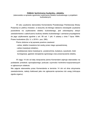 Odbiór techniczny budynku, obiektu (stanowisko w sprawie zgodności wykonania obiektu budowlanego z projektem budowlanym) W celu uzyskania stanowiska Komendanta Powiatowego Państwowej Straży Pożarnej w Lublińcu Inwestor, w stosunku do którego nałożono obowiązek uzyskania pozwolenia na użytkowanie obiektu budowlanego, jest zobowiązany złożyć zawiadomienie o zakończeniu budowy obiektu budowlanego i zamiarze przystąpienia do jego użytkowania zgodnie z art. 56 ust. 1 pkt. 4 ustawy z dnia 7 lipca 1994r. Prawo budowlane (Dz. U. z 2016 r. poz. 290). Pismo złożone w tej sprawie powinno zawierać: - adres, telefon inwestora lub osoby przez niego upoważnionej, - adres inwestycji (obiektu), - podstawowe dane inwestycji tj.: powierzchnia, kubatura, wysokość, ilość kondygnacji, gęstość obciążenia ogniowego oraz przeznaczenie obiektu. W ciągu 14 dni od daty doręczenia pisma Komendant zajmuje stanowisko na podstawie protokołu sporządzonego podczas czynności kontrolno-rozpoznawczych w zgłoszonym obiekcie. Nie zajęcie stanowiska przez Komendanta w terminie 14 dni od dnia otrzymania zawiadomienia, należy traktować jako nie zgłoszenie sprzeciwu lub uwag (milcząca zgoda organu).