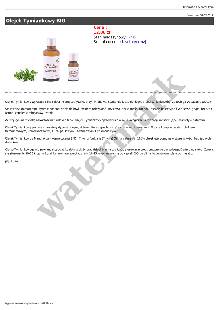 Informacje o produkcie Utworzono 08-03-2017 Olejek Tymiankowy BIO Cena : 12,00 zł er m ar k Stan magazynowy : < 0 Średnia ocena : brak recenzji Olejek Tymiankowy wykazuje silne działanie antyseptyczne, antymikrobowe. Stymuluje krążenie, łagodzi podrażnienia skóry, zapobiega wypadaniu włosów. Stosowany aromaterapeutycznie podnosi ciśnienie krwi. Zwalcza ociężałość umysłową, bezsenność. Łagodzi infekcje bakteryjne i wirusowe, grypę, bronchit, astmę, zapalenie migdałków i zatok. Ze względu na wysoką zawartość naturalnych fenoli Olejek Tymiankowy sprawdzi się w roli ekologicznej substancji konserwującej kosmetyki naturalne. Olejek Tymiankowy pachnie charakterystycznie, ciepło, ziołowo. Nuta zapachowa górna, średnio intensywna. Dobrze komponuje się z olejkiem Bergamotowym, Pomarańczowym, Eukaliptusowym, Lawendowym, Cynamonowym. Olejek Tymiankowy z Manufaktury Kosmetycznej (INCI: Thymus Vulgaris (Thyme) Oil) to naturalny, 100% olejek eteryczny najwyższej jakości, bez żadnych dodatków. Olejku Tymiankowego nie powinny stosować kobiety w ciąży oraz dzieci. Nie należy także stosować nierozcieńczonego olejku bezpośrednio na skórę. Zaleca się stosowanie 10-15 kropli w kominku aromaterapeutycznym, 10-15 kropli na wannę do kąpieli, 2-6 kropli na łyżkę stołową oleju do masażu. w at poj. 10 ml Wygenerowano w programie www.oscGold.com