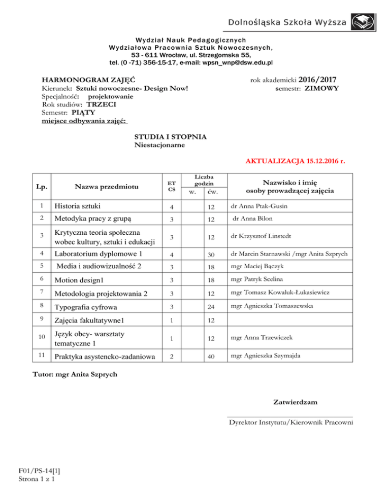 Wydział Nauk Pedagogicznych Wydziałowa Pracownia Sztuk N owoczesnych, 53 - 611 Wrocław, ul. Strzegomska 55, tel. (0 -71) 356-15-17, e-mail: [email protected] rok akademicki 2016/2017 semestr: ZIMOWY HARMONOGRAM ZAJĘĆ Kierunek: Sztuki nowoczesne- Design Now! Specjalność: projektowanie Rok studiów: TRZECI Semestr: PIĄTY miejsce odbywania zajęć: STUDIA I STOPNIA Niestacjonarne AKTUALIZACJA 15.12.2016 r. Lp. Nazwa przedmiotu ET CS Liczba godzin w. ćw. Nazwisko i imię osoby prowadzącej zajęcia 1 Historia sztuki 4 12 dr Anna Ptak-Gusin 2 Metodyka pracy z grupą 3 12 dr Anna Bilon 3 Krytyczna teoria społeczna wobec kultury, sztuki i edukacji 3 12 dr Krzysztof Linstedt 4 Laboratorium dyplomowe 1 4 30 dr Marcin Starnawski /mgr Anita Szprych 5 Media i audiowizualność 2 3 18 mgr Maciej Bączyk 6 Motion design1 3 18 mgr Patryk Scelina 7 Metodologia projektowania 2 3 12 mgr Tomasz Kowaluk-Łukasiewicz 8 Typografia cyfrowa 3 24 mgr Agnieszka Tomaszewska 9 Zajęcia fakultatywne1 1 12 10 Język obcy- warsztaty tematyczne 1 1 12 mgr Anna Trzewiczek 11 Praktyka asystencko-zadaniowa 2 40 mgr Agnieszka Szymajda Tutor: mgr Anita Szprych Zatwierdzam ________________________________ Dyrektor Instytutu/Kierownik Pracowni F01/PS-14[1] Strona 1 z 1 Sztuki Nowoczesne Design Now projektowanie 3 rok 5 semestr Zjazd nr 1 (24, 25 września 2016 r.) 9.00 – 11.15 sobota 24.09.16 r. niedziela 25.09.16 r. 11.30 – 13.45 Typografia cyfrowa (1) mgr A. Tomaszewska s. 204 ul. Strzegomska 55 Metodologia projektowania2 (1) mgr T. KowalukŁukasiewicz s. 107 ul. Strzegomska 55 Typografia cyfrowa (2) mgr A. Tomaszewska s. 204 ul. Strzegomska 55 Historia sztuki (1) dr A. Ptak-Gusin s. 203 ul. Strzegomska 55 14.00 - 16.15 16.30 - 18.45 Metodyka pracy z grupą (1) dr A. Bilon s. 203 ul. Strzegomska 55 Krytyczna teoria społeczna wobec kultury, sztuki i edukacji (1) dr K. Linstedt s. 203 ul. Strzegomska 55 Laboratorium dyplomowe (1) dr M. Starnawski s. 203 ul. Strzegomska 55 Zjazd nr 2 (8, 9 października 2016 r.) sobota 8.10.16 r. niedziela 9.10.16 r. 9.00 – 11.15 11.30 – 13.45 Typografia cyfrowa (3) mgr A. Tomaszewska s. 107 ul. Strzegomska 55 Tutorial Laboratorium mgr A. dyplomowe Szprych (1) s. 107 mgr A. ul. Szprych Strzegomska s. 107 55 ul. Strzegomska 55 Typografia cyfrowa (4) mgr A. Tomaszewska s. 107 ul. Strzegomska 55 Laboratorium dyplomowe (2) dr A. Szprych s. 107 ul. Strzegomska 55 14.00 - 16.15 16.30 - 18.45 Zjazd nr 3 (22, 23 października 2016 r.) sobota 22.10.16 r. niedziela 23.10.16 r. 9.00 – 11.15 11.30 – 13.45 14.00 - 16.15 16.30 - 18.45 Media i audiowizualność2 (1) mgr M. Bączyk s. 203 ul. Strzegomska 55 Krytyczna teoria społeczna wobec kultury, sztuki i edukacji (2) dr K. Linstedt s. 26 ul. Wagonowa 9 Język obcy – warsztaty tematyczne (1) mgr A. Trzewiczek s. 203 ul. Strzegomska 55 Laboratorium dyplomowe (2) dr M. Starnawski s. 26 ul. Wagonowa 9 Metodyka pracy z grupą (2) dr A. Bilon s. 203 ul. Strzegomska 55 Laboratorium dyplomowe (3) dr M. Starnawski s. 26 ul. Wagonowa 9 Historia sztuki (2) dr A. Ptak-Gusin s. 203 ul. Strzegomska 55 Zajęcia fakultatywne s. 26 ul. Wagonowa 9 Sztuki Nowoczesne Design Now projektowanie 3 rok 5 semestr Zjazd nr 4 (5, 6 listopada 2016 r.) 9.00 – 11.15 11.30 – 13.45 14.00 - 16.15 16.30 - 18.45 sobota 5.11.16 r. Krytyczna teoria społeczna wobec kultury, sztuki i edukacji (3) dr K. Linstedt s. 203 ul. Strzegomska 55 Zajęcia fakultatywne s. 203 ul. Strzegomska 55 Media i audiowizualność2 (2) mgr M. Bączyk s. 203 ul. Strzegomska 55 Media i audiowizualność2 (3) mgr M. Bączyk s. 203 ul. Strzegomska 55 niedziela 6.11.16 r. Motion design1 (1) mgr P. Scelina s. 107 ul. Strzegomska 55 Motion design1 (2) mgr P. Scelina s. 107 ul. Strzegomska 55 Typografia cyfrowa (5) mgr A. Tomaszewska s. 107 ul. Strzegomska 55 Typografia cyfrowa (6) mgr A. Tomaszewska s. 107 ul. Strzegomska 55 Zjazd nr 5 (26, 27 listopada 2016 r.) sobota 26.11.16 r. niedziela 27.11.16 r. 9.00 – 11.15 11.30 – 13.45 14.00 - 16.15 16.30 - 18.45 Laboratorium dyplomowe (4) dr M. Starnawski s. 203 ul. Strzegomska 55 Metodologia projektowania2 (2) mgr T. KowalukŁukasiewicz s. 107 ul. Strzegomska 55 Media i audiowizualność2 (4) mgr M. Bączyk s. 203 ul. Strzegomska 55 Metodologia projektowania2 (3) mgr T. KowalukŁukasiewicz s. 107 ul. Strzegomska 55 Język obcy – warsztaty tematyczne (2) mgr A. Trzewiczek s. 203 ul. Strzegomska 55 Historia sztuki (3) dr A. Ptak-Gusin s. 203 ul. Strzegomska 55 Metodyka pracy z grupą (3) dr A. Bilon s. 203 ul. Strzegomska 55 Zajęcia fakultatywne (1) prof. dr hab. P. Dehnel s.203 ul. Strzegomska 55 Zjazd nr 6 (10, 11 grudnia 2016 r.) 9.00 – 11.15 sobota 10.12.16 r. niedziela 11.12.16 r. Krytyczna teoria społeczna wobec kultury, sztuki i edukacji (4) dr K. Linstedt s. 203 ul. Strzegomska 55 Media i audiowizualność2 (5) mgr M. Bączyk 11.30 – 13.45 Metodyka pracy z grupą (4) dr A. Bilon s. 203 ul. Strzegomska 55 Media i audiowizualność2 (6) mgr M. Bączyk 14.00 - 16.15 16.30 - 18.45 Język obcy – warsztaty tematyczne (3) mgr A. Trzewiczek s. 204 ul. Strzegomska 55 Laboratorium dyplomowe (4) dr A. Szprych Metodologia projektowania2 (4) mgr T. Kowaluk- Sztuki Nowoczesne Design Now projektowanie 3 rok 5 semestr s. 203 ul. Strzegomska 55 s. 203 ul. Strzegomska 55 s.107 ul. Strzegomska 55 Łukasiewicz s. 107 ul. Strzegomska 55 Zjazd nr 7 (7, 8 stycznia 2017 r.) sobota 7.01.17 r. niedziela 8.01.17 r. 9.00 – 11.15 11.30 – 13.45 14.00 - 16.15 16.30 - 18.45 Laboratorium dyplomowe (5) dr M. Starnawski s. 203 ul. Strzegomska 55 Laboratorium dyplomowe (3) dr A. Szprych s. 108 ul. Strzegomska 55 Język obcy – warsztaty tematyczne (4) mgr A. Trzewiczek s. 203 ul. Strzegomska 55 Historia sztuki (4) dr A. Ptak-Gusin s. 26 ul. Wagonowa 9 Zajęcia fakultatywne (2) prof. dr hab. P. Dehnel s. 16 ul. Wagonowa 1 Zajęcia fakultatywne (3) prof. dr hab. P. Dehnel s. 16 ul. Wagonowa 1 Typografia cyfrowa (7) mgr A. Tomaszewska s. 107 ul. Strzegomska 55 T