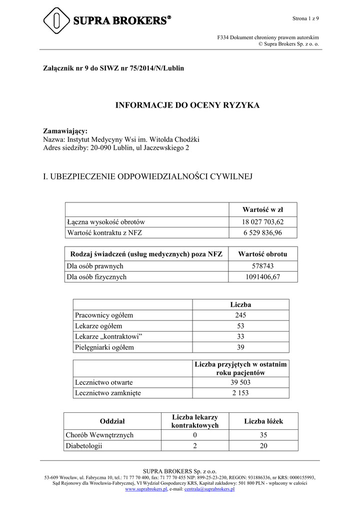 Strona 1 z 9 F334 Dokument chroniony prawem autorskim © Supra Brokers Sp. z o. o. Załącznik nr 9 do SIWZ nr 75/2014/N/Lublin INFORMACJE DO OCENY RYZYKA Zamawiający: Nazwa: Instytut Medycyny Wsi im. Witolda Chodźki Adres siedziby: 20-090 Lublin, ul Jaczewskiego 2 I. UBEZPIECZENIE ODPOWIEDZIALNOŚCI CYWILNEJ Wartość w zł Łączna wysokość obrotów Wartość kontraktu z NFZ 18 027 703,62 6 529 836,96 Rodzaj świadczeń (usług medycznych) poza NFZ Dla osób prawnych Dla osób fizycznych Wartość obrotu 578743 1091406,67 Pracownicy ogółem Lekarze ogółem Lekarze „kontraktowi” Pielęgniarki ogółem Liczba 245 53 33 39 Lecznictwo otwarte Lecznictwo zamknięte Liczba przyjętych w ostatnim roku pacjentów 39 503 2 153 Oddział Chorób Wewnętrznych Diabetologii Liczba lekarzy kontraktowych 0 2 Liczba łóżek 35 20 SUPRA BROKERS Sp. z o.o. 53-609 Wrocław, ul. Fabryczna 10, tel.: 71 77 70 400, fax: 71 77 70 455 NIP: 899-25-23-230, REGON: 931886336, nr KRS: 0000155993, Sąd Rejonowy dla Wrocławia-Fabrycznej, VI Wydział Gospodarczy KRS, Kapitał zakładowy: 501 800 PLN - wpłacony w całości www.suprabrokers.pl, e-mail: [email protected] Strona 2 z 9 F334 Dokument chroniony prawem autorskim © Supra Brokers Sp. z o. o. Rehabilitacji z oddz. Rehabilitacji neurologicznej 0 35 Sposób organizacji opieki lekarskiej podczas dyżurów: Dyżury pełnią lekarze etatowi specjaliści pracujący w oddziałach szpitalnych OCENA RYZYKA ZAKAŻEŃ SZPITALNYCH 1 2 3 4 5 6 7 8 9 10 11 12 13 W podmiocie leczniczym działa Zespół d/s. Zakażeń Szpitalnych W podmiocie leczniczym rejestrowane są zakażenia szpitalne wszystkie wybiórczo Liczba stwierdzanych rocznie zakażeń szpitalnych krwiopochodnych (wzw B, wzw C, hiv) gronkowca innych Podmiot leczniczy zgłasza do Sanepid zakażenia szpitalne/choroby zakaźne wszystkie krwiopochodne Podmiot leczniczy posiada centralną sterylizatornię W podmiocie leczniczym używane są sterylizatory narzędzi na suche, gorące powietrze Prowadzona jest wewnętrzna kontrola procesów sterylizacji Testy używane do kontroli procesów sterylizacji i pracy sterylizatorów: wskaźniki fizyczne wydruk komputerowy testy Bowie-Dicka testy paskowe testy zintegrowane testy biologiczne Używane są puszki Schimmelbuscha jako opakowania do sterylizacji Inne opakowania używane do sterylizacji puszki kontenerowe rękawy papierowo – foliowe inne Do mycia rąk używane jest mydło w: dozownikach kostkach Do dezynfekcji rąk używany jest środek dezynfekcyjny w dozownikach Cały personel poddawany jest szkoleniom z zakresu zapobiegania infekcjom szkolenie tylko przy przyjęciu do pracy TAK NIE X X 0 0 7 X X X X X X X X X X X SUPRA BROKERS Sp. z o.o. 53-609 Wrocław, ul. Fabryczna 10, tel.: 71 77 70 400, fax: 71 77 70 455 NIP: 899-25-23-230, REGON: 931886336, nr KRS: 0000155993, Sąd Rejonowy dla Wrocławia-Fabrycznej, VI Wydział Gospodarczy KRS, Kapitał zakładowy: 501 800 PLN - wpłacony w całości www.suprabrokers.pl, e-mail: [email protected] Strona 3 z 9 F334 Dokument chroniony prawem autorskim © Supra Brokers Sp. z o. o. 14 systematycznie W podmiocie leczniczym opracowane są następujące procedury postępowania mycia i dezynfekcji rąk w czasie pobierania krwi 15 16 17 18 przy wykonywaniu iniekcji podczas dezynfekcji podczas sterylizacji ze sprzętem endoskopowym z zużytym sprzętem jednorazowym ze skażonym mat. biologicznym Przestrzeganie procedur jest systematycznie kontrolowane Możliwa jest izolacja pacjentów chorych zakaźnie Podmiot leczniczy posiada myjnię do endoskopów półautomatyczną automatyczną sterylizator Cały personel narażony na zakażenie wzw jest zaszczepiony przeciwko żółtaczce typu B (na podstawie dokumentacji w Zakł. Leczniczym) X X X X X X X X X X X X X X X Zakres świadczonych usług medycznych Lecznictwo zamknięte Poradnie specjalistyczne Fizykoterapia Diagnostyka specjalistyczna Apteka szpitalna Zakres świadczonych usług pozamedycznych Prowadzenie parkingu strzeżonego (odpłatnego) Wynajem pomieszczeń Podmiot leczniczy : prowadzi działalność dydaktyczną prowadzi działalność w zakresie doskonalenia zawodowego kadr lekarskich, pielęgniarskich itp. SUPRA BROKERS Sp. z o.o. 53-609 Wrocław, ul. Fabryczna 10, tel.: 71 77 70 400, fax: 71 77 70 455 NIP: 899-25-23-230, REGON: 931886336, nr KRS: 0000155993, Sąd Rejonowy dla Wrocławia-Fabrycznej, VI Wydział Gospodarczy KRS, Kapitał zakładowy: 501 800 PLN - wpłacony w całości www.suprabrokers.pl, e-mail: [email protected] Strona 4 z 9 F334 Dokument chroniony prawem autorskim © Supra Brokers Sp. z o. o. ZARZĄDZANIE RYZYKIEM OC W podmiocie leczniczym został powołany Pełnomocnik (nie dotyczy pełnomocnika prawnego) do spraw postępowania z roszczeniem medycznym. W podmiocie leczniczym zastosowane są procedury nadzoru nad roszczeniem: - określania związku przyczynowo – skutkowego roszczenia, - podejmowania prób wycofania roszczenia, - postępowania w celu doprowadzenia do ugody. II. UBEZPIECZENIA MIENIA ZASTOSOWANE ZABEZPIECZENIA PRZECIWPOŻAROWE TAK gaśnice X hydranty wewnętrzne X hydranty zewnętrzne X NIE stałe urządzenia gaśnicze – urządzenia tryskaczowe X stałe urządzenia gaśnicze – gazowe X stałe urządzenia gaśnicze – pianowe lub proszkowe X urządzenia sygnalizujące powstanie pożaru X stały dozór inne ......................................... OCENA BUDYNKÓW I BUDOWLI TAK NIE Budynki stoją w zabudowie zwartej X Minimalne odległości między budynkami 6m Budynki stoją na posesji ogrodzonej X Posesja jest oświetlona X Konstrukcja budynków: materiały palne X materiały niepalne X materiały mieszane Budynki są wykonane z płyt warstwowych z palnym wypełnieniem np. styropianem lub pianką poliuretanową. Ściany działowe wykonane są z: X X materiałów palnych X SUPRA BROKERS Sp. z o.o. 53-609 Wrocław, ul. Fabryczna 10, tel.: 71 77 70 400, fax: 71 77 70 455 NIP: 899-25-23-230, REGON: 931886336, nr KRS: 0000155993