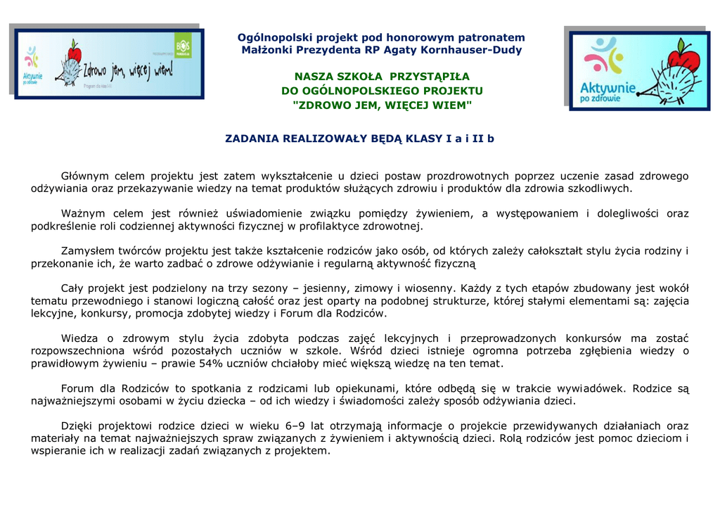 Ogólnopolski projekt pod honorowym patronatem Małżonki Prezydenta RP Agaty Kornhauser-Dudy NASZA SZKOŁA PRZYSTĄPIŁA DO OGÓLNOPOLSKIEGO PROJEKTU "ZDROWO JEM, WIĘCEJ WIEM" ZADANIA REALIZOWAŁY BĘDĄ KLASY I a i II b Głównym celem projektu jest zatem wykształcenie u dzieci postaw prozdrowotnych poprzez uczenie zasad zdrowego odżywiania oraz przekazywanie wiedzy na temat produktów służących zdrowiu i produktów dla zdrowia szkodliwych. Ważnym celem jest również uświadomienie związku pomiędzy żywieniem, a występowaniem i dolegliwości oraz podkreślenie roli codziennej aktywności fizycznej w profilaktyce zdrowotnej. Zamysłem twórców projektu jest także kształcenie rodziców jako osób, od których zależy całokształt stylu życia rodziny i przekonanie ich, że warto zadbać o zdrowe odżywianie i regularną aktywność fizyczną Cały projekt jest podzielony na trzy sezony – jesienny, zimowy i wiosenny. Każdy z tych etapów zbudowany jest wokół tematu przewodniego i stanowi logiczną całość oraz jest oparty na podobnej strukturze, której stałymi elementami są: zajęcia lekcyjne, konkursy, promocja zdobytej wiedzy i Forum dla Rodziców. Wiedza o zdrowym stylu życia zdobyta podczas zajęć lekcyjnych i przeprowadzonych konkursów ma zostać rozpowszechniona wśród pozostałych uczniów w szkole. Wśród dzieci istnieje ogromna potrzeba zgłębienia wiedzy o prawidłowym żywieniu – prawie 54% uczniów chciałoby mieć większą wiedzę na ten temat. Forum dla Rodziców to spotkania z rodzicami lub opiekunami, które odbędą się w trakcie wywiadówek. Rodzice są najważniejszymi osobami w życiu dziecka – od ich wiedzy i świadomości zależy sposób odżywiania dzieci. Dzięki projektowi rodzice dzieci w wieku 6–9 lat otrzymają informacje o projekcie przewidywanych działaniach oraz materiały na temat najważniejszych spraw związanych z żywieniem i aktywnością dzieci. Rolą rodziców jest pomoc dzieciom i wspieranie ich w realizacji zadań związanych z projektem. W etapie jesiennym i wiosennym nauczyciel musi zrealizować ze swoim zespołem konkursowym 2 bloki zadań o tematyce prozdrowotnej. W skład bloku zadaniowego wchodzą zajęcia lekcyjne, 1 lub 2 konkursy, promocja w szkole oraz forum zdrowia dla rodziców. Natomiast w etapie zimowym do zrealizowania jest jeden blok zadaniowy. W ramach realizacji każdego bloku zespół musi wypromować zdobytą wiedzę oraz podjęte działania wśród całej społeczności szkolnej. Dla każdej klasy przygotowane są plany zadań do realizacji w poszczególnych etapach. LEKCJE są specjalnie przygotowane dla uczniów klas I-III szkół podstawowych. Podczas zajęć lekcyjnych realizowane są zagadnienia dotyczące zdrowego stylu życia, zdrowego odżywiania i aktywności fizycznej. Lekcje są realizowane w formie krótkich pogadanek i dyskusji, doświadczeń i zabaw, które w prosty sposób przekazują i utrwalają wiedzę. KONKURSY są tematycznie powiązane z zajęciami lekcyjnymi i ich celem jest m.in. utrwalenie wiadomości, pogłębianie zainteresowania uczniów zdrowym odżywianiem i stylem życia oraz rozwijanie kreatywności. Celem konkursów jest też promowanie wiedzy o zdrowym stylu życia wśród pozostałych uczniów w szkole. Wśród dzieci istnieje ogromna potrzeba zgłębienia wiedzy o prawidłowym żywieniu–prawie 54 proc. uczniów chciałoby mieć większą wiedzę na ten temat. FORUM DLA RODZICÓW to spotkania z rodzicami lub opiekunami, które odbędą się w trakcie wywiadówek. Dzięki programowi ok. 40 tys. rodziców dzieci w wieku 6–9 lat otrzyma informacje o programie i przewidywanych działaniach oraz materiały na temat najważniejszych spraw związanych z żywieniem i aktywnością dzieci. Ostatnim elementem każdego bloku zadaniowego jest promocja podjętych przez zespół działań w szkole. Celem promocji jest dotarcie do całej społeczności szkolnej (uczniów oraz pracowników szkół) i przekazanie jej wiedzy zdobytej podczas realizacji zadań konkursowych. INFORMACJE NA TEMAT REALIZOWANYCH ZADAŃ BĘDA PUBLIKOWANE NA STRONIE INTERNETOWEJ SZKOŁY ORAZ BĘDĄ ZNAJDOWAŁY SIĘ NA GAZETKACH TEMATYCZNYCH NA KORYTARZU SZKOLNYM Informacji na temat realizowanego projektu udzielają p. Ewa Węgrzyńska p. Beata Nowak -Dziudzi JESIENNE ZADANIA PROJEKTOWE KLASY I A ZADANIA ZADANIE 1.1 LEKCJA: Poznajemy owoce i warzywa ZADANIE 1.2 KONKURS: Plakat zachęcający do zrezygnowania ze słodyczy ZADANIE 1.3 KONKURS: Strefa aktywności – najciekawsze propozycje zabaw na świeżym powietrzu ZADANIE 1.4 PROMOCJA podjętych działań w szkole ZADANIE 1.5 FORUM DLA RODZICÓW: Kolorowy talerz ZADANIE 2.1 LEKCJA: Stawiam na śniadanie ZADANIE 2.2 KONKURS: Najlepszy rysunek śniadania ZADANIE 2.3 PROMOCJA podjętych działań w szkole ZADANIE 2.4 FORUM DLA RODZICÓW: Planowanie posiłków – zasady i błędy JESIENNE ZADANIA PROJEKTOWE KLASY II B ZADANIA ZADANIE 1.1 LEKCJA: Warzywa i owoce na co dzień i od święta ZADANIE 1.2 KONKURS: Klasowe pisemko zachęcające do zrezygnowania ze słodyczy ZADANIE 1.3 KONKURS: Strefa aktywności – zabawy na świeżym powietrzu ZADANIE 1.4 PROMOCJA podjętych działań w szkole ZADANIE 1.5 FORUM DLA RODZICÓW: Kolorowy talerz ZADANIE 2.1 LEKCJA: Dbam o to, co jem i jak spędzam czas ZADANIE 2.2 KONKURS: Najlepszy zestaw na drugie śniadanie ZADANIE 2.3 PROMOCJA podjętych działań w szkole ZADANIE 2.4 FORUM DLA RODZICÓW: Planowanie posiłków – zasady i błędy
