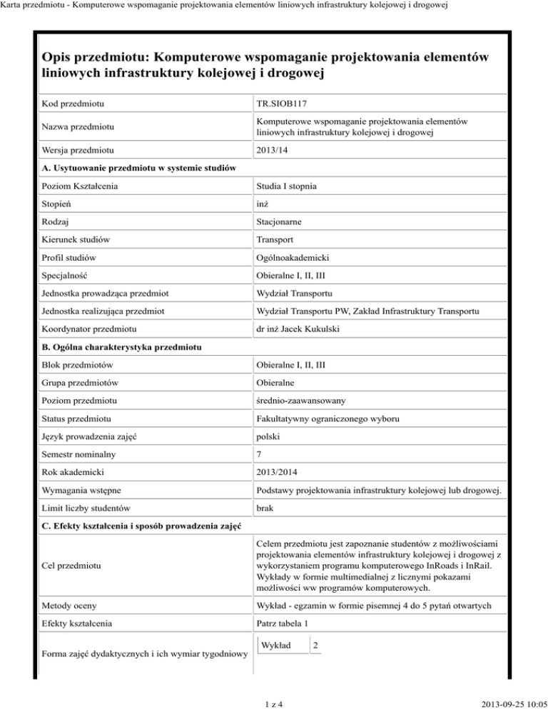 Karta przedmiotu - Komputerowe wspomaganie projektowania elementów liniowych infrastruktury kolejowej i drogowej Opis przedmiotu: Komputerowe wspomaganie projektowania elementów liniowych infrastruktury kolejowej i drogowej Kod przedmiotu TR.SIOB117 Nazwa przedmiotu Komputerowe wspomaganie projektowania elementów liniowych infrastruktury kolejowej i drogowej Wersja przedmiotu 2013/14 A. Usytuowanie przedmiotu w systemie studiów Poziom Kształcenia Studia I stopnia Stopień inż Rodzaj Stacjonarne Kierunek studiów Transport Profil studiów Ogólnoakademicki Specjalność Obieralne I, II, III Jednostka prowadząca przedmiot Wydział Transportu Jednostka realizująca przedmiot Wydział Transportu PW, Zakład Infrastruktury Transportu Koordynator przedmiotu dr inż Jacek Kukulski B. Ogólna charakterystyka przedmiotu Blok przedmiotów Obieralne I, II, III Grupa przedmiotów Obieralne Poziom przedmiotu średnio-zaawansowany Status przedmiotu Fakultatywny ograniczonego wyboru Język prowadzenia zajęć polski Semestr nominalny 7 Rok akademicki 2013/2014 Wymagania wstępne Podstawy projektowania infrastruktury kolejowej lub drogowej. Limit liczby studentów brak C. Efekty kształcenia i sposób prowadzenia zajęć Cel przedmiotu Celem przedmiotu jest zapoznanie studentów z możliwościami projektowania elementów infrastruktury kolejowej i drogowej z wykorzystaniem programu komputerowego InRoads i InRail. Wykłady w formie multimedialnej z licznymi pokazami możliwości ww programów komputerowych. Metody oceny Wykład - egzamin w formie pisemnej 4 do 5 pytań otwartych Efekty kształcenia Patrz tabela 1 Wykład 2 Forma zajęć dydaktycznych i ich wymiar tygodniowy 1z4 2013-09-25 10:05 Karta przedmiotu - Komputerowe wspomaganie projektowania elementów liniowych infrastruktury kolejowej i drogowej Ćwiczenia 0 Laboratoria 0 Projekty 0 Treści kształcenia Elementy infrastruktury liniowej w transporcie kolejowym i drogowym; Podstawy projektowania infrastruktury liniowej w transporcie kolejowym i drogowym. Programy wspomagające projektowanie; Bentley Inroads, Inrail – informacje ogólne, wymagania sprzętowe, uruchomienie programu; CadrCad – informacje ogólne. Ogólne zasady pracy z programem InRoads i Inrail; Struktura projektu w InRoads, ustawienia. Numeryczny Model Terenu – informacje ogólne; Metody tworzenia NMT; Przykład utworzenia NMT; Modyfikacja i wczytywanie; Programy do tworzenia NMT z obrazów rastrowych. Geometria w planie i w przekroju podłużnym; Przekrój podłużny; Opisanie profilu podłużnego; Definiowanie drogi i utworzenie modelu jej powierzchni; -definiowanie przekroju drogi. -definiowanie przechyłki i rampy przechyłkowej. -tworzenie przekrojów poprzecznych drogi dla punktów charakterystycznych; -obliczanie robót ziemnych. Metody sprawdzenia efektów kształcenia Patrz tabela 1 Egzamin tak Literatura 1. Drogi kolejowe, pr. zbiorowa pod red. J. Sysaka, PWN, Warszawa 1989. 2. Id1 Warunki techniczne utrzymania nawierzchni na liniach kolejowych. Polskie Linie Kolejowe SA, Warszawa 2002. 3. Infrastruktura Transportu Kolejowego" - K. Towpik (Wydawnictwo Politechniki Warszawskiej 2004). 4. Linie Kolejowe - T.Basiewicz, M. Jacyna, L. Rudziński (Wydawnictwo Politechniki Warszawskiej 2003) 5. Towpik K., Gołaszewski A., Kukulski J.: Infrastruktura Transportu Samochodowego’’. Skrypt uczelniany. Warszawa 2006r. WPW. 6. InRoads 2004 Edition – Tadeusz Zieliński, Program do komputerowego wspomagania projektowania dróg. 7. Techniczna Specyfikacja Interoperacyjności podsystem infrastruktury dla kolei konwencjonalnych i dużych prędkości. Witryna www przedmiotu www.wt.pw.edu.pl D. Nakład pracy studenta Liczba punktów ECTS 2 Liczba godzin pracy studenta związanych z osiągnięciem efektów kształcenia(opis): 60 godz., w tym: praca na wykładach 30 godz., zapoznanie się ze wskazaną literaturą 7 godz., indywidualne doskonalenie obsługi oprogramowania do projektowania 10 godz., konsultacje 3 godz., przygotowanie się do egzaminu 8 godz., udział w egzaminie 2 godz. Liczba punktów ECTS na zajęciach wymagających bezpośredniego udziału nauczycieli akademickich: 1,5 pkt ECTS (35 godz., w tym: praca na wykładach 30 godz., konsultacje 3 godz., udział w egzaminie 2 godz.) Liczba punktów ECTS, którą student uzyskuje w ramach zajęć o charakterze praktycznym 0,5 pkt ECTS (Indywidualne doskonalenie obsługi oprogramowania do projektowania 10 godz.) E. Informacje dodatkowe 2z4 2013-09-25 10:05 Karta przedmiotu - Komputerowe wspomaganie projektowania elementów liniowych infrastruktury kolejowej i drogowej Uwagi Przedmiot z uchwalonego przez Radę Wydziału wykazu dodatkowych przedmiotów obieralnych na rok akademicki 2013/2014. Data ostatniej aktualizacji 2013-09-20 17:44:29 Tabela 1: Profil Ogólnoakademicki Efekty kierunkowe Efekty przedmiotowe Efekty obszarowe Wiedza Efekt: Kod efektu: T1A_W03 Posiada wiedzę teoretyczną dotyczącą elementów liniowych infrastruktury drogowej i kolejowej oraz zasad jej projektowania Tr1A_W08 T1A_W05 W01 Tr1A_W09 T1A_W04 Weryfikacja: wykład - egzamin część pisemna Efekt: Kod efektu: T1A_W08 Posiada wiedzę teoretyczną dotyczącą istniejącego oprogramowania wspomogającego projektowanie infrastruktury T1A_W07 Tr1A_W12 W02 T1A_W08 Weryfikacja: wykład - egzamin część pisemna Efekt: Kod efektu: Zna ogólne zasady pracy z programem InRoads/Inrail; zna strukturę projektu w programach T1A_W07 Tr1A_W12 W03 T1A_W08 Weryfikacja: wykład - egzamin część pisemna Efekt: Kod efektu: T1A_W03 Posiada wiedzę teoretyczną dotyczącą Numerycznego Modelu Terenu, zasad tworzenia, modyfikacji Tr1A_W08 T1A_W05 W04 Tr1A_W12 T1A_W07 Weryfikacja: wykład - egzamin część pisemna Efekt: Kod efektu: T1A_W08 Posiada wiedzę teoretyczną dotyczącą tworzenia geometrii w planie i w profilu drogi samochodowej, linii kolejowej, tworzenia profilu podłużnego, opisywania profilu z wykorzystaniem programów InRoads/InRail W05 T1A_W0