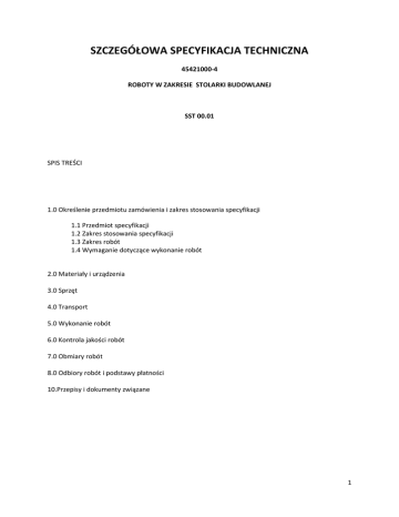SZCZEGÓŁOWA SPECYFIKACJA TECHNICZNA 45421000-4 ROBOTY W ZAKRESIE STOLARKI BUDOWLANEJ SST 00.01 SPIS TREŚCI 1.0 Określenie przedmiotu zamówienia i zakres stosowania specyfikacji 1.1 Przedmiot specyfikacji 1.2 Zakres stosowania specyfikacji 1.3 Zakres robót 1.4 Wymaganie dotyczące wykonanie robót 2.0 Materiały i urządzenia 3.0 Sprzęt 4.0 Transport 5.0 Wykonanie robót 6.0 Kontrola jakości robót 7.0 Obmiary robót 8.0 Odbiory robót i podstawy płatności 10.Przepisy i dokumenty związane 1 1.0 PRZEDMIOT I ZAKRES STOSOWANIA SPECYFIKACJI 1.1 Przedmiot specyfikacji Przedmiotem niniejszej Szczegółowej Specyfikacji Technicznej (SST) są wymagania dotyczące realizacji robót wymiany stolarki okiennej w salach lekcyjnych, w.c. chłopców oraz wnęce korytarza w IV L.O. w Lesznie. 1.2 Zakres stosowania specyfikacji. Ustalenia zawarte w SST obejmują prace związane z dostawą materiałów wykonawstwem i wykończeniem robót wymiany stolarki okiennej. Niniejsza specyfikacja będzie stosowana jako dokument przetargowy i kontraktowy przy zlecaniu i realizacji robót wymienionych w punkcie 1.1. 1.3 Zakres robót : Ilość okien do wymiany – 23 szt. 1.3.1 rozbiórka parapetów zewnętrznych z blachy ocynkowanej, 1.3.2 wykucie parapetów drewnianych wewnętrznych, 1.3.3 wykucie stolarki okiennej drewnianej 1.3.4 wywóz materiałów z rozbiórki i ich utylizacja 1.3.5 montaż okien typu PCV rozwierno - uchylnych wg rysunków 1.3.6 montaż w 23 oknach nawiewników higrosterowanych automatycznie, 1.3.7 montaż parapetów zewnętrznych z blachy stalowej powlekanej 1.3.8 montaż parapetów wewnętrznych typu postforming 1.3.9 obróbka ościeży okiennych (uzupełnienie tynków i malowanie), 1.3.10 wymiana płytek ściennych przy parapetach i ościeżach – w.c. x 2. 1.4 Wymagania dotyczące wykonania robót Wykonawca jest odpowiedzialny za jakość wykonania robót oraz zgodność ich wykonania z umową. 2.0 MATERIAŁY Ogólne wymagania dotyczące materiałów podano w Ogólnej Specyfikacji Technicznej p. 4. Zastosowane materiały budowlane powinny posiadać atest higieniczny stosowalności w obiektach oświaty, certyfikaty, oceny higieniczne i aprobaty techniczne zastosowanych 2 materiałów i wyrobów. Wymagania i badania powinny odpowiadać wymaganiom normy PN88/B-10085 lub aprobatom technicznym. 2.1. Stolarka okienna winna posiadać następujące dane techniczne okien: − profil minimum pięciokomorowy z nieplastyfikowanego PCV zakwalifikowanego do materiałów niezapalnych, wewnątrz wzmocnienie z kształtownika stalowego; − szyba zespolona float 4-16-4 , ( wymagany współczynnik K= 1,1 ) − współczynnik izolacyjności akustycznej okna o min. Rw = 31 dB − funkcja – skrzydła uchylno-rozwierne, uchylne, − kolor biały; − blokada błędnego położenia klamki; − nawiewniki higrosterowane typu AERECO wg ustaleń z inwestorem 2.2. Pianka poliuretanowa –jednoskładnikowa – do uszczelnienia stolarki po wbudowaniu, 2.3. Silikon do uszczelnienia stolarki od zewnątrz, 2.4. Parapet zewnętrzny z blachy stalowej powlekanej szer. 0,35 cm grubość 0,55 mm, kolor brązowy 2.5. Parapet typu Posforming gr. 30 mm szer. ok. 35 cm 2.6. Zaprawa tynkarska do obróbek ościeży - zastosować gotową zaprawę szybko wiążącą, 2.7. Farba emulsyjna wewnętrzna . 2.8. Zabezpieczenie podłóg i sprzętu szkolnego. Zastosowany system profili winien uwzględniać normy obciążeń wiatrem wg PN-77/B02011, dopuszczalnych ugięć elementów okna, charakterystyki wytrzymałościowej stalowych kształtowników wzmacniających oraz spełniać warunki zachowania szczelności na przenikalność wody i prawidłową infiltrację powietrza. 3.0 SPRZĘT Ogólne wymagania dotyczące sprzętu podano w Ogólnej Specyfikacji Technicznej p.5. Rodzaj sprzętu użytego do wykonania zadania pozostawia się do decyzji wykonawcy i musi odpowiadać przyjętej technologii. Mieszanie zaprawy odbywać się będzie na miejscu przy pomocy mieszadła elektrycznego. 4.0 TRANSPORT Ogólne wymagania dotyczące transportu podano w Ogólnej Specyfikacji Technicznej p.6. Dostawa materiałów i wywóz materiałów z rozbiórki odbywać się będzie samochodami skrzyniowymi. Załadunek, transport i rozładunek materiałów należy przeprowadzić zgodnie z przepisami bhp oraz przepisami o ruchu drogowym. 5.0 WYKONANIE ROBÓT 5.1 Rozbiórka stolarki okiennej i parapetów należy wykonać ręcznie przy użyciu narzędzi prostych. 5.2 Materiały z rozbiórki wywozić na bieżąco. 5.3 Dokładnie oczyścić ościeża , zaszpachlować ewentualne ubytki i nierówności. 5.4 Montaż ościeżnic: - wstępnie klinami zamocować ościeżnice bez skrzydeł okiennych, dokładnie sprawdzić prawidłowość jej ustawienia w dwóch płaszczyznach, przy zachowaniu 3 zasady równych przekątnych, różnica nie może przekraczać 4 mm, - po ustawieniu okna, pomiędzy nim a wszystkimi bokami otworu musi pozostać szczelina odpowiedniej wielkości . W otworze bez węgarka montować w taki sposób, aby szczelina na górze miała szerokość 15-20 mm, na dole 40 mm, po bokach zaś mieściła się w granicach 10-15 mm. Przy otworze z węgarkiem większy luz, w granicach 15-20 mm, wykonać w górnej części ościeżnicy. Ościeżnicę wbudować w otwór po zdjęciu skrzydeł okna. - Ościeżnice mocować blachami kotwiącymi lub kotwami rozprężnymi ze stali nierdzewnej wg technologii producenta. 5.5 Uszczelnienie pianką poliuretanową wykonywać ostrożnie, aby nie spowodowano wykrzywienia ościeżnic, tak aby puchnąć miała możliwość wydostawania się ze szczeliny na zewnątrz i tam tężała. Po stężeniu, nadmiar pianki, który wypłynął obciąć nożem. 5.6 Wykończenie robót należy wykonać wg zaleceń – patrz rys. 6.0 KONTROLA JAKOŚCI ROBÓT. Ogólne zasady kontroli jakości robót podano w Ogólnej Specyfikacji Technicznej p.7. 15Kontrola jakości robót polega na sprawdzeniu: 6.1 Oczyszczenie ościeży i wykonania ewentual