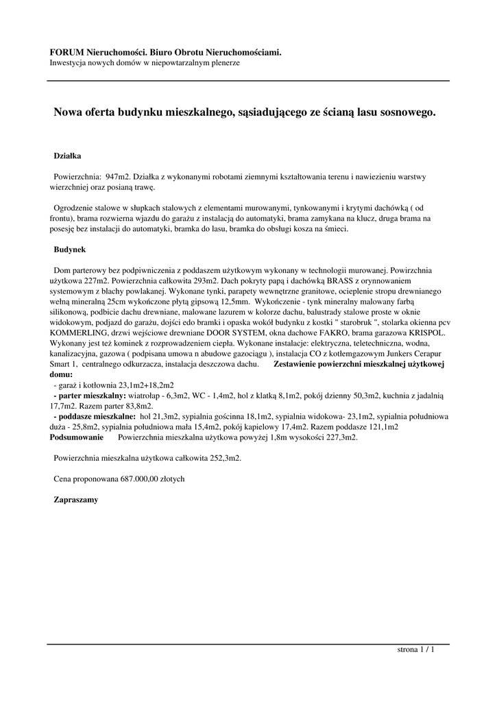 FORUM Nieruchomości. Biuro Obrotu Nieruchomościami. Inwestycja nowych domów w niepowtarzalnym plenerze Nowa oferta budynku mieszkalnego, sąsiadującego ze ścianą lasu sosnowego. Działka Powierzchnia: 947m2. Działka z wykonanymi robotami ziemnymi kształtowania terenu i nawiezieniu warstwy wierzchniej oraz posianą trawę. Ogrodzenie stalowe w słupkach stalowych z elementami murowanymi, tynkowanymi i krytymi dachówką ( od frontu), brama rozwierna wjazdu do garażu z instalacją do automatyki, brama zamykana na klucz, druga brama na posesję bez instalacji do automatyki, bramka do lasu, bramka do obsługi kosza na śmieci. Budynek Dom parterowy bez podpiwniczenia z poddaszem użytkowym wykonany w technologii murowanej. Powirzchnia użytkowa 227m2. Powierzchnia całkowita 293m2. Dach pokryty papą i dachówką BRASS z orynnowaniem systemowym z blachy powlakanej. Wykonane tynki, parapety wewnętrzne granitowe, ocieplenie stropu drewnianego wełną mineralną 25cm wykończone płytą gipsową 12,5mm. Wykończenie - tynk mineralny malowany farbą silikonową, podbicie dachu drewniane, malowane lazurem w kolorze dachu, balustrady stalowe proste w oknie widokowym, podjazd do garażu, dojści edo bramki i opaska wokół budynku z kostki " starobruk ", stolarka okienna pcv KOMMERLING, drzwi wejściowe drewniane DOOR SYSTEM, okna dachowe FAKRO, brama garazowa KRISPOL. Wykonany jest też kominek z rozprowadzeniem ciepła. Wykonane instalacje: elektryczna, teletechniczna, wodna, kanalizacyjna, gazowa ( podpisana umowa n abudowe gazociągu ), instalacja CO z kotłemgazowym Junkers Cerapur Smart 1, centralnego odkurzacza, instalacja deszczowa dachu. Zestawienie powierzchni mieszkalnej użytkowej domu: - garaż i kotłownia 23,1m2+18,2m2 - parter mieszkalny: wiatrołap - 6,3m2, WC - 1,4m2, hol z klatką 8,1m2, pokój dzienny 50,3m2, kuchnia z jadalnią 17,7m2. Razem parter 83,8m2. - poddasze mieszkalne: hol 21,3m2, sypialnia gościnna 18,1m2, sypialnia widokowa- 23,1m2, sypialnia południowa duża - 25,8m2, sypialnia południowa mała 15,4m2, pokój kapielowy 17,4m2. Razem poddasze 121,1m2 Podsumowanie Powierzchnia mieszkalna użytkowa powyżej 1,8m wysokości 227,3m2. Powierzchnia mieszkalna użytkowa całkowita 252,3m2. Cena proponowana 687.000,00 złotych Zapraszamy strona 1 / 1