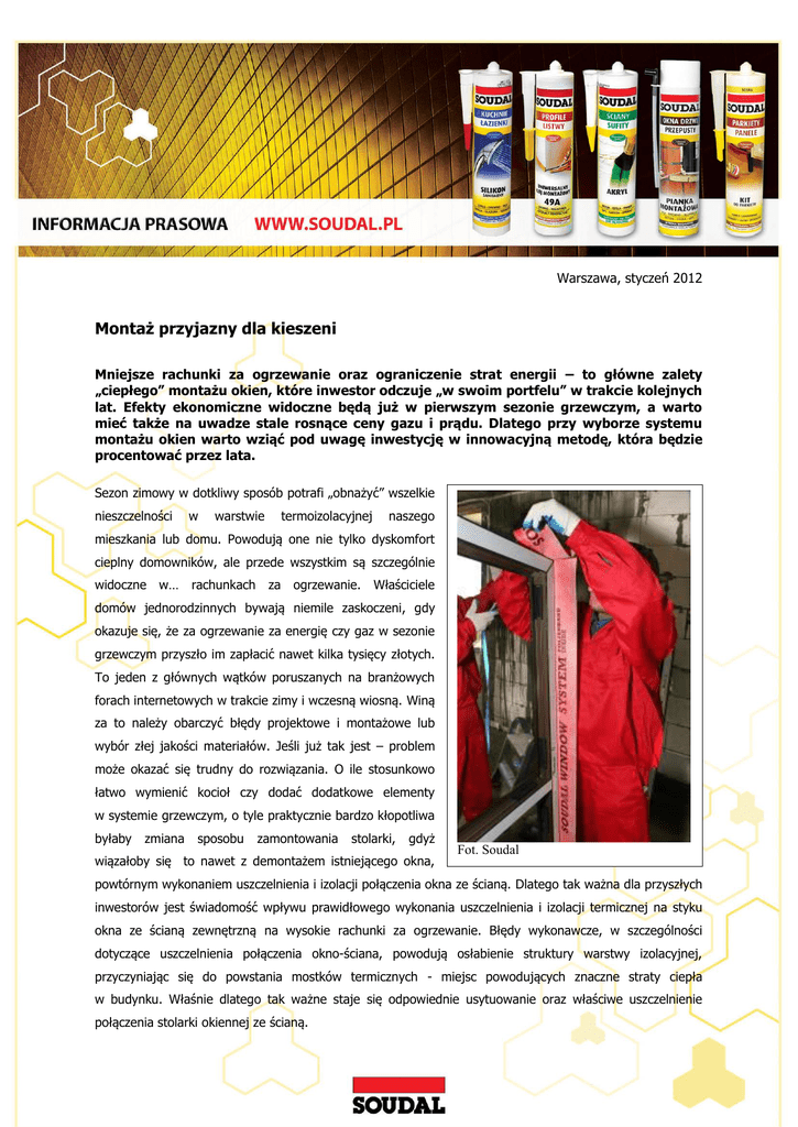 Warszawa, styczeń 2012 Montaż przyjazny dla kieszeni Mniejsze rachunki za ogrzewanie oraz ograniczenie strat energii – to główne zalety „ciepłego” montażu okien, które inwestor odczuje „w swoim portfelu” w trakcie kolejnych lat. Efekty ekonomiczne widoczne będą już w pierwszym sezonie grzewczym, a warto mieć także na uwadze stale rosnące ceny gazu i prądu. Dlatego przy wyborze systemu montażu okien warto wziąć pod uwagę inwestycję w innowacyjną metodę, która będzie procentować przez lata. Sezon zimowy w dotkliwy sposób potrafi „obnażyć” wszelkie nieszczelności w warstwie termoizolacyjnej naszego mieszkania lub domu. Powodują one nie tylko dyskomfort cieplny domowników, ale przede wszystkim są szczególnie widoczne w… rachunkach za ogrzewanie. Właściciele domów jednorodzinnych bywają niemile zaskoczeni, gdy okazuje się, że za ogrzewanie za energię czy gaz w sezonie grzewczym przyszło im zapłacić nawet kilka tysięcy złotych. To jeden z głównych wątków poruszanych na branżowych forach internetowych w trakcie zimy i wczesną wiosną. Winą za to należy obarczyć błędy projektowe i montażowe lub wybór złej jakości materiałów. Jeśli już tak jest – problem może okazać się trudny do rozwiązania. O ile stosunkowo łatwo wymienić kocioł czy dodać dodatkowe elementy w systemie grzewczym, o tyle praktycznie bardzo kłopotliwa byłaby zmiana sposobu zamontowania stolarki, gdyż wiązałoby się to nawet z demontażem istniejącego okna, Fot. Soudal powtórnym wykonaniem uszczelnienia i izolacji połączenia okna ze ścianą. Dlatego tak ważna dla przyszłych inwestorów jest świadomość wpływu prawidłowego wykonania uszczelnienia i izolacji termicznej na styku okna ze ścianą zewnętrzną na wysokie rachunki za ogrzewanie. Błędy wykonawcze, w szczególności dotyczące uszczelnienia połączenia okno-ściana, powodują osłabienie struktury warstwy izolacyjnej, przyczyniając się do powstania mostków termicznych - miejsc powodujących znaczne straty ciepła w budynku. Właśnie dlatego tak ważne staje się odpowiednie usytuowanie oraz właściwe uszczelnienie połączenia stolarki okiennej ze ścianą. Rozwiązaniem zapewniającym właściwe uszczelnienie okna, komfort cieplny w domu oraz oszczędność kosztów ogrzewania jest „ciepły” montaż trójwarstwowy (np. za pomocą kompleksowego rozwiązania odpowiedniego do każdego typu ściany - Soudal Window System). Koszt montażu okien – droższy znaczy tańszy Większość świadomych inwestorów wybiera obecnie energooszczędne okna o najwyższych parametrach izolacyjnych – po to, aby ograniczyć późniejsze straty ciepła. Często inwestują w to znaczne środki finansowe. Paradoksalnie jednak, decyzja jaki sposób montażu okna wybrać, w większości przypadków zapada głównie na podstawie jego ceny – inwestorzy nie chcą wydawać dodatkowych środków. Warto jednak wiedzieć , że oszczędność na materiałach i kosztach robocizny podczas montażu jest tak naprawdę stratą - przekłada się bowiem na późniejsze wysokie rachunki za ogrzewanie. Jeśli okno energooszczędne ma spełniać swoją rolę, nie wystarczy by trzymało pion i poziom, aby uznać je za właściwie zamontowane. Warstwowy montaż uszczelnienia i izolacji połączenia okna ze ścianą, niekiedy potocznie określany jako „ciepły”, to trwałe i skuteczne uszczelnienie miejsc osadzenia okien w ościeżu w myśl ogólnej zasady: „szczelniej od wewnątrz niż na zewnątrz”. „Trójwarstwowe uszczelnienie i izolacja połączenia okna ze ścianą zewnętrzną to rozwiązanie konieczne, które powinno stać się w Polsce standardem. Uszczelnienie okna na obwodzie składa się z warstwy zewnętrznej, środkowej i wewnętrznej. Warstwę zewnętrzną stanowi uszczelnienie wykonane z impregnowanych taśm rozprężnych lub taśm warstwowych paroprzepuszczalnych. Warstwę środkową stanowi izolacyjna pianka wypełniająca (np. pianka poliuretanowa) lub mineralne materiały izolacyjne (np. wełna mineralna), które zapewniają izolację termiczną i akustyczną szczeliny między oknem i ścianą budynku. Prawidłowe wykonanie połączenia okna ze ścianą to nie tylko jego zamocowanie mechaniczne i wypełnienie szczeliny na obwodzie pianką poliuretanową lub wełną mineralną, ale także uszczelnienie zewnętrzne i wewnętrzne przy zastosowaniu odpowiednich folii paroszczelnych i paroprzepuszczalnych, co ma istotny wpływ na późniejsze funkcjonowanie okna i warunki panujące wewnątrz pomieszczeń” – mówi Krzysztof Mateja , autor „Instrukcji montażu okien i drzwi balkonowych ” wydanej przez Instytut Techniki Budowlanej. Dlatego podejmując decyzję o sposobie montażu należy zastanowić się, czy nie warto zainwestować dodatkowej kwoty w innowacyjne, bezpieczne i długotrwałe rozwiązanie. Tym bardziej, że jego koszt wobec nakładów na okna i drzwi jest wręcz znikomy. Wypełnienie szczeliny między oknem a ościeżem wykonane jedynie przy użyciu piany lub wełny mineralnej to wynik przyzwyczajenia wielu fachowców do rozwiązań z początku lat 90-tych ubiegłego wieku. Jest to jednak jedynie 1/3 koniecznych do uszczelnienia okna prac. Co więcej – w przypadku wyboru sposobu montażu okien - raz podjętej decyzji nie da się już zmienić. Dlatego warto ją starannie przemyśleć, bo jej skutki odczuwać będziemy przez wiele lat. „W ciepłym montażu niezwykle ważne są odpowiednie materiały, zapewniające późniejszą właściwą pracę okien w ościeży. Wprowadzony przez nas kompletny Soudal Window System to innowacyjny i kompleksowy system trójwarstwowego montażu okien opracowany na potrzeby budownictwa energooszczędnego. W jego skład wchodzą: piana poliuretanowa, taśmy paroizolacyjne, taśmy rozprężne i masy uszczelniające. Ten profesjonalny zestaw produktów do montażu stolarki okiennej sprawdza się zarówno przy tradycyjnym 