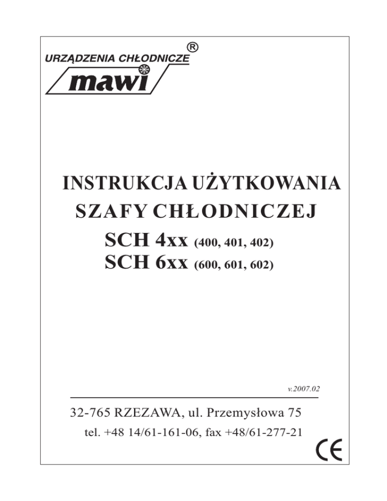 R INSTRUKCJA U¯YTKOWANIA SZAFY CH£ODNICZEJ SCH 4xx (400, 401, 402) SCH 6xx (600, 601, 602) v.2007.02 32-765 RZEZAWA, ul. Przemys³owa 75 tel. +48 14/61-161-06, fax +48/61-277-21 Kopiowanie, przetwarzanie i rozpowszechnianie tych materia³ów w ca³oœci lub w czêœci bez zgody Firmy MAWI jest zabronione i stanowi naruszenie praw autorskich. 1. Informacje ogólne. Szafy ch³odnicze (rys. 1) s¹ uniwersalnymi urz¹dzeniami do prezentacji lub przechowywania artyku³ów spo¿ywczych w obni¿onej temperaturze. Szafy przeszklone przeznaczone s¹ wy³¹cznie do prezentacji towarów. Zastosowane oœwietlenie o specjalnej strukturze œwiat³a podwy¿sza atrakcyjnoœæ eksponowanych artyku³ów. Szafy przeszklone produkowane s¹ w trzech podstawowych odmianach. - dwustronnie przeszklone, - z przeszklonymi drzwiami, - przeszklone z przodu, z ty³u drzwi pe³ne. Szafy pe³ne (bez szyb) s³u¿¹ do przechowywania artyku³ów spo¿ywczych. Zakres uzyskiwanych temperatur w szafach zawiera siê w granicach od +1°C do +10°C. Urz¹dzenia posiadaj¹ "Certyfikat uprawniaj¹cy do oznaczenia wyrobu znakiem bezpieczeñstwa" wydanym przez Oœrodek BadawczoRozwojowy PREDOM-OBR, a tym samym spe³niaj¹ wymagania normy PN-EN 60335-2-89:2003 – „Elektryczny sprzêt do u¿ytku domowego i podobnego – Bezpieczeñstwo u¿ytkowania – czêœæ 2-89: Wymagania szczegó³owe dotycz¹ce komercyjnych urz¹dzeñ ch³odniczych z wbudowan¹ lub wolnostoj¹c¹ skraplark¹ lub sprê¿ark¹”, przy temperaturze otoczenia 25°C ± 1°C i wilgotnoœci 60% ± 5 %. 2. Opis techniczny. Korpus szafy ch³odniczej wykonany jest z blachy stalowej ocynkowanej malowanej proszkowo lub nierdzewnej i umieszczony jest na podstawie z kszta³townika stalowego. Wnêtrze szafy jest wykonane z blachy aluminiowej wzorkowanej lub blachy kwasoodpornej. W dolnej czêœci urz¹dzenia znajduje siê energooszczêdny agregat ch³odniczy wraz z automatyk¹; w urz¹dzeniu jest realizowany jednostopniowy sprê¿arkowy obieg ch³odniczy. Urz¹dzenie pracuje w sieci w systemie ochrony przed pora¿eniem przez uziemienie. Szafa musi byæ pod³¹czona do gniazda ze stykiem ochronnym. Uwaga: Producent zastrzega sobie mo¿liwoœæ wprowadzenia zmian konstrukcyjnych i zastosowanych podzespo³ów, nie wp³ywaj¹cych na parametry urz¹dzenia. 3 4 *- dotyczy wersji z ch³odzeniem wymuszonym Moc œwietlówki Moc zainstalowana 482 W 786 W* — 500 W 804 W* 18 W 30 kg 1,3 m2 Powierzchnia u¿ytkowa Max obci¹¿enie pó³ki SC 10 CL SCH 402 518 W 518 W 2x18 W 482W 786W* — 630 mm 1990 mm 725 mm SCH 601 SCH 602 30 kg 500W 804W* 18 W 500 dcm3 1,5 m2 4kWh/24h R507 2x18 W 670W 5kWh/24h 230 V~, 50 Hz SC 10 CL SC 12 CL +1°C do +10°C SC 10 CL SCH 600 4,0 kWh/24 h 4,6 kWh/24 h 4kWh/24h 400 dcm3 4,0 kWh/24 h Pojemnoœæ u¿ytkowa Dobowe zu¿ycie energii Czynnik ch³odniczy FR 6 CL R 507 230 V~, 50 Hz Napiêcie Sprê¿arka +1°C do +10°C Zakres uzyskiwanej temp. 1990 mm Wysokoœæ SCH 401 635 mm 630 mm SCH 400 D³ugoœæ Szerokoœæ Typ 3. Dane techniczne 4. Instalacja elektryczna. Instalacja wykonana jest w systemie ochrony przez uziemienie (rys. 2 lub 3). Przed przyst¹pieniem do eksploatacji urz¹dzenia nale¿y sprawdziæ wysokoœæ napiêcia zasilania i jego zgodnoœæ z napiêciem agregatu. Nale¿y zwróciæ uwagê na zainstalowanie w³aœciwego zabezpieczenia topikowego 10 A, które winno byæ zamontowane przed gniazdem wtykowym. Instalacjê elektryczn¹ musi wykonaæ uprawniony elektryk. Po przeprowadzeniu napraw lub remontu, po³¹czenia elektryczne wykonaæ zgodnie ze schematem elektrycznym. 5. Eksploatacja. 1. Ustawienie i zainstalowanie. Szafa ch³odnicza powinna pracowaæ w miejscu zapewniaj¹cym dobr¹ cyrkulacjê powietrza, nienas³onecznionym, z dala od Ÿróde³ ciep³a, oddalona od œciany min. 10 cm, oraz powinna byæ tak ustawiona, aby by³ dostêp do wtyczki przewodu zasilaj¹cego. Nale¿y zwróciæ szczególn¹ uwagê na to, aby nie zas³aniaæ otworów wlotowego i wylotowego w komorze agregatu (perforacja w dolnej czêœci szafy), s³u¿¹cych do obiegu powietrza ch³odz¹cego agregat. Dok³adne ustawienie szafy w poziomie zapobiega ha³aœliwej pracy urz¹dzenia i zapewnia w³aœciwy odp³yw wody podczas rozmra¿ania. Urz¹dzenie nale¿y pod³¹czyæ do gniazda ze stykiem ochronnym (jak w pkt. 4). 2. Uruchomienie i rozpoczêcie eksploatacji. Urz¹dzenie w³¹cza siê i wy³¹cza przyciskiem umieszczonym na panelu termostatu w dolnej czêœci szafy. Oœwietlenie za³¹cza siê niezale¿nym wy³¹cznikiem klawiszowym (dla wersji z ch³odzeniem grawitacyjnym) lub przyciskiem na panelu termostatu (dla wersji z ch³odzeniem wymuszonym). Po pod³¹czeniu urz¹dzenia do sieci elektrycznej i w³¹czeniu nale¿y pozostawiæ szafê pust¹ a¿ do jej wych³odzenia; w momencie uzyskania odpowiedniej temperatury, regulator temperatury wy³¹czy agregat. Wówczas dopiero mo¿na rozpocz¹æ nape³nianie szafy towarem i w pe³ni z niej korzystaæ. Szafa jest sprawdzona i wyregulowana fabrycznie i pracuje prawid³owo w temperaturze otoczenia od +10°C do + 25°C ± 1°C i wilgotnoœci powietrza nie przekraczaj¹cej 60 ± 5%. Praca agregatu odbywa siê w sposób przerywany, tzn. po kilku/kilkunastu minutach pracy agregat zostaje wy³¹czony na kilka/kilkanaœcie minut. D³ugoœæ czasu pracy i czas postoju zale¿¹ od takich czynników jak: temperatura otoczenia, iloœæ i rodzaj produktów znajduj¹cych siê we wnêtrzu szafy, czêstotliwoœæ otwierania drzwi oraz wielkoœæ zaszronienia parownika. W przypadku, gdy urz¹dzenie nie uzyskuje ¿¹danej temperatury (mieszcz¹cej siê w zakresie od +1°C do +10°C), istnieje mo¿liwoœæ jej regulacji. Aby zmieniæ nastawy termostatu nale¿y nacisn¹æ przycisk . Zapala siê wtedy zielona kontrolka na przycisku, a na wyœwietlaczu ostatnio zaprogramowana temperatura. 5 · Do ustawienia temperatury s³u¿¹ przyciski . Ka¿de d³u¿sze przytrzymanie przycisku spowoduje szybkie „przewijanie” ustawienia. · Po ustawi