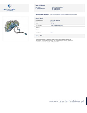 Powered by TCPDF (www.tcpdf.org) Dane kontaktowe Łódź 90-349 ul. Tymienieckiego 22/24 Zobacz produkt na stronie: e-mail: [email protected] tel. +48 42 648 05 60 fax +48 42 648 05 80 https://www.crystalfashion.pl/pl/produkt/49/418/broszka_lamour.html Karta produktu Nazwa produktu: Typ: Cena: BROSZKA LAMOUR Broszki 59.00 zł Kod produktu: TH-11120108316401/BRO Materiał: Kolor: Dostępność: Jest Opis produktu Wielobarwna broszka w odcieniach srebra, zieleni i błękitu idealnie sprawdzi się jako dodatek, zarówno do jednobarwnej, jak i równie kolorowej stylizacji. Doskonały prezent zarówno dla młodej, jak i dla dojrzałej kobiety.