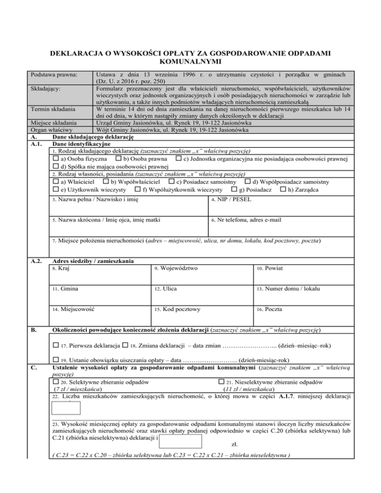 DEKLARACJA O WYSOKOŚCI OPŁATY ZA GOSPODAROWANIE ODPADAMI KOMUNALNYMI Podstawa prawna: Ustawa z dnia 13 września 1996 r. o utrzymaniu czystości i porządku w gminach (Dz. U. z 2016 r. poz. 250) Składający: Formularz przeznaczony jest dla właścicieli nieruchomości, współwłaścicieli, użytkowników wieczystych oraz jednostek organizacyjnych i osób posiadających nieruchomości w zarządzie lub użytkowaniu, a także innych podmiotów władających nieruchomością zamieszkałą Termin składania W terminie 14 dni od dnia zamieszkania na danej nieruchomości pierwszego mieszkańca lub 14 dni od dnia, w którym nastąpiły zmiany danych określonych w deklaracji Miejsce składania Urząd Gminy Jasionówka, ul. Rynek 19, 19-122 Jasionówka Organ właściwy Wójt Gminy Jasionówka, ul. Rynek 19, 19-122 Jasionówka A. Dane składającego deklarację A.1. Dane identyfikacyjne 1. Rodzaj składającego deklarację (zaznaczyć znakiem „x” właściwą pozycję) a) Osoba fizyczna b) Osoba prawna c) Jednostka organizacyjna nie posiadająca osobowości prawnej d) Spółka nie mająca osobowości prawnej 2. Rodzaj własności, posiadania (zaznaczyć znakiem „x” właściwą pozycję) a) Właściciel b) Współwłaściciel c) Posiadacz samoistny d) Współposiadacz samoistny e) Użytkownik wieczysty f) Współużytkownik wieczysty g) Posiadacz h) Zarządca A.2. B. 3. Nazwa pełna / Nazwisko i imię 4. NIP / PESEL 5. Nazwa skrócona / Imię ojca, imię matki 6. Nr telefonu, adres e-mail 7. Miejsce położenia nieruchomości (adres – miejscowość, ulica, nr domu, lokalu, kod pocztowy, poczta) Adres siedziby / zamieszkania 8. Kraj 9. 11. Gmina 12. 14. Miejscowość 15. Województwo 10. Powiat Ulica 13. Numer domu / lokalu Kod pocztowy 16. Poczta Okoliczności powodujące konieczność złożenia deklaracji (zaznaczyć znakiem „x” właściwą pozycję) 17. Pierwsza deklaracja 18. Zmiana deklaracji – data zmian …………………….. (dzień–miesiąc–rok) 19. Ustanie obowiązku uiszczania opłaty – data …………………….. (dzień-miesiąc-rok) C. Ustalenie wysokości opłaty za gospodarowanie odpadami komunalnymi (zaznaczyć znakiem „x” właściwą pozycję) 20. Selektywne zbieranie odpadów 21. Nieselektywne zbieranie odpadów (7 zł / mieszkańca) (11 zł / mieszkańca) 22. Liczba mieszkańców zamieszkujących nieruchomość, o której mowa w części A.1.7. niniejszej deklaracji wynosi: 23. Wysokość miesięcznej opłaty za gospodarowanie odpadami komunalnymi stanowi iloczyn liczby mieszkańców zamieszkujących nieruchomość oraz stawki opłaty podanej odpowiednio w części C.20 (zbiórka selektywna) lub C.21 (zbiórka nieselektywna) deklaracji i wynosi: zł. ( C.23 = C.22 x C.20 – zbiórka selektywna lub C.23 = C.22 x C.21 – zbiórka nieselektywna ) D. Oświadczenie i podpis składającego deklarację / osoby reprezentującej składającego deklarację Oświadczam, że podane przeze mnie dane są zgodne z prawdą. 24. Imię 25. Nazwisko 26. E. Data wypełnienia (dzień–miesiąc-rok) 27. Czytelny podpis (pieczęć) składającego/osoby reprezentującej składającego Adnotacje organu (wypełnia właściwy organ) 28. Uwagi organu Pouczenie: 1. 2. 3. 4. 5. 6. 7. Na podstawie art. 3a ustawy z dnia 17 czerwca 1996 r. o postępowaniu egzekucyjnym w administracji (Dz. U. z 2016 r. poz. 599 ze zm.) niniejsza deklaracja stanowi podstawę do wystawienia tytułu wykonawczego. Opłaty należy uiszczać bez wezwania w terminie do końca stycznia za miesiące styczeń, luty i marzec, do końca kwietnia za miesiące kwiecień, maj i czerwiec, do końca lipca za miesiące lipiec, sierpień i wrzesień, do końca października za miesiące październik, listopad i grudzień, na rachunek w PBS Knyszyn O. Jasionówka Nr 08 8076 0001 0000 1339 2000 0010. W przypadku zmiany danych będących podstawą ustalenia wysokości opłaty za gospodarowanie odpadami komunalnymi należy złożyć do Wójta Gminy nową deklarację w terminie 14 dni od dnia wystąpienia zmiany. Opłatę w nowej wysokości ponosi się począwszy od miesiąca wystąpienia zmian. W razie niezłożenia deklaracji o wysokości opłaty za gospodarowanie odpadami komunalnymi albo uzasadnionych wątpliwości co do danych zawartych w deklaracji, Wójt Gminy Jasionówka określa, w drodze decyzji administracyjnej, wysokość opłaty za gospodarowanie odpadami komunalnymi biorąc pod uwagę uzasadnione szacunki, w tym średnią ilość odpadów komunalnych powstających na nieruchomościach o podobnym charakterze. Deklarację należy złożyć do Urzędu Gminy Jasionówka, ul. Rynek 19, 19-122 Jasionówka osobiście, za pośrednictwem poczty lub środków komunikacji elektronicznej. Jeżeli wskazana w deklaracji liczba osób zamieszkujących nieruchomość różni się od liczby osób zameldowanych należy dołączyć dokumenty wskazane w § 3 uchwały (potwierdzające dane zawarte w deklaracji). Pola jasne wypełnia właściciel nieruchomości. Wypełnić komputerowo lub ręcznie, dużymi, drukowanymi literami, czarnym lub niebieskim kolorem.