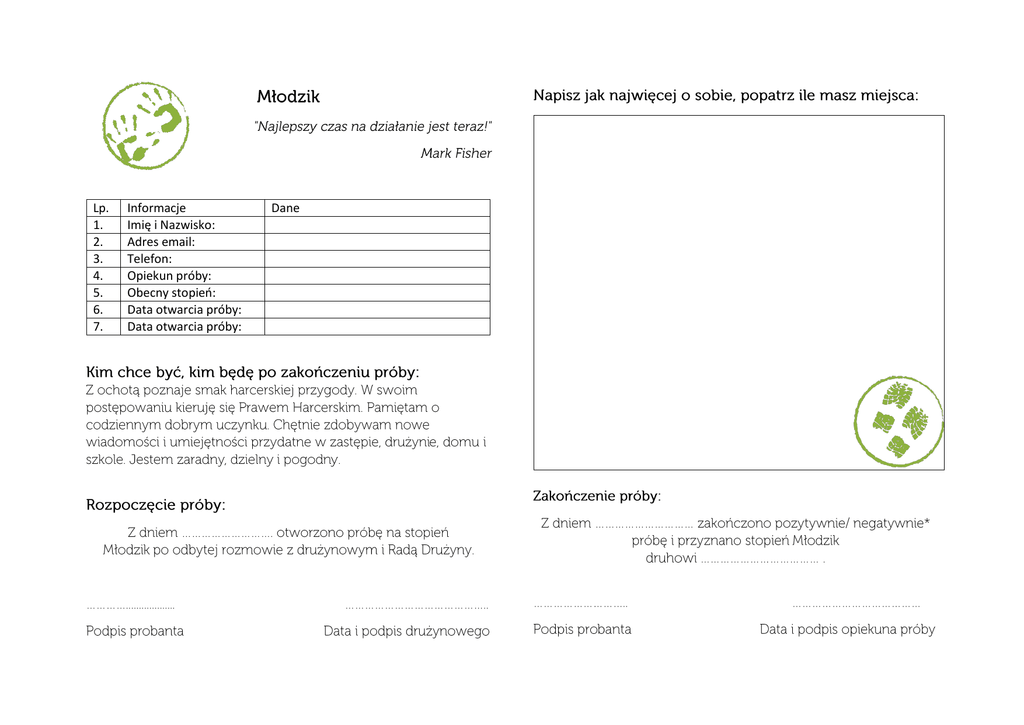 Lp. 1. 2. 3. 4. 5. 6. 7. Informacje Imię i Nazwisko: Adres email: Telefon: Opiekun próby: Obecny stopień: Data otwarcia próby: Data otwarcia próby: Dane