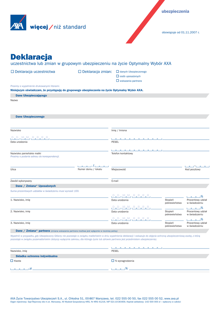 ubezpieczenia obowiązuje od 01.11.2007 r. Deklaracja uczestnictwa lub zmian w grupowym ubezpieczeniu na życie Optymalny Wybór AXA Deklaracja uczestnictwa Deklaracja zmian: danych Ubezpieczonego osób uposażonych wskazania partnera Prosimy o wypełnienie drukowanymi literami. Niniejszym oświadczam, że przystępuję do grupowego ubezpieczenia na życie Optymalny Wybór AXA. Dane Ubezpieczającego Nazwa Dane Ubezpieczonego Nazwisko Imię / Imiona D D M M R R R R Data urodzenia PESEL Nazwisko panieńskie matki Prosimy o podanie adresu do korespondencji. Telefon kontaktowy Numer domu / lokalu Ulica Zawód wykonywany Kod pocztowy Miejscowość E-mail Dane / Zmiana* Uposażonych Suma procentowych udziałów w świadczeniu musi wynosić 100. D D M M R R R R 1. Nazwisko, imię Data urodzenia 2. Nazwisko, imię Data urodzenia 3. Nazwisko, imię Data urodzenia % Stopień pokrewieństwa Procentowy udział w świadczeniu Stopień pokrewieństwa Procentowy udział w świadczeniu Stopień pokrewieństwa Procentowy udział w świadczeniu D D M M R R R R % D D M M R R R R % Dane / Zmiana* partnera (zmiana wskazania partnera możliwa jest wyłącznie w rocznicę polisy) Wypełnić w przypadku, gdy Ubezpieczony Główny nie pozostaje w związku małżeńskim w dniu wypełnienia deklaracji i wskazuje do objęcia ochroną ubezpieczeniową osobę, z którą pozostaje w związku pozamałżeńskim (dotyczy wyłącznie zakresu, dla którego życie lub zdrowie partnera jest przedmiotem ubezpieczenia). Nazwisko, imię PESEL Składka ochronna indywidualna Kwota % wynagrodzenia zł % AXA Życie Towarzystwo Ubezpieczeń S.A., ul. Chłodna 51, 00-867 Warszawa, tel. 022 555 00 50, fax 022 555 00 52, www.axa.pl Organ rejestrowy: Sąd Rejonowy dla m.st. Warszawy, XII Wydział Gospodarczy KRS, Nr KRS 41216, NIP 521-10-36-859, Kapitał zakładowy: 142 500 000 zł – wpłacony w całości Oświadczenia Czy jest Pan(i) ubezpieczony(a) z tytułu umowy grupowego ubezpieczenia na życie lub z tytułu umowy indywidualnej kontynuacji grupowego ubezpieczenia na życie w AXA Życie Towarzystwie Ubezpieczeń S.A.? Nie Tak Oświadczenie I Oświadczam, że zostałem poinformowany o warunkach umowy ubezpieczenia wskazanej w niniejszej deklaracji uczestnictwa, w tym o wysokości sumy ubezpieczenia, i wyrażam zgodę na objęcie mnie ochroną ubezpieczeniową w ramach tej umowy. Wyrażam zgodę na przetwarzanie przez AXA Życie Towarzystwo Ubezpieczeń S.A., z siedzibą w Warszawie przy ul. Chłodnej 51 („Towarzystwo”), moich danych osobowych zawartych w tej deklaracji oraz w innych dokumentach przekazanych Towarzystwu w celach związanych z działalnością ubezpieczeniową Towarzystwa, w tym w celu objęcia mnie ochroną ubezpieczeniową oraz wykonywania zawartej umowy ubezpieczenia grupowego, a ponadto w zakresie przewidzianym w Ustawie z dnia 28 sierpnia 1997 r. o ochronie danych osobowych (Dz.U. z 2002 r. nr 101, poz. 926 z późn. zm.). W przypadku niezawarcia lub wygaśnięcia umowy ubezpieczenia grupowego wyrażam zgodę na przetwarzanie moich danych osobowych przez Towarzystwo do celów archiwalnych. Jestem świadomy(a) dobrowolności udostępniania moich danych. Ponadto przyjmuję do wiadomości, iż mam prawo wglądu do moich danych oraz ich poprawiania. Zgoda na przetwarzanie moich danych osobowych obejmuje także przetwarzanie tych danych w przyszłości, o ile nie zmieni się cel przetwarzania tych danych. Upoważniam Towarzystwo do zasięgania wszelkich informacji medycznych, z wyłączeniem wyników badań genetycznych, dotyczących stanu mojego zdrowia od każdego lekarza, u którego leczyłem(am) się lub zasięgałem(am) porady medycznej, a także we wszystkich placówkach medycznych i zakładach opieki zdrowotnej, które udzielały mi świadczeń zdrowotnych. Równocześnie wyrażam zgodę na udostępnianie Towarzystwu przez lekarzy, placówki medyczne i zakłady opieki zdrowotnej wszelkich informacji o stanie mojego zdrowia, a organy emerytalno-rentowe informacji o rodzaju i zakresie udzielanych świadczeń, o które Towarzystwo będzie zapytywało w związku z zawieraniem lub wykonywaniem umowy ubezpieczenia. Upoważniam Towarzystwo do zasięgania informacji w sądzie, prokuraturze, policji oraz innych organach i instytucjach w związku z wypadkiem lub zdarzeniem będącym podstawą ustalania odpowiedzialności Towarzystwa. Upoważniam Towarzystwo do zasięgania informacji w każdym zakładzie ubezpieczeń, w którym jestem ubezpieczony(a) lub w którym złożony został wniosek o zawarcie umowy ubezpieczenia na moje życie oraz wyrażam zgodę na udzielanie Towarzystwu przez inne zakłady ubezpieczeń wszelkich informacji, w tym informacji medycznych, o które będzie zapytywało. Wyrażam również zgodę na przetwarzanie uzyskanych w ten sposób moich danych osobowych. Upoważnienie pozostaje w mocy także po mojej śmierci. Niniejszym upoważniam Ubezpieczającego do odbierania w moim imieniu wszelkich oświadczeń i informacji, do których przekazywania Ubezpieczonemu zobowiązane jest Towarzystwo w związku z zawarciem, wykonywaniem i zmianą umowy ubezpieczenia zawartej na moją rzecz. D D M M R R R R Miejscowość Data Podpis Ubezpieczonego Oświadczenie II Niniejszym upoważniam Ubezpieczającego do wyrażania w moim imieniu zgody na dokonywanie zmian umowy ubezpieczenia wskazanej w niniejszej deklaracji uczestnictwa, w szczególności w zakresie przedmiotu ubezpieczenia, wysokości składki, sumy ubezpieczenia. D D M M R R R R Miejscowość Data Podpis Ubezpieczonego Oświadczenie dodatkowe Wyrażam zgodę na przetwarzanie moich danych osobowych wskazanych w niniejszej deklaracji przez AXA Życie Towarzystwo Ubezpieczeń S.A. oraz AXA Polska S.A. z siedzibami w Warszawie (00-867) przy ul. Chłodnej 51 w celach marketingowych i statystycznych oraz na udostępnianie tych danych podmiotom Grupy AXA (tj. AXA S.A., spółce prawa francuskiego, z siedzibą w Paryżu (75008), 25, avenue Matignon, Franc