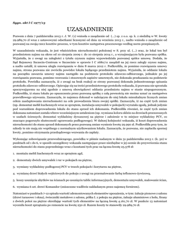 Sygn. akt I C 1977/13 UZASADNIENIE Pozwem z dnia 7 października 2013 r. J. W. (1) wniosła o zasądzenie od (...) sp. z o.o. sp. k. z siedzibą w W. kwoty 29.989,70 zł wraz z ustawowymi odsetkami liczonymi od dnia 19 września 2013 r., nadto wniosła o zasądzenie od pozwanej na swoją rzecz kosztów procesu, w tym kosztów zastępstwa procesowego według norm przepisanych. W uzasadnieniu wskazała, że jest właścicielem nieruchomości położonej w S. przy ul. (...) oraz, że lokal ten był przedmiotem najmu na okres od 10 sierpnia 2009 r. do 10 sierpnia 2014 r., a wynajmującym była pozwana spółka. Wyjaśniła, że z uwagi na zaległości z tytułu czynszu najmu wypowiedziała pozwanej spółce umowę. Dodała, że Sąd Rejonowy Szczecin-Centrum w Szczecinie w sprawie I C 1680/11 zasądził na jej rzecz zaległy czynsz najmu, a nadto ustalił, iż umowa uległa rozwiązaniu w dniu 8 marca 2012 r. Podkreśliła, że pomimo rozwiązania umowy najmu, strona pozwana nie zwróciła powódce lokalu będącego przedmiotem najmu. Wyjaśniła, że oddanie lokalu na początku zawarcia umowy najmu nastąpiło na podstawie protokołu zdawczo-odbiorczego, jednakże po jej rozwiązaniu pozwana, pomimo wezwania i stosownych zapisów umownych, nie dokonała przekazania na podstawie protokołu. Powódka zaznaczyła, iż z uwagi na brak reakcji ze strony pozwanej dokonała jednostronnego spisania protokołu zdawczo-odbiorczego. Opierając się na treści przedmiotowego protokołu wskazała, iż pozwana nie sprostała spoczywającemu na niej zgodnie z umową obowiązkowi oddania przedmiotu najmu w stanie niepogorszonym. Podkreśliła, iż stanu lokalu po opuszczeniu przez pozwaną spółkę z całą pewnością nie można uznać za następstwa prawidłowego używania. Zaznaczyła, że najemca dokonał w należącym do niej lokalu mieszkalnym licznych zmian celem zaadaptowania nieruchomości na cele prowadzenia biura swojej spółki. Zaznaczyła, iż na część tych zmian (np. demontaż mebli kuchennych wraz ze sprzętem, instalacja umywalek w pokojach) wyrażała zgodę, jednak jedynie pod warunkiem doprowadzenia lokalu do stanu sprzed ich dokonania. Podkreśliła również, że część tych zmian dokonana natomiast została wbrew wcześniejszym ustaleniom (np. wymiana koloru oklein na drzwiach przesuwanych w szafach ściennych; demontaż wykładziny dywanowej na piętrze i założenie w to miejsce wykładziny PCV, co znacząco pogorszyło skuteczność ogrzewania podłogowego). W dalszej kolejności wskazała, iż koszt doprowadzenia nieruchomości do stanu sprzed dokonanych przez pozwaną zmian wyniesie kwotę 29.990 zł. Podkreśliła przy tym, że szkody te nie mają nic wspólnego z normalnym użytkowaniem lokalu. Zaznaczyła, że pozwana, nie zapłaciła spornej kwoty, pomimo otrzymania przedsądowego wezwania do zapłaty. Wykonując zobowiązanie przewodniczącego, powódka w piśmie nadanym w dniu 31 października 2013 r. (k. 50) w punktach od 1 do 6, w sposób szczegółowy wskazała następujące prace niezbędne w jej ocenie do przywrócenia stanu nieruchomości do stanu poprzedniego wraz z kosztami tych prac na łączna kwotę 25.578 zł: 1. montażu mebli kuchennych wraz ze sprzętem agd, 2. demontaży dwóch umywalek i rur w pokojach na piętrze, 3. wymiany wykładziny podłogowej PCV w trzech pokojach i korytarzu na piętrze, 4. wymianę drzwi białych wejściowych do pokoju z uwagi na przemalowanie farbą teflonowo-żywicową, 5. koszy usunięcia ubytków na ścianach po usunięciu tablic informacyjnych, demontażu umywalek, malowanie ścian, 6. wymiana 6 szt. drzwi Komandor (zniszczone wadliwie nakładanym przez najemcę fornirem). Natomiast w punktach 7-12 opisała wartość zdemontowanych elementów uposażenia, w tym: żaluzje pionowe z salonu (drzwi tarasowe i okna), świeczniki metalowe z salonu, półka I. z pokoju na piętrze, żaluzje aluminiowe z holu, firany z dwóch pokoi na piętrze określając wartość tych elementów na łączną kwotę 4.161,70 zł. W punkcie 13 natomiast wyceniła koszt sprzątania po remoncie na kwotę 250 zł. Razem koszty te stanowiły 29.989,70 zł. Zarządzeniem z dnia 8 stycznia 2014 r. (k. 61) przewodniczący na podstawie art. 207 § 7 zd. 2 k.p.c. w zw. z art. 207 § 3 k.p.c. zwrócił złożoną przez pozwanego odpowiedź na pozew jako spóźnioną. Na rozprawie w dniu 6 maja 2014 r. pełnomocnik pozwanej wskazał, że powódka nie wykazała wysokości swojego żądania. Dodał, że dowodu takiego nie mogą stanowić wyliczenia kosztów naprawy sporządzone przez powódkę. Nadto, powołując się na art. 677 k.c., podniósł zarzut przedawnienia roszczenia opisanego w punktach 4-13 pisma procesowego powódki z dnia 31.10.2013 r. Zwrócił również uwagę na okoliczność, iż roszczenia opisane przez powódkę w punktach 1-3 tego pisma, to ulepszenia w rozumieniu treści art. 676 k.c., a zatem powódka winna najpierw wezwać pozwaną do przywrócenia lokalu do stanu poprzedniego. Dodał, iż brak reakcji ze strony najemcy umożliwiłby natomiast powódce skorzystanie z wykonania zastępczego, o którym stanowi art. 480 k.c. Na tej samej rozprawie pełnomocnik powódki wskazał, iż brak protokolarnego przekazania uniemożliwia zastosowanie przepisu art. 677 k.c., stąd też w kwestii przedawnienia zastosowanie znajdują ogólne zasady z art. 118 k.c. (trzyletni termin przedawnienia). Podkreślił, iż pozwana nigdy nie dokonała zwrotu nieruchomości na rzecz powódki w rozumieniu art. 677 k.c. Pełnomocnik pozwanej w odpowiedzi na zarzuty powódki, powołując się przy tym na orzecznictwo Sądu Najwyższego wskazał, iż w zaistniałym stanie faktycznym za datę zwrotu należy uznać datę, w której właściciel ponownie objął we władanie rzecz i w żadnym przypadku nie jest to data sporządzenia protokołu zdawczo- odbiorczego. Wskazał, iż w jego ocenie jest to data, która wynika z orzeczenia Sądu Rejonowego Szczecin - Cen