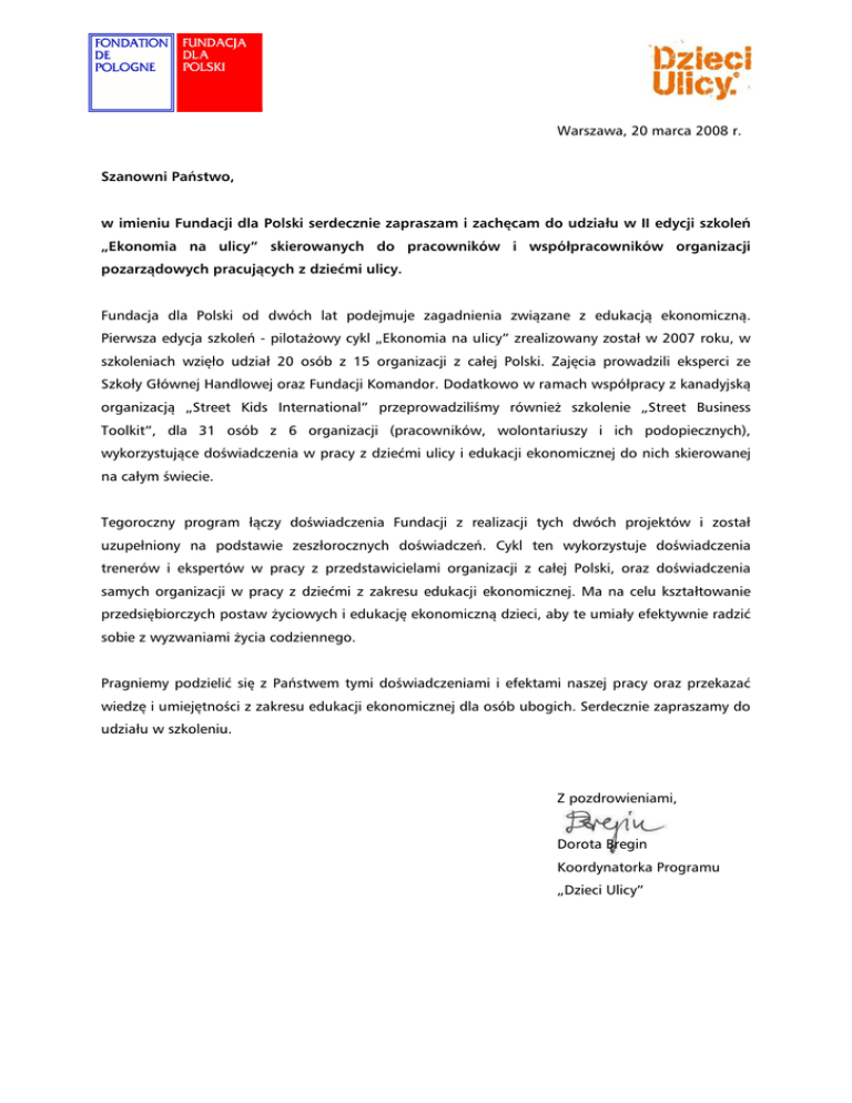 Warszawa, 20 marca 2008 r. Szanowni Państwo, w imieniu Fundacji dla Polski serdecznie zapraszam i zachęcam do udziału w II edycji szkoleń „Ekonomia na ulicy” skierowanych do pracowników i współpracowników organizacji pozarządowych pracujących z dziećmi ulicy. Fundacja dla Polski od dwóch lat podejmuje zagadnienia związane z edukacją ekonomiczną. Pierwsza edycja szkoleń - pilotażowy cykl „Ekonomia na ulicy” zrealizowany został w 2007 roku, w szkoleniach wzięło udział 20 osób z 15 organizacji z całej Polski. Zajęcia prowadzili eksperci ze Szkoły Głównej Handlowej oraz Fundacji Komandor. Dodatkowo w ramach współpracy z kanadyjską organizacją „Street Kids International” przeprowadziliśmy również szkolenie „Street Business Toolkit”, dla 31 osób z 6 organizacji (pracowników, wolontariuszy i ich podopiecznych), wykorzystujące doświadczenia w pracy z dziećmi ulicy i edukacji ekonomicznej do nich skierowanej na całym świecie. Tegoroczny program łączy doświadczenia Fundacji z realizacji tych dwóch projektów i został uzupełniony na podstawie zeszłorocznych doświadczeń. Cykl ten wykorzystuje doświadczenia trenerów i ekspertów w pracy z przedstawicielami organizacji z całej Polski, oraz doświadczenia samych organizacji w pracy z dziećmi z zakresu edukacji ekonomicznej. Ma na celu kształtowanie przedsiębiorczych postaw życiowych i edukację ekonomiczną dzieci, aby te umiały efektywnie radzić sobie z wyzwaniami życia codziennego. Pragniemy podzielić się z Państwem tymi doświadczeniami i efektami naszej pracy oraz przekazać wiedzę i umiejętności z zakresu edukacji ekonomicznej dla osób ubogich. Serdecznie zapraszamy do udziału w szkoleniu. Z pozdrowieniami, Dorota Bregin Koordynatorka Programu „Dzieci Ulicy” EKONOMIA NA ULICY Fundacja dla Polski zaprasza organizacje pozarządowe pracujące z osobami ze środowisk ubogich do udziału w programie szkoleniowym pod nazwą „Ekonomia na ulicy”. Cel szkolenia Celem programu jest promowanie przedsiębiorczych postaw wśród dzieci ulicy poprzez zapoznanie ich z bezpiecznymi i efektywnymi możliwościami zarabiania pieniędzy. Metody pracy Niniejszy program jest odpowiedzią na często obserwowane zjawisko zaangażowania dzieci ulicy w pozyskiwanie pieniędzy na utrzymywanie siebie i swojej rodziny. Program szkolenia koncentruje się na podniesieniu wiedzy i umiejętności z zakresu przedsiębiorczości i ekonomii pracowników i współpracowników organizacji pracujących z dziećmi ulicy w całej Polsce. Uczestnicy poznają narzędzia i metody umożliwiające wspieranie dzieci ulicy w korzystaniu z dostępnych im zasobów, podejmowaniu decyzji dotyczących dalszej edukacji i właściwego gospodarowania pieniędzmi. Program wykorzystuje modelowe rozwiązania edukacyjne, zweryfikowane w pracy z dziećmi ulicy w Polsce i zagranicą. Zajęcia będą prowadzone w oparciu o doświadczenia trenerów i pracowników organizacji znających specyfikę i warunki życia osób niezamożnych. Program angażuje zarówno wychowawców jak i ich podopiecznych, wykorzystując pomysłowość dzieci jak i wiedzę ich opiekunów. Dzięki temu prezentowane metody są dostosowane do indywidualnych potrzeb dzieci ulicy z różnych środowisk. Uczestnicy zostaną przygotowani do wspierania i motywowania dzieci w planowaniu i podejmowaniu coraz większych wyzwań i zobowiązań, a także poszukiwania przez nie swojego sposobu (zgodnego z umiejętnościami i zainteresowaniami) na bezpieczne i legalne zarabianie pieniędzy. Program składa się z pięciu sesji szkoleniowych, które obejmą podstawowe zagadnienia z zakresu ekonomii, rynku pracy, tworzenia indywidualnych projektów z zakresu edukacji ekonomicznej oraz warsztaty „Zarabiam na przyszłość”. „Zarabiam na przyszłość” to cykl zajęć edukacyjnych obejmujący zagadnienia z zakresu określania swoich celów osobistych związanych z zarabianiem pieniędzy, umiejętności rozpoznawania zależności pomiędzy klientami a usługodawcami, przyciąganie klientów i poznanie ich potrzeb, kalkulacja kosztów prowadzenia własnej działalności zarobkowej, pojęcia popytu i konkurencji. Ważną częścią szkolenia będą elementy związane z kreatywnym rozwiązywaniem problemów, zarządzaniem czasem i emocjami. Program zakłada również przygotowanie i wdrożenie projektów edukacji ekonomicznej w organizacjach biorących udział w szkoleniach. Uczestnicy otrzymają wsparcie trenerów i ekspertów, zarówno w przygotowaniu koncepcji projektu jak i jego wdrożeniu i finansowaniu (Fundacja dla Polski przewiduje wsparcie finansowe wdrożenia najlepszych projektów). Uczestnicy Szkolenie jest adresowane do osób pracujących na co dzień z dziećmi ulicy. Uczestnicy otrzymają odpowiednio opracowane materiały i dodatkowe wsparcie w postaci konsultacji w dostosowywaniu metod pracy do możliwości i potrzeb dzieci w ich lokalnych środowiskach. Jednocześnie osoby te będą miały możliwość skorzystania z programu szkoleniowego kształcącego przyszłych trenerów z zakresu edukacji ekonomicznej dla osób ze środowisk ubogich. Do udziału w szkoleniu (moduł: „Zarabiam na przyszłość” 15 – 28 września 2008 r.) zaproszeni będą również podopieczni organizacji pracujących z dziećmi ulicy. Terminy i miejsce szkoleń 12.04.2008 r. moduł: „Podstawy ekonomii”; 25 – 27.05.2008 r. moduły: „Ja na rynku pracy”, „Produkty bankowe”; 27 – 29.06.2008 r. moduły: „Metodyka edukacji ekonomicznej”, „Indywidualne projekty – tworzenie i ewaluacja cz. I”; 22 – 24.08.2008 r. moduł: „Indywidualne projekty – tworzenie i ewaluacja cz. II”; 15 – 28.09.2008 r. moduł „Zarabiam na przyszłość”. Wszystkie szkolenia będą się odbywały w Warszawie i okolicach. Warunki udziału Do udziału w szkoleniu zaproszeni są pracownicy i współpracownicy organizacji pracujących z dziećmi ulicy. W zajęciac