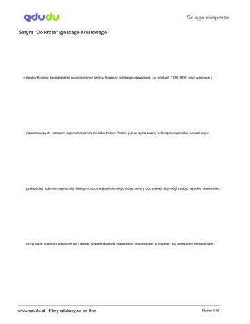 Ściąga eksperta Satyra "Do króla" Ignacego Krasickiego Ignacy Krasicki to najbardziej wszechstronny twórca literatury polskiego oświecenia; żył w latach 1735-1801, czyli w jednym z najciekawszych i zarazem najsmutniejszych okresów historii Polski; już za życia zwany był księciem poetów; urodził się w podupadłej rodzinie magnackiej, dlatego rodzice wybrali dla niego drogę kariery duchownej, aby mógł zdobyć wysokie stanowisko; uczył się w kolegium jezuickim we Lwowie, w seminarium w Warszawie, studiował też w Rzymie; był obdarzony zdolnościami i www.edudu.pl - filmy edukacyjne on-line Strona 1/15 Ściąga eksperta zaletami towarzyskimi, co pozwoliło mu na szybkie zdobycie godności duchownych i świeckich; związał się z królem Stanisławem Augustem Poniatowskim i jego programem reform, wspierał je swoim autorytetem i talentem; pełnił funkcję kapelana królewskiego, został biskupem warmińskim i gnieźnieńskim oraz otrzymał tytuł książęcy; działając jako literat i publicysta redagował „Monitora”, pierwsze nowoczesne czasopismo społeczno-polityczne w Polsce; pisał też do „Zabaw Przyjemnych i Pożytecznych”, www.edudu.pl - filmy edukacyjne on-line Strona 2/15 Ściąga eksperta czasopisma o charakterze literackim Krasicki tworzył w epoce oświecenia, w której możemy dostrzec dwa silne nurty literackie: klasycyzm i sentymentalizm; klasycyzm bazował na założeniach racjonalizmu, a zarazem odwoływał się do antyku; Krasicki jest najwybitniejszym przedstawicielem tego nurtu, charakteryzującego się kultem rozumu; konsekwencją tego kultu była postawa wolnomyślności, niechęć do autorytetów, a nawet więcej – upodobanie w ich ośmieszaniu; utwory Krasickiego są idealną ilustracją takiej www.edudu.pl - filmy edukacyjne on-line Strona 3/15 Ściąga eksperta postawy; przepojone są twórczymi poglądami epoki, głębokim przekonaniem o decydującej roli oświaty i nauki; posługując się dowcipem, drwiną, autor wykpiwał i ośmieszał głupotę, dawne stereotypy społeczne, a chwalił libertynizm, czyli swobodę myślenia i sądzenia; bogata twórczość Krasickiego służyła celom dydaktycznym - wychowawczym i edukacyjnym gatunki literackie, jakie rozwijał, to głównie bajki i satyry, odnowił też poemat heroikomiczny, oraz wprowadził do literatury polskiej nowoczesną powieść; w bajkach osiągnął mistrzostwo; najpierw pisał bajki krótkie, epigramatyczne, a w późniejszym okresie bajki dłuższe, o narracyjnym charakterze, korzystające z wzorów Jeana de La Fontaine’a; w bajkach w humorystyczny sposób www.edudu.pl - filmy edukacyjne on-line Strona 4/15 Ściąga eksperta przedstawiał zawoalowaną prawdę; pod postaciami zwierząt kryły się typy ludzkie z konkretnymi przywarami, wadami, słabościami, które autor bezlitośnie wyśmiewał (Szczur i kot, Ptaszki w klatce, Jagnię i wilcy, Malarze); wszystkie te historie są zarówno zabawne, jak i pouczające, spełniają zasadniczy cel literatury klasycystycznej: bawiąc – uczyć; obraz świata, jaki wyłania się z bajek Krasickiego, nie jest najweselszy; mimo że przedstawiony z humorem, opisuje rzeczywistość opanowaną przez głupotę, www.edudu.pl - filmy edukacyjne on-line Strona 5/15 Ściąga eksperta lenistwo, pychę, nieuczciwość; mimo iż zostały napisane ponad dwieście lat temu, ich tematyka wciąż pozostaje aktualna; nadal, mimo postępu cywilizacji, zmagamy się z tymi samymi słabościami i przywarami ludzkimi; bajki Krasickiego charakter nieprzemijający, uniwersalny poemat heroikomiczny wywodzi się ze starożytności i jest parodią eposu bohaterskiego; łączy patetyczny styl, podniosłą formę z błahą tematyką; zamiast więc opowiadać na przykład o bohaterskich czynach wojowników pod Troją, opowiada tak samo o www.edudu.pl - filmy edukacyjne on-line Strona 6/15 Ściąga eksperta bohaterskiej wojnie, ale na przykład żab z myszami; Krasicki napisał dwa znane do dziś poematy heroikomiczne: Myszeidę , w której przedstawił wojnę myszy z kotami o panowanie w państwie oraz Monachomachię; w Monachomachii zaatakował środowisko zgromadzeń zakonnych – karmelitów i dominikanów, świętych próżniaków; przedstawiając historię wojny zakonników uderza tak naprawdę Krasicki w cały stan duchowny, w dostojników kościelnych; zarzuca im obłudę moralną, działania www.edudu.pl - filmy edukacyjne on-line Strona 7/15 Ściąga eksperta wbrew rozumowi, szerzenie zabobonów i głupoty innym gatunkiem literackim, który bardzo chętnie uprawiał Ignacy Krasicki, była satyra; podobnie jak w bajkach, tak i w satyrach Krasicki ośmiesza i krytykuje ówczesne przywary ludzkie, ułomności charakteru, niedoskonałości rozumu; jedną z najciekawszych satyr jest utwór Do króla; jest to satyra nietypowa przede wszystkim dlatego, że zasadniczo satyra, jako utwór z założenia prześmiewczy, powinna być zatytułowana na, a nie d z satyra dedykacyjną, z liryką zwrotu do adresata; podmiot liryczny www.edudu.pl - filmy edukacyjne on-line Strona 8/15 Ściąga eksperta zwraca się wprost do adresata, czyli króla; ciekawym chwytem jest tutaj również wzięcie w cudzysłów całego monologu – oznacza to, że autor dystansuje się do tej wypowiedzi; jest to przykład tzw. liryki aktora, gdzie Krasicki stwarza postać, ale się z nią nie utożsamia; ciekawa jest również treść tej satyry; pozornie jest ona atakiem na ówczesnego monarchę, Stanisława Augusta Poniatowskiego pod jego adresem wypowiada podmiot liryczny szereg zarzutów, które mają na celu ośmieszenie króla i udowodnienie, że nie nadaje się on na władcę; kiedy jednak przeczytamy wnikliwie owe zarzuty, dostrzegamy ich absurdalność; to nie król ma być tutaj www.edudu.pl - filmy edukacyjne on-line Strona 9/15 Ściąga eksperta ośmieszony, ale właśnie jego przeciwnicy, czyli autorzy owych zarzutów; jakie oskarżenia padają pod adresem króla? król