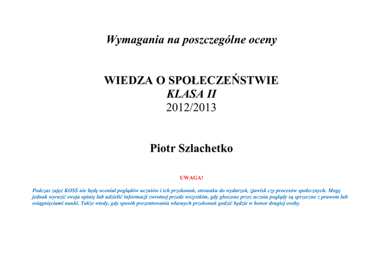 Wymagania na poszczególne oceny WIEDZA O SPOŁECZEŃSTWIE