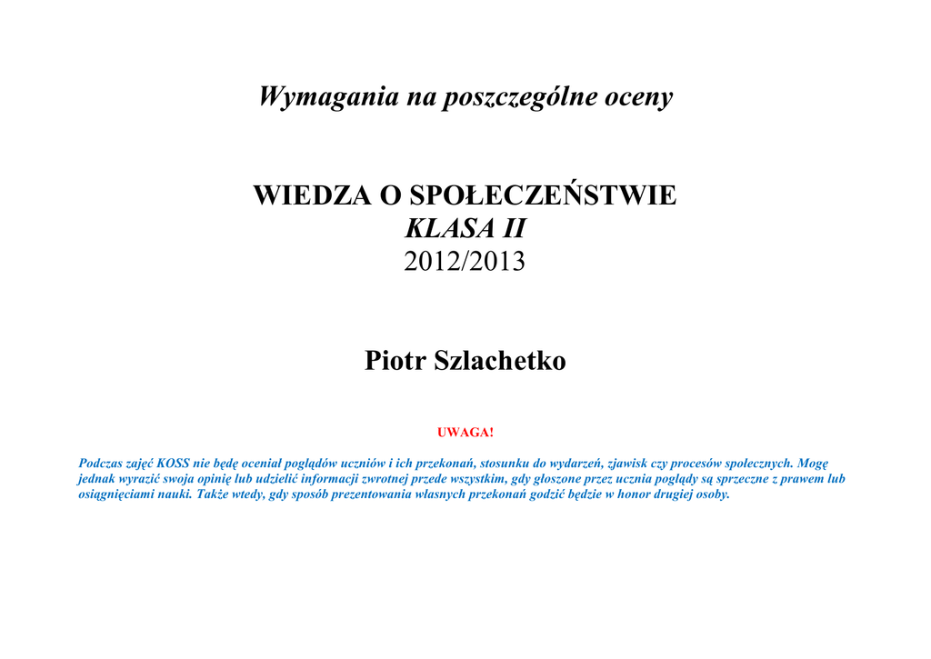 Wymagania na poszczególne oceny WIEDZA O SPOŁECZEŃSTWIE KLASA II 2012/2013 Piotr Szlachetko UWAGA! Podczas zajęć KOSS nie będę oceniał poglądów uczniów i ich przekonań, stosunku do wydarzeń, zjawisk czy procesów społecznych. Mogę jednak wyrazić swoja opinię lub udzielić informacji zwrotnej przede wszystkim, gdy głoszone przez ucznia poglądy są sprzeczne z prawem lub osiągnięciami nauki. Także wtedy, gdy sposób prezentowania własnych przekonań godzić będzie w honor drugiej osoby. Wymagania na ocenę dostateczną i dopuszczającą -potrafi odróżniać fakty od komentarzy Jak zdobywać -wymieni źródła informacji w sprawach informacje i jak publicznych z nich korzystać? -wskazuje źródła informacji w przykładowej sprawie -wskaże w tekście reklamowym elementy perswazyjne i informacje -wyliczy członków społeczności szkolnej Szkoła jako -wie, na czym polega ich odpowiedzialność za wspólnota. funkcjonowanie szkoły -wie, co to jest samorząd uczniowski -zna nazwy dokumentów mówiących o samorządzie szkolnym i wie, gdzie je znaleźć -wie, jak w naszej szkole wybierany jest samorząd szkolny -zna swoje prawa i wie, co zrobić, gdy zostaną one naruszone -opisze proces komunikacji O porozumieniu i nieporozumieniach -zna i stosuje zasady dyskusji -umie sformułować opinię w sprawach publicznych i popiera ja racjonalnymi argumentami -stosuje parafrazę Bez współpracy ani -wskazuje do jakich grup należy i jakie płyną z tego korzyści rusz! -wskazuje typowe role grupowe w swoim Temat Wymagania na ocenę dobrą i bardzo dobrą -wie, jak odróżnić opinie od faktów -umie krytycznie podejść do źródeł informacji w sprawach publicznych -interpretuje zapisy statutu szkoły dotyczące uprawnień samorządu uczniowskiego -oceni przydatność samorządu uczniowskiego do rozwiązywania problemów w naszej szkole -charakteryzuje naszą społeczność szkolną -wyjaśni, na czym polegają prawa, na czym uprawnienia ucznia -powie, dlaczego dana zasada dyskusji jest ważna i jakie są skutki odstąpienia od niej -zna dobre rady dla słuchającego i mówiącego -wie, od czego zależy dobra atmosfera pracy w grupie -na podanych przykładach z życia, literatury Trudne decyzje Negocjacje zamiast kłótni. Człowiek – istota społeczna. Reguły społecznej gry. otoczeniu -umie odpowiednio zareagować, gdy nie aprobuje danych zachowań czy decyzji grupy -rozpoznaje w życiu własnym i w życiu publicznym sytuacje wymagające podjęcia decyzji -zna i stosuje podstawowe sposoby decydowania w sprawach grupy -skutecznie stosuje drzewko decyzyjne -rozpoznaje stanowiska stron konfliktu -wskazuje możliwe rozwiązania konfliktu -odróżnia interesy od stanowisk -zna 3 style zachowania w sytuacji konfliktowej -oceni, czy przyjęte rozwiązanie konfliktu jest dobre -stosuje i zna podstawowe sposoby rozwiązywania konfliktów -wymieni i omówi typy więzi społecznych -wyliczy przykłady zbiorowości, grup, wspólnot -zna definicje zbiorowości, grupy, wspólnoty -wie, do jakich zbiorowości, grup, wspólnot należy -wyjaśni na przykładach, jak rodzą się podziały na „swoich” i „obcych”. -wyjaśni, jakie znaczenie mają wzajemność, zaufanie i tolerancja w relacjach międzyludzkich -wie, co to wzajemność, zaufanie i tolerancja -zna rodzaje i źródła norm itp. wskazuje role grupowe -wie, jak pozyskać sojuszników do swojego przedsięwzięcia -omówi wady i zalety sposobów decydowania w sprawach grupy -oceni ich efektywność -oceni każdy z trzech stylów zachowania w sytuacji konfliktowej -wskazuje możliwe rozwiązania sporów w życiu naszej szkoły -oceni, jaką rolę odgrywają inni ludzie i jakie więzi go z nimi łączą -podając przykłady charakteryzuje style życia rodzinnego -uzasadni, dlaczego rodzina jest ważna -wskazuje sytuacje, w których normy są łamane -opisze skutki takiego łamania norm społecznych Obowiązek i odpowiedzialność. Jak żyją Polacy? Moja gmina i mój samorząd. -określi, jakie normy są odpowiednie w danej sytuacji społecznej -wie, co to są obowiązki i z czego wynikają -zna definicje: rola społeczna, obowiązek, odpowiedzialność -potrafi podać kilka przykładów obowiązków związanych z daną rolą społeczną -wie, co to jest odpowiedzialność i na czym polega -poda możliwe sposoby przeciwstawienia się nietolerancji -umie ocenić zakres obowiązków (za duży?/mały?) w przykładowej sytuacji -umie ocenić zakres odpowiedzialności (za duży?/mały?) w przykładowej sytuacji -poda przykłady obowiązków wynikających z danej roli społecznej. -wyliczy przykłady grup i warstw społecznych -na przykładzie scharakteryzuje wybraną grupę lub warstwę społeczną -rozpozna i zdefiniuje najważniejsze problemy społeczeństwa polskiego -wskaże problemy naszej gminy ważne dla młodych mieszkańców -zaproponuje sposoby rozwiązania tych problemów -zna definicję samorządu -poda przykłady samorządów -wyjaśni, na czym polega zasada decentralizacji i pomocniczości -poda przykłady władz 3 szczebli samorządu -poda podstawowe informacje o gminie -samodzielnie wyszuka i zinterpretuje informacje dotyczące perspektyw życiowych młodych Polaków -scharakteryzuje wskazane warstwy społeczne i style życia, odwołując się do przykładów -porówna zakres działania szczebli samorządów -wie, czym różnią się kompetencje wojewody i samorządu wojewódzkiego -zna główne wydarzenia z historii gminy Jakie są zadania samorządu gminnego? Z wizytą w urzędzie gminy. Kto rządzi w gminie? Różne oblicza państwa. Demokracja – co to takiego? -zlokalizuje gminę na mapie -wie, z czego składa się majątek gminy -wyliczy zadania gminy -wyliczy nazwy instytucji realizujących zadania gminy -powie, czym każda z tych instytucji się zajmuje -zna adresy urzędu gminy i starostwa -wyliczy sprawy, jakie można w nich załatwić -potrafi napisać krótki list lub podanie do urzędu -zna dobre 