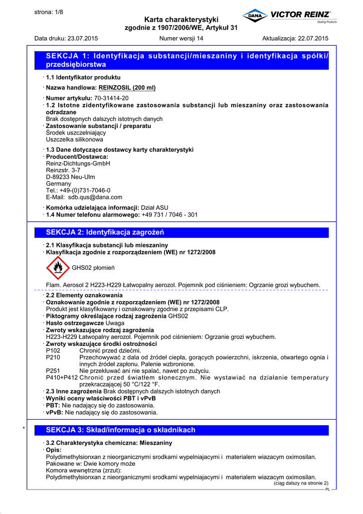 41.1.3 strona: 1/8 Karta charakterystyki zgodnie z 1907/2006/WE, Artykuł 31 Data druku: 23.07.2015 Numer wersji 14 Aktualizacja: 22.07.2015 SEKCJA 1: Identyfikacja substancji/mieszaniny i identyfikacja spółki/ przedsiębiorstwa · 1.1 Identyfikator produktu · Nazwa handlowa: REINZOSIL (200 ml) · Numer artykułu: 70-31414-20 · 1.2 Istotne zidentyfikowane zastosowania substancji lub mieszaniny oraz zastosowania odradzane Brak dostępnych dalszych istotnych danych · Zastosowanie substancji / preparatu Środek uszczelniający Uszczelka silikonowa · 1.3 Dane dotyczące dostawcy karty charakterystyki · Producent/Dostawca: Reinz-Dichtungs-GmbH Reinzstr. 3-7 D-89233 Neu-Ulm Germany Tel.: +49-(0)731-7046-0 E-Mail: [email protected] · Komórka udzielająca informacji: Dział ASU · 1.4 Numer telefonu alarmowego: +49 731 / 7046 - 301 SEKCJA 2: Identyfikacja zagrożeń · 2.1 Klasyfikacja substancji lub mieszaniny · Klasyfikacja zgodnie z rozporządzeniem (WE) nr 1272/2008 GHS02 płomień Flam. Aerosol 2 H223-H229 Łatwopalny aerozol. Pojemnik pod ciśnieniem: Ogrzanie grozi wybuchem. · 2.2 Elementy oznakowania · Oznakowanie zgodnie z rozporządzeniem (WE) nr 1272/2008 Produkt jest klasyfikowany i oznakowany zgodnie z przepisami CLP. · Piktogramy określające rodzaj zagrożenia GHS02 · Hasło ostrzegawcze Uwaga · Zwroty wskazujące rodzaj zagrożenia H223-H229 Łatwopalny aerozol. Pojemnik pod ciśnieniem: Ogrzanie grozi wybuchem. · Zwroty wskazujące środki ostrożności P102 Chronić przed dziećmi. P210 Przechowywać z dala od źródeł ciepła, gorących powierzchni, iskrzenia, otwartego ognia i innych źródeł zapłonu. Palenie wzbronione. P251 Nie przekłuwać ani nie spalać, nawet po zużyciu. P410+P412 Chronić przed światłem słonecznym . Nie wystawiać na działanie temperatury przekraczającej 50 °C/122 °F. · 2.3 Inne zagrożenia Brak dostępnych dalszych istotnych danych · Wyniki oceny właściwości PBT i vPvB · PBT: Nie nadający się do zastosowania. · vPvB: Nie nadający się do zastosowania. * SEKCJA 3: Skład/informacja o składnikach · 3.2 Charakterystyka chemiczna: Mieszaniny · Opis: Polydimethylsionxan z nieorganicznymi srodkami wypelniajacymi i materialem wiazacym oximosilan. Pakowane w: Dwie komory może Komora wewnętrzna (zrzut): Polydimethylsionxan z nieorganicznymi srodkami wypelniajacymi i materialem wiazacym oximosilan. (ciąg dalszy na stronie 2) PL 41.1.3 strona: 2/8 Karta charakterystyki zgodnie z 1907/2006/WE, Artykuł 31 Data druku: 23.07.2015 Numer wersji 14 Aktualizacja: 22.07.2015 Nazwa handlowa: REINZOSIL (200 ml) (ciąg dalszy od strony 1) Komora zewnętrzna: Propanu, butanu, izobutanu ciekłej mieszaniny gazu zgodnie z normą DIN 51622 jako materiał pędny Mieszanka biokatalizatorów z ciekłym gazem napędowym · Składniki niebezpieczne: CAS: 58190-62-8 2-Pentanone, O,O',O''-(ethenylsilylidyne)trioxime 1- <5% Numer WE: 700-810-0 Acute Tox. 4, H302; Eye Irrit. 2, H319; Aquatic Chronic 3, Reg.nr.: 01-2120006148-66-xxxx H412 CAS: 128446-60-6 3-Aminopropyl(methyl)silsesquioxane, ethoxy-terminated 1- <5% Flam. Liq. 3, H226; Skin Irrit. 2, H315; Eye Irrit. 2, H319 · Wskazówki dodatkowe: Podczas utwardzania następujące substancje są tworzone i uwalniane w reakcji z wilgocią zawartą w powietrzu: Pełna treść przytoczonych wskazówek dotyczących zagrożeń znajduje się w rozdziale 16. CAS: 623-40-5 2-Pentanone oxime ELINCS: 484-470-6 Acute Tox. 4, H302; Eye Irrit. 2, H319; Aquatic Chronic 3, H412 Reg.nr.: 01-2119980079-27-xxxx SEKCJA 4: Środki pierwszej pomocy · 4.1 Opis środków pierwszej pomocy · Wskazówki ogólne: Osoby porażone należy wynieść na świeże powietrze. · Po wdychaniu: Dostarczyć świeże powietrze, w razie dolegliwości wezwać lekarza. · Po styczności ze skórą: Usuń ze skóry przy użyciu szmatki lub papieru. Dotkniete miejsce woda z mydlem przemyc. W przypadku trwałego podrażnienia skóry zgłosić się do lekarza. · Po styczności z okiem: Przepłukać oczy z otwartą powieką przez kilka minut pod bieżącą wodą i zasięgnąć porady lekarza. · Po przełknięciu: Przepłukać jamę ustną i obficie popić wodą. Nie powodować wymiotów i sprowadzić lekarza. · 4.2 Najważniejsze ostre i opóźnione objawy oraz skutki narażenia Brak dostępnych dalszych istotnych danych · Wskazówki dla lekarza: Brak dostępnych dalszych istotnych danych · 4.3 Wskazania dotyczące wszelkiej natychmiastowej pomocy lekarskiej i szczególnego postępowania z poszkodowanym Brak dostępnych dalszych istotnych danych SEKCJA 5: Postępowanie w przypadku pożaru · 5.1 Środki gaśnicze · Przydatne środki gaśnicze: Zabiegi gaszenia ognia dostosować do otoczenia. CO2, proszek gaśniczy lub strumień wody. Większy pożar zwalczać strumieniem wody lub pianą odporną na działanie alkoholu. · 5.2 Szczególne zagrożenia związane z substancją lub mieszaniną Brak dostępnych dalszych istotnych danych · 5.3 Informacje dla straży pożarnej · Specjalne wyposażenie ochronne: Nosić urządzenie ochrony dróg oddechowych niezależnie od powietrza otoczenia. SEKCJA 6: Postępowanie w przypadku niezamierzonego uwolnienia do środowiska · 6.1 Indywidualne środki ostrożności, sprzęt ochronny i procedury w sytuacjach awaryjnych Nosić ubranie ochronne. Osoby nie zabezpieczone przenieść w bezpieczne miejsce. Zadbać o wystarczające wietrzenie. (ciąg dalszy na stronie 3) PL 41.1.3 strona: 3/8 Karta charakterystyki zgodnie z 1907/2006/WE, Artykuł 31 Data druku: 23.07.2015 Numer wersji 14 Aktualizacja: 22.07.2015 Nazwa handlowa: REINZOSIL (200 ml) (ciąg dalszy od strony 2) · 6.2 Środki ostrożności w zakresie ochrony środowiska: Szczególne środki nie są konieczne. · 6.3 Metody i materiały zapobiegające rozprzestrzenianiu się skażenia i służące do usuwania skażenia: Zadbać o wystarczające przewietrzenie. Zdjąć mechanicznie. Materiał zebrany usunąć w sposób zgodny z przepisami
