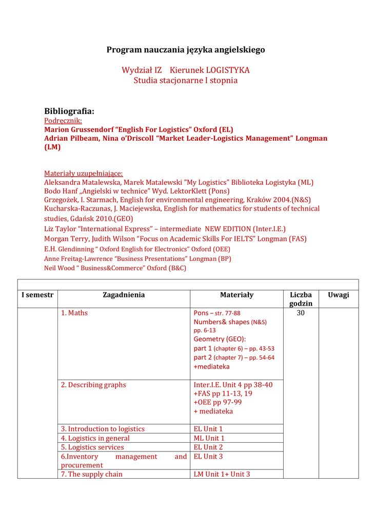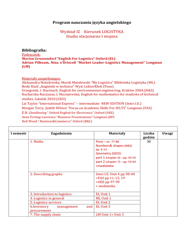 Program nauczania języka angielskiego Wydział IZ Kierunek LOGISTYKA Studia stacjonarne I stopnia Bibliografia: Podręcznik: Marion Grussendorf “English For Logistics” Oxford (EL) Adrian Pilbeam, Nina o’Driscoll “Market Leader-Logistics Management” Longman (LM) Materiały uzupełniające: Aleksandra Matalewska, Marek Matalewski ”My Logistics” Biblioteka Logistyka (ML) Bodo Hanf „Angielski w technice” Wyd. LektorKlett (Pons) Grzegożek, I. Starmach, English for environmental engineering, Kraków 2004.(N&S) Kucharska-Raczunas, J. Maciejewska, English for mathematics for students of technical studies, Gdańsk 2010.(GEO) Liz Taylor “International Express” – intermediate NEW EDITION (Inter.I.E.) Morgan Terry, Judith Wilson “Focus on Academic Skills For IELTS” Longman (FAS) E.H. Glendinning “ Oxford English for Electronics” Oxford (OEE) Anne Freitag-Lawrence “Business Presentations” Longman (BP) Neil Wood “ Business&Commerce” Oxford (B&C) I semestr Zagadnienia 1. Maths Materiały Pons – str. 77-88 Numbers& shapes (N&S) pp. 6-13 Geometry (GEO): part 1 (chapter 6) – pp. 43-53 part 2 (chapter 7) – pp. 54-64 +mediateka 2. Describing graphs 3. Introduction to logistics 4. Logistics in general 5. Logistics services 6.Inventory management procurement 7. The supply chain Inter.I.E. Unit 4 pp 38-40 +FAS pp 11-13, 19 +OEE pp 97-99 + mediateka EL Unit 1 ML Unit 1 EL Unit 2 and EL Unit 3 LM Unit 1+ Unit 3 Liczba godzin 30 Uwagi II semestr Zagadnienia 1.Technical reading 2.Elements of grammar; Questions 3 . Modes of transport 4. Planning and arranging transport 5. Shipping goods 6. Giving talks and presentations 7. Presentations given by students 8. Global sourcing and manufacturing III semestr Zagadnienia 1. Warehousing and storage 2. Documentation and finance 3. EL revision-Interactive whiteboard 4. Transport and distribution 5. Writing a letter of complaint & guided writing 6. Oral exam topics 7. Mock exam Materiały Teacher’s sources Any source EL Unit 4 EL Unit 5 EL Unit 6 Inter.I.E. Unit 7 pp 76-77 +BP (optional) +B&C pp 26-27 Liczba godzin 45 Uwagi Liczba godzin 45 Uwagi LM Unit 7+ Unit 8 Materiały EL Unit 7 EL Unit 8 EL multirom LM Units 10,11,12 Library sources Library resources