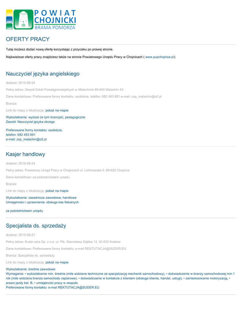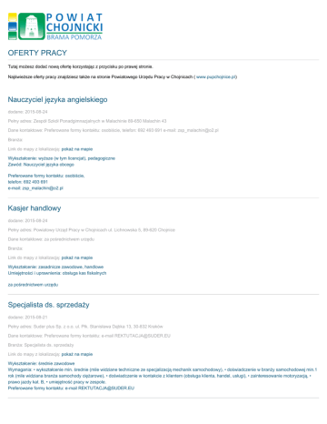 OFERTY PRACY Tutaj możesz dodać nową ofertę korzystając z przycisku po prawej stronie. Najświeższe oferty pracy znajdziesz także na stronie Powiatowego Urzędu Pracy w Chojnicach ( www.pupchojnice.pl) Nauczyciel języka angielskiego dodane: 2015-08-24 Pełny adres: Zespół Szkół Ponadgimnazjalnych w Malachinie 89-650 Malachin 43 Dane kontaktowe: Preferowane formy kontaktu: osobiście, telefon: 692 493 691 e-mail: [email protected] Branża: Link do mapy z lokalizacją: pokaż na mapie Wykształcenie: wyższe (w tym licencjat), pedagogiczne Zawód: Nauczyciel języka obcego Preferowane formy kontaktu: osobiście, telefon: 692 493 691 e-mail: [email protected] Kasjer handlowy dodane: 2015-08-24 Pełny adres: Powiatowy Urząd Pracy w Chojnicach ul. Lichnowska 5, 89-620 Chojnice Dane kontaktowe: za pośrednictwem urzędu Branża: Link do mapy z lokalizacją: pokaż na mapie Wykształcenie: zasadnicze zawodowe, handlowe Umiejętności i uprawnienia: obsługa kas fiskalnych za pośrednictwem urzędu Specjalista ds. sprzedaży dodane: 2015-08-21 Pełny adres: Suder plus Sp. z o.o. ul. Płk. Stanisława Dąbka 13, 30-832 Kraków Dane kontaktowe: Preferowane formy kontaktu: e-mail [email protected] Branża: Specjalista ds. sprzedaży Link do mapy z lokalizacją: pokaż na mapie Wykształcenie: średnie zawodowe Wymagania: • wykształcenie min. średnie (mile widziane techniczne ze specjalizacją mechanik samochodowy), • doświadczenie w branży samochodowej min.1 rok (mile widziana branża samochody ciężarowe), • doświadczenie w kontakcie z klientem (obsługa klienta, handel, usługi), • zainteresowanie motoryzacją, • prawo jazdy kat. B, • umiejętność pracy w zespole. Preferowane formy kontaktu: e-mail [email protected] Kierowca C+E dodane: 2015-08-21 Pełny adres: CENTRALTEX HURTOWNIA ODZIEŻY UŻYWANEJ MARZENA BLANK ul. 18 Pułku Ułanów Pomorskich 8, 89-600 Chojnice Dane kontaktowe: Preferowane formy kontaktu: telefon 603865003 Branża: Link do mapy z lokalizacją: pokaż na mapie Wykształcenie: zasadnicze zawodowe Umiejętności i uprawnienia: prawo jazdy kat. C+E świadectwo kwalifikacji - przewóz rzeczy Preferowane formy kontaktu: telefon 603865003 Płytkarz dodane: 2015-08-21 Pełny adres: "BREVILLA" BOGDAN BREWKA USŁUGI REMONTOWO-BUDOWLANE UL. Pomorska 36, 89-600 Chojnice Dane kontaktowe: Preferowane formy kontaktu: telefon 695944119 Branża: Płytkarz Link do mapy z lokalizacją: pokaż na mapie Wykształcenie: podstawowe Umiejętność układania płytek Preferowane formy kontaktu: telefon 695944119 Pracownik biurowy ze znajomością języka angielskiego dodane: 2015-08-21 Pełny adres: ul. Karasiewicza 5/a, 89-500 Tuchola Dane kontaktowe: Preferowane formy kontaktu: telefon: 601 912 112 e-mail: [email protected] Branża: Link do mapy z lokalizacją: pokaż na mapie Wykształcenie: średnie zawodowe Preferowane formy kontaktu: telefon: 601 912 112 e-mail: [email protected] Sprzedawca - Staż dodane: 2015-08-21 Pełny adres: Powiatowy Urząd Pracy w Chojnicach ul. Lichnowska 5, 89-620 Chojnice Dane kontaktowe: za pośrednictwem urzędu Branża: Link do mapy z lokalizacją: pokaż na mapie Wykształcenie: zasadnicze zawodowe, handlowe za pośrednictwem urzędu Tynkarz dodane: 2015-08-21 Pełny adres: "BREVILLA" BOGDAN BREWKA USŁUGI REMONTOWO-BUDOWLANE ul. Pomorska 36, 89-600 Chojnice Dane kontaktowe: Preferowane formy kontaktu: telefon 695944119 Branża: Link do mapy z lokalizacją: pokaż na mapie Wykształcenie: zasadnicze zawodowe, budowlane Preferowane formy kontaktu: telefon 695944119 Dekarz dodane: 2015-08-21 Pełny adres: "BREVILLA" BOGDAN BREWKA USŁUGI REMONTOWO-BUDOWLANE ul. Pomorska 36, 89-600 Chojnice Dane kontaktowe: Preferowane formy kontaktu: telefon 695 944 119 Branża: Link do mapy z lokalizacją: pokaż na mapie Wykształcenie: zasadnicze zawodowe Preferowane formy kontaktu: telefon 695 944 119 Robotnik budowlany dodane: 2015-08-20 Pełny adres: MAT BUD Mateusz Konik ul. Kościuszki 1A, 89-650 Czersk Dane kontaktowe: Preferowane formy kontaktu: telefon 505 701 012 Branża: Link do mapy z lokalizacją: pokaż na mapie Wykształcenie: brak lub niepełne podstawowe Poziom wykształcenia bez znaczenia, doświadczenie zawodowe mile widziane. Umiejętności: wykonywania prac wykoñczeniowych i elewacyjnych. Praca na terenie Czerska i okolic Preferowane formy kontaktu: telefon 505 701 012 Sprzedawca dodane: 2015-08-20 Pełny adres: Firma Handlowo-Usługowa "SPECJAL" s.c. Andrzej i Grzegorz Żalikowscy ul. Królowej Jadwigi 12A, 89-650 Czersk Dane kontaktowe: Preferowane formy kontaktu: telefon 502 637 980 Branża: Link do mapy z lokalizacją: pokaż na mapie Wykształcenie: zasadnicze zawodowe Mile widziane doświadczenie w zawodzie Preferowane formy kontaktu: telefon 502 637 980 Kierowca samochodu ciężarowego dodane: 2015-08-20 Pełny adres: "BABIÑSKI" Babiñski Krzysztof Kęsza 7, 89-652 Kęsza Dane kontaktowe: Preferowane formy kontaktu: telefon 523954550 Branża: Link do mapy z lokalizacją: pokaż na mapie Wykształcenie: brak lub niepełne podstawowe Znajomość języków: ukraiñski, w mowie - biegły, w piśmie - biegły Umiejętności i uprawnienia: świadectwo kwalifikacji - przewóz rzeczy, prawo jazdy kat. C+E Preferowane formy kontaktu: telefon 523954550 Specjalista ds. transportu i zaopatrzenia dodane: 2015-08-19 Pełny adres: Spółdzielcza Mleczarnia SPOMLEK Gen. Franciszka Kleeberga 12, 21-300 Radzyñ Podlaski Dane kontaktowe: Preferowane formy kontaktu: e-mail: [email protected] Branża: Link do mapy z lokalizacją: pokaż na mapie Wykształcenie: wyższe (w tym licencjat), techniczne Wprowadzanie danych dot. transportu i zaopatrzenia. Wystawianie faktur. Preferowane formy kontaktu: e-mail: [email protected] Kierowca w transporcie międzynarodowym dodane: 2015-08-18 Pełny adres: Przedsiębiorstwo Produkcyjno-Usługowe KARO Wojciech Megier 77-130 Sątoczno 9 Dane kontaktowe: tel: 504 284 181 Branża: Link do mapy z lokaliza
