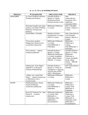 K A L E N D A R ZIMPREZW2015r. MIESIĄC STYCZEŃ LUTY WYDARZENIE 23.Finał Wielkiej Orkiestry Świątecznej Pomocy ORGANIZATOR Ośrodek Kultury i Sportu w Leśnej, Ochotnicza Straż Pożarna Gminy Leśna Kiermasz książki używanej podczas 23.Finału Wielkiej Orkiestry Świątecznej Pomocy Dzień Babci i Dziadka Biblioteka Publiczna w Leśnej 70.rocznica urodzin Małgorzaty Musierowicz – wystawka tematyczna Biblioteka Publiczna w Leśnej, Filia Biblioteki w Pobiednej Ferie zimowe – zajęcia interdyscyplinarne Ośrodek Kultury i Sportu w Leśnej, Biblioteka Publiczna w Leśnej, kompleks boisk „Moje boisko – ORLIK” w Leśnej Edukacyjny Teatr Magii – spektakl w wykonaniu Łukasza Podymskiego Ośrodek Kultury i Sportu w Leśnej we współpracy z Agencją Artystyczną JAMAART z Wrocławia Biblioteka Publiczna w Leśnej „Zabaw się z nami Pani Zimo” – zajęcia tematyczne w Bibliotece wraz z wystawą prac Międzynarodowy Dzień Języka Polskiego – wystawka tematyczna Rok 2015 Rokiem Św. Jana Pawła II – wystawa tematyczna Miejsko-Gminne Przedszkole w Leśnej, OKiS w Leśnej Biblioteka Publiczna w Leśnej, Filia Biblioteki w Pobiednej Biblioteka Publiczna w Leśnej, Filia Biblioteki w Pobiednej, Filia Biblioteki w Kościelnikach MIEJSCE Sala widowiskowa, kawiarnia, hol i najbliższe otoczenie OKiS Hol w Ośrodku Kultury i Sportu w Leśnej Sala widowiskowa i hol Ośrodka Kultury iSportu w Leśnej Biblioteka Publiczna w Leśnej, Filia Biblioteki w Pobiednej Ośrodek Kultury i Sportu w Leśnej, Biblioteka Publiczna w Leśnej, kompleks boisk „Moje boisko – ORLIK” w Leśnej Sala widowiskowa Ośrodka Biblioteka Publiczna w Leśnej Biblioteka Publiczna w Leśnej, Filia Biblioteki w Pobiednej Biblioteka Publiczna w Leśnej, Filia Biblioteki w Pobiednej, Filia Biblioteki w Kościelnikach „Czytelnik Roku” – ogłoszenie konkursu bibliotecznego dla czytelników Biblioteka Publiczna w Leśnej, Filia Biblioteki w Pobiednej Karnawał w Klubie Seniora Klub Seniora, Ośrodek Kultury i Sportu w Leśnej Biblioteka Publiczna w Leśnej, Filia Biblioteki w Kościelnikach 95.rocznica urodzin Danuty Gellnerowej – wystawka tematyczna MARZEC 30.rocznica śmierci Arkadego Fiedlera – wystawka tematyczna Biblioteka Publiczna w Leśnej, Filia Biblioteki w Kościelnikach Dzień Kobiet – wieczór artystyczny Ośrodek Kultury i Sportu w Leśnej, Biblioteka Publiczna w Leśnej, Urząd Miejski w Leśnej Biblioteka Publiczna w Leśnej, Filia Biblioteki w Pobiednej Ośrodek Kultury i Sportu w Leśnej Biblioteka Publiczna w Leśnej, Filia Biblioteki w Kościelnikach Biblioteka Publiczna w Leśnej, Filia Biblioteki w Kościelnikach Sala widowiskowa Ośrodka Kultury i Sportu w Leśnej Dzień Sołtysa 75.rocznica śmierci Michaiła Bułhakowa – gazetka tematyczna Biblioteka Publiczna w Leśnej, Filia Biblioteki w Pobiednej „Kartka wielkanocna” konkurs plastyczny dla szkół podstawowych 110.rocznica śmierci Jules`a Verne – wystawka tematyczna Ośrodek Kultury i Sportu w Leśnej „Bigos literacki” – konkurs biblioteczny dla dzieci szkół podstawowych Biblioteka Publiczna w Leśnej, Filia Biblioteki w Pobiednej Kiermasz Wielkanocny Ośrodek Kultury i Sportu w Leśnej, Biblioteka Publiczna w Leśnej Ośrodek Kultury i Sportu w Leśnej, Biblioteka Publiczna Warsztaty inspiracji świątecznych dla rodzin Biblioteka Publiczna w Leśnej, Filia Biblioteki w Kościelnikach Biblioteka Publiczna w Leśnej, Filia Biblioteki w Pobiednej Ośrodek Kultury i Sportu w Leśnej Biblioteka Publiczna w Leśnej, Filia Biblioteki w Kościelnikach Biblioteka Publiczna w Leśnej, Filia Biblioteki w Pobiednej Ośrodek Kultury i Sportu w Leśnej Ośrodek Kultury i Sportu w Leśnej KWIECIEŃ MAJ Turniej tenisa stołowego Oldboy`ów 20.rocznica śmierci Hanny Ożogowskiej – wystawka tematyczna w Leśnej Ośrodek Kultury i Sportu w Leśnej Biblioteka Publiczna w Leśnej, Filia Biblioteki w Pobiednej 10.rocznica śmierci Papieża Jana Pawła II – wystawka tematyczna Biblioteka Publiczna w Leśnej, Filia Biblioteki w Kościelnikach Rozstrzygnięcie konkursu plastycznego dla szkół podstawowych na „Kartkę Wielkanocną” 110.rocznica śmierci Hanny Januszewskiej – wystawka tematyczna Ośrodek Kultury i Sportu w Leśnej Niesamowity świat bajek Hanny Januszewskiej – konkurs plastyczny Biblioteka Publiczna w Leśnej, Filia Biblioteki w Kościelnikach Warsztaty inspiracji wiosennych „Wiosenne kwiaty z bibuły” Ośrodek Kultury i Sportu w Leśnej, Biblioteka Publiczna w Leśnej Ośrodek Kultury i Sportu w Leśnej, animator sportu na kompleksie boisk Orlik Urząd Miejski w Leśnej, Ośrodek Kultury i Sportu w Leśnej, Biblioteka Publiczna w Leśnej Biblioteka Publiczna w Leśnej Football`owy 1 Maj – Otwarty Turniej Piłki Nożnej o Wiosenny Puchar Orlika 224.rocznica uchwalenia Konstytucji 3 Maja – uroczystość państwowa wraz z imprezą okolicznościową Wystawa z okazji Uchwalenia Konstytucji 3 Maja Biblioteka Publiczna w Leśnej, Filia Biblioteki w Kościelnikach Ośrodek Kultury i Sportu w Leśnej Biblioteka Publiczna w Leśnej, Filia Biblioteki w Pobiednej Biblioteka Publiczna w Leśnej, Filia Biblioteki w Kościelnikach Ośrodek Kultury i Sportu w Leśnej Biblioteka Publiczna w Leśnej, Filia Biblioteki w Kościelnikach Biblioteka Publiczna w Leśnej, Filia Biblioteki w Kościelnikach Ośrodek Kultury i Sportu w Leśnej Kompleks boisk „Moje boisko – Orlik 2012” Sala widowiskowa Ośrodka Kultury i Sportu w Leśnej Biblioteka Publiczna w Leśnej, Filia Biblioteki w Kościelnikach Dzień Bibliotekarza Dzień Pracownika Gospodarki Komunalnej Przegląd Dorobku Miejski Dom Kultury Miejski Dom Artystycznego Seniorów – udział Leśniańskiego Klubu Seniora na Przeglądzie w Lubaniu Biblioteka XXI wieku – konkurs plastyczny dla dzieci w Leśnej Kultury w Leśnej Biblioteka Publiczna w Leśnej, Filia Biblioteki w Pobiednej Biblioteka Publiczna w Leśnej, Filia Biblioteki w Pobiednej Dzień